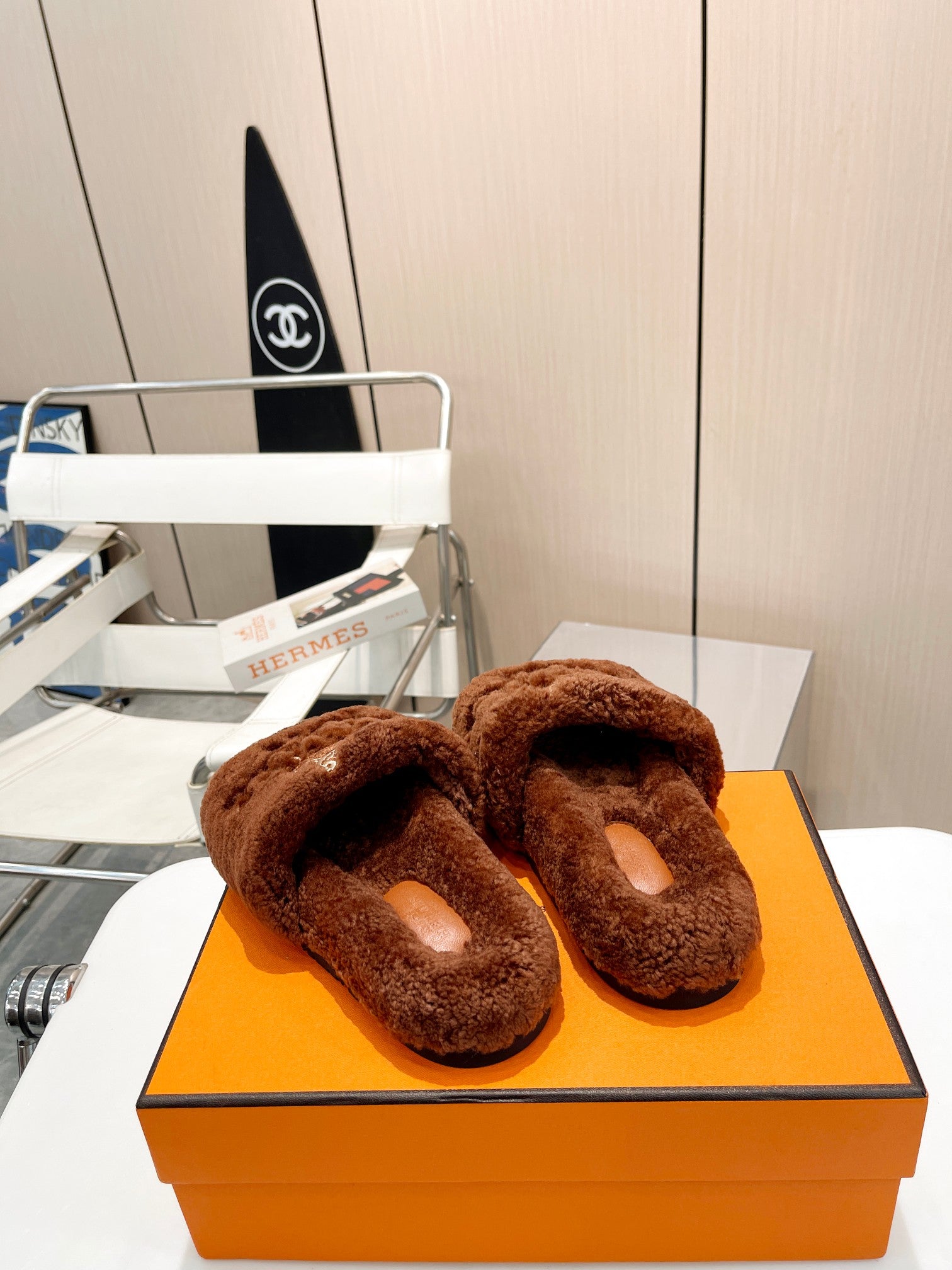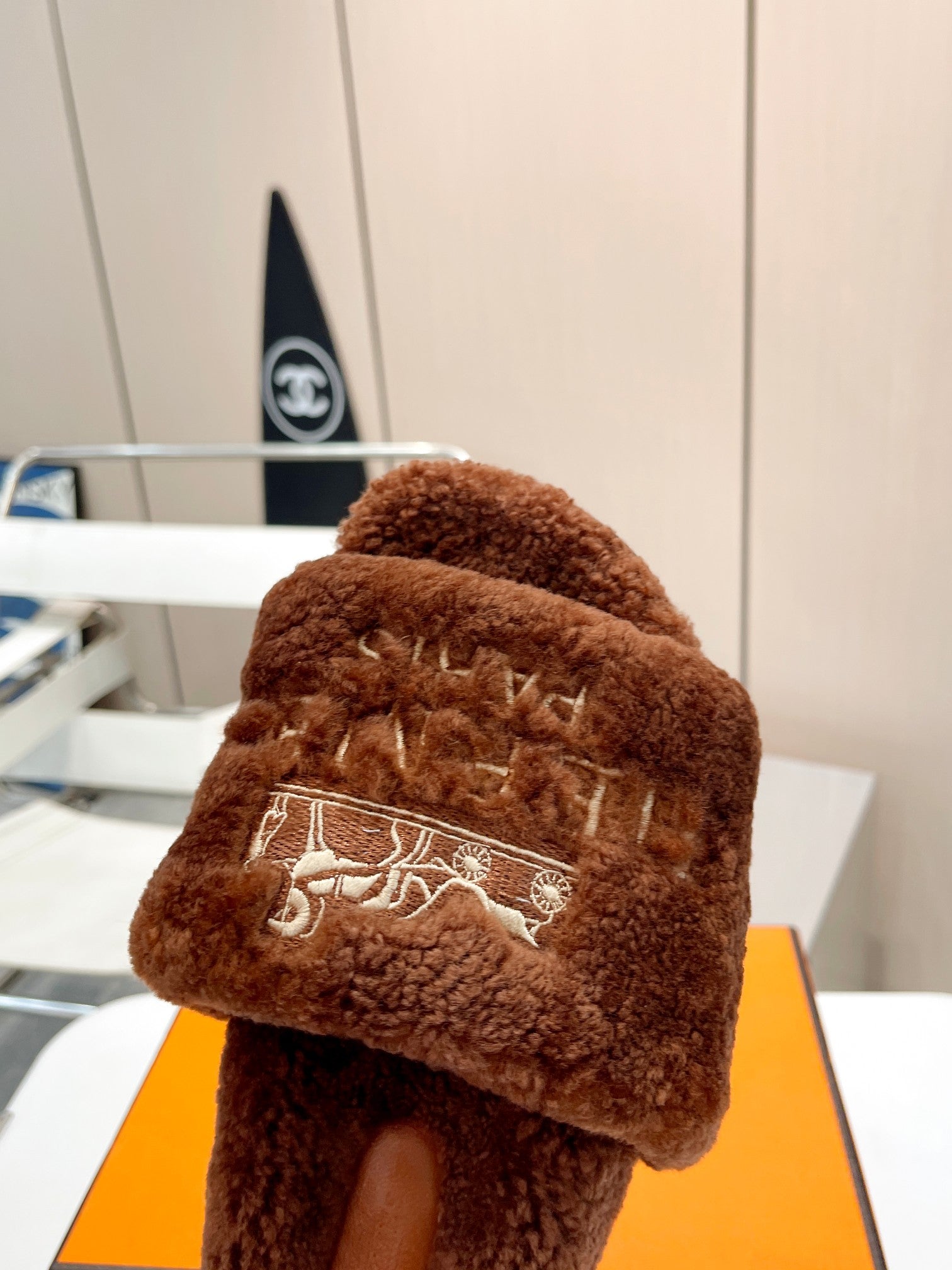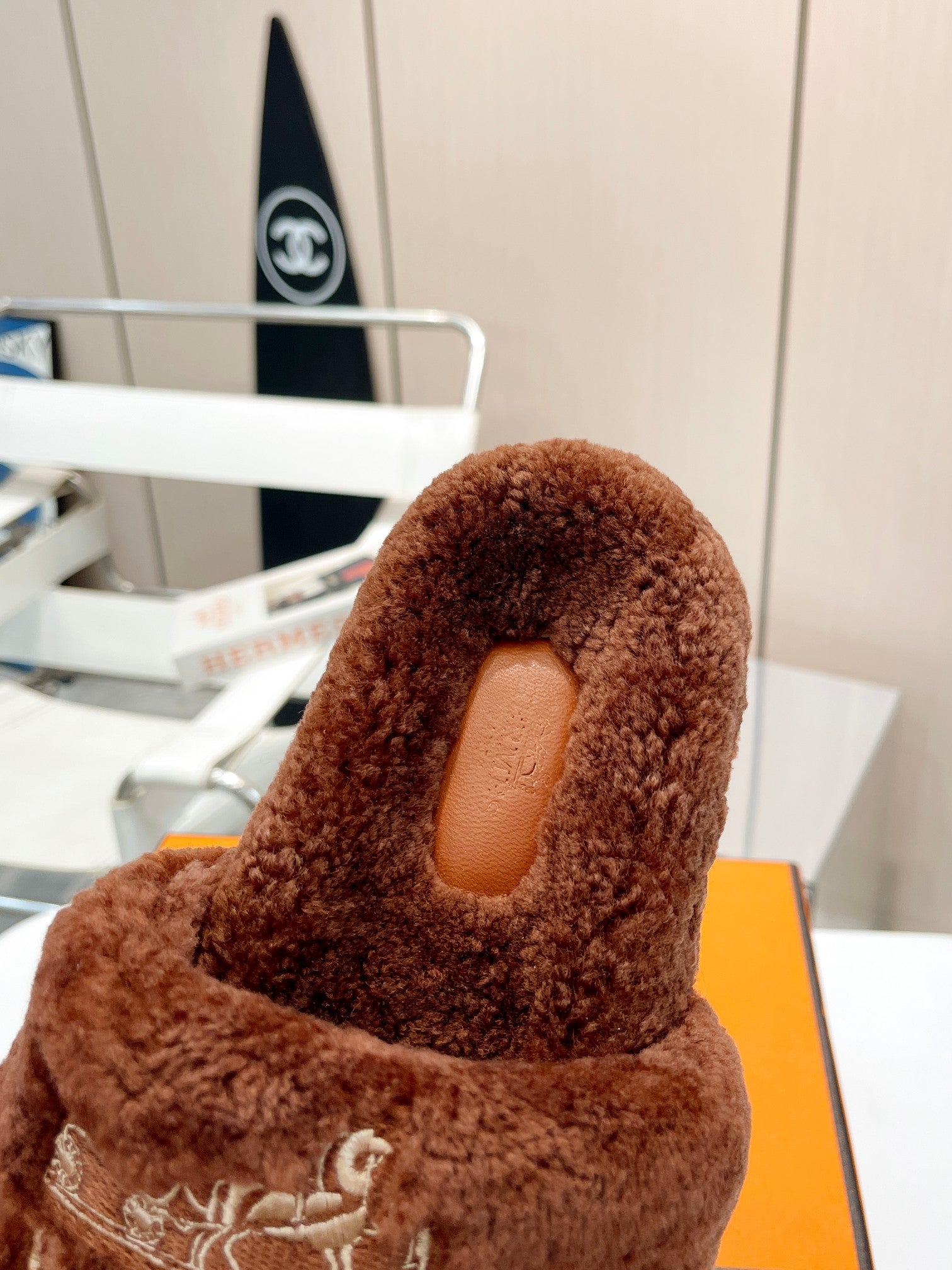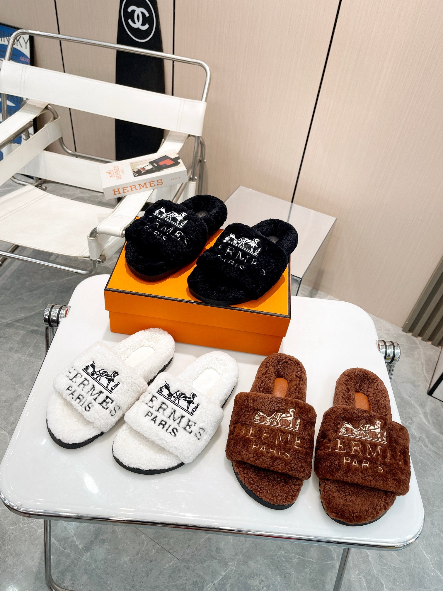2023 Hermès Embroidered Lamb Wool Slippers for Couples