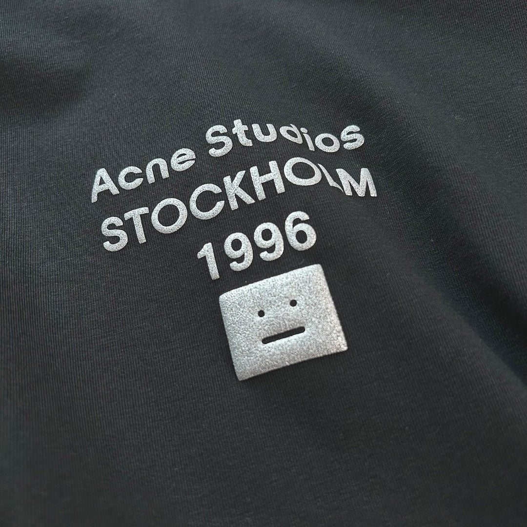 Elevate your wardrobe with the Acne Studios Early Autumn 25SS Round Neck Short-Sleeved T-Shirt. This stylish tee features a playful silver smiley face print that adds a touch of fun to any outfit. Crafted from Solona's custom threads, the fabric is wonderfully soft, highly breathable, and designed for ultimate comfort. It maintains its crisp shape even after prolonged wear and multiple washes, ensuring you look stylish every time.