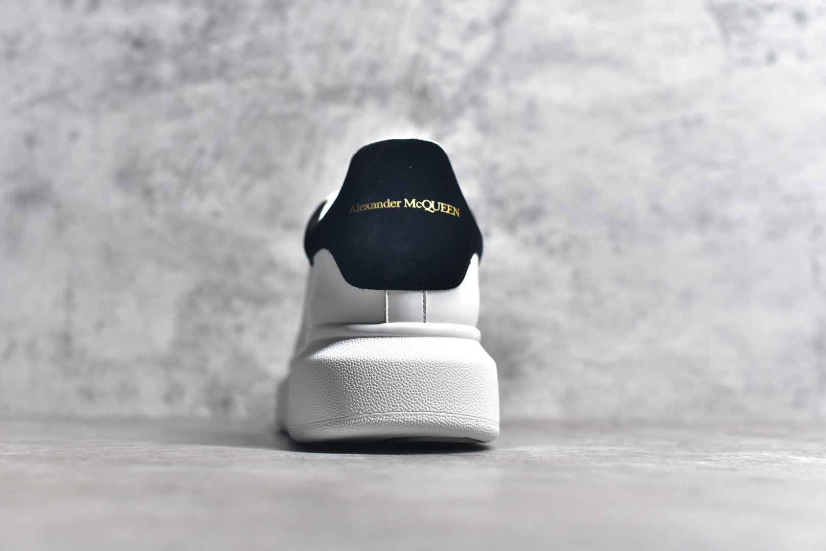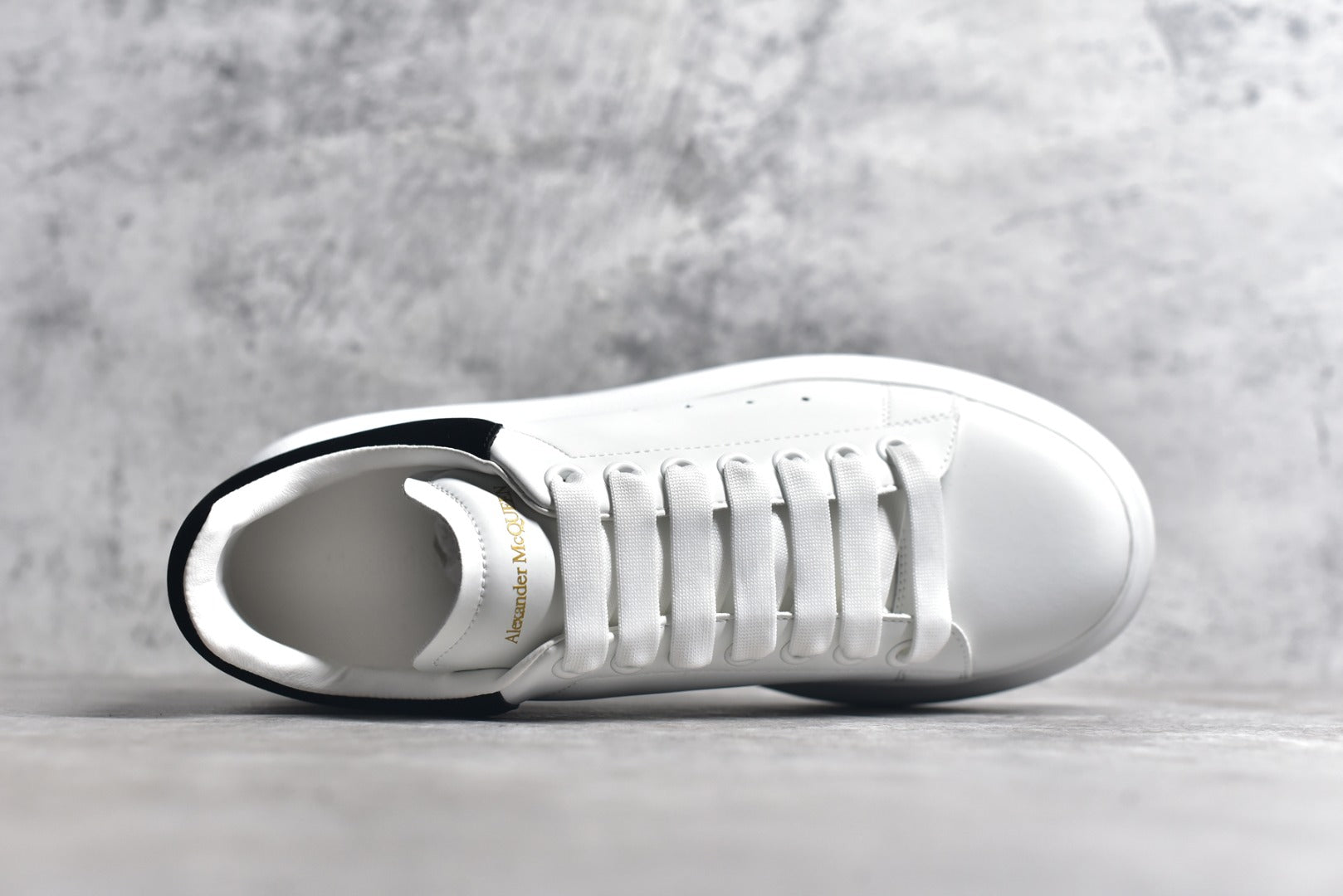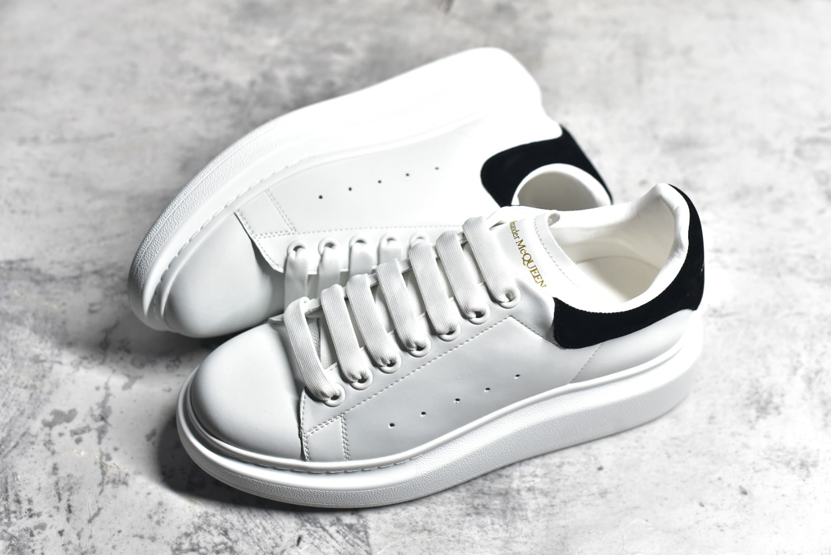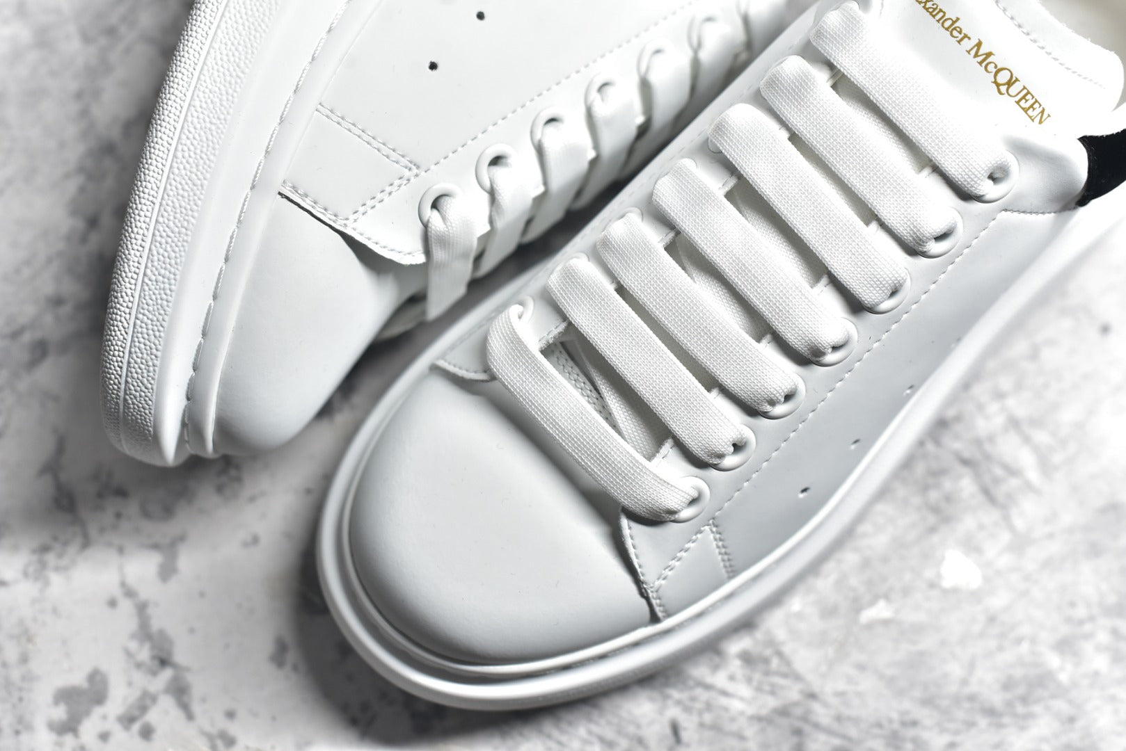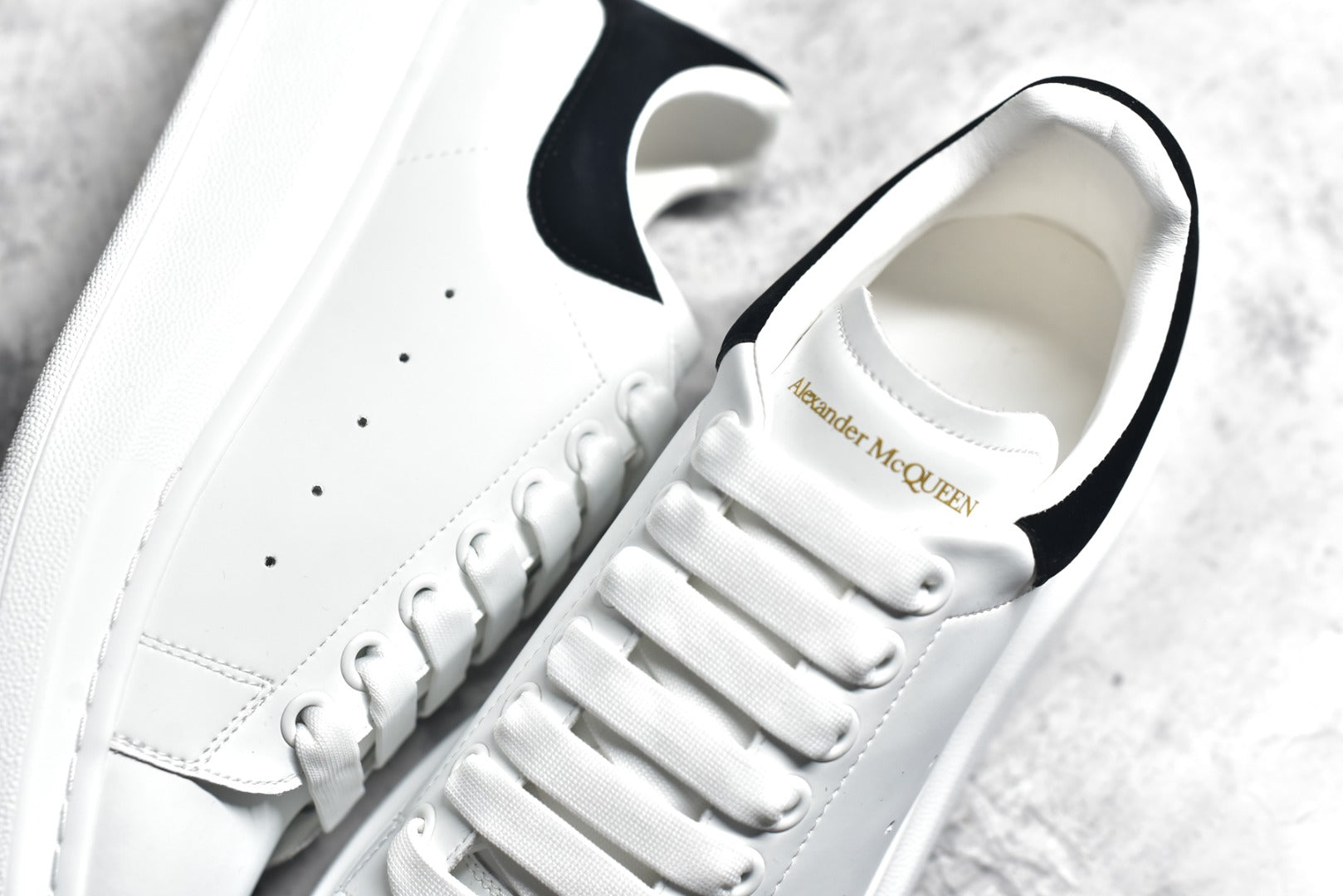 Designed with a sleek white exterior, the sneakers boast a round toe silhouette, black suede detailing on the heel, and wide flat laces adorned with the iconic Alexander McQueen branding on both the tongue and back. The robust rubber sole provides added height and durability, while an additional pair of laces offers versatility in styling.