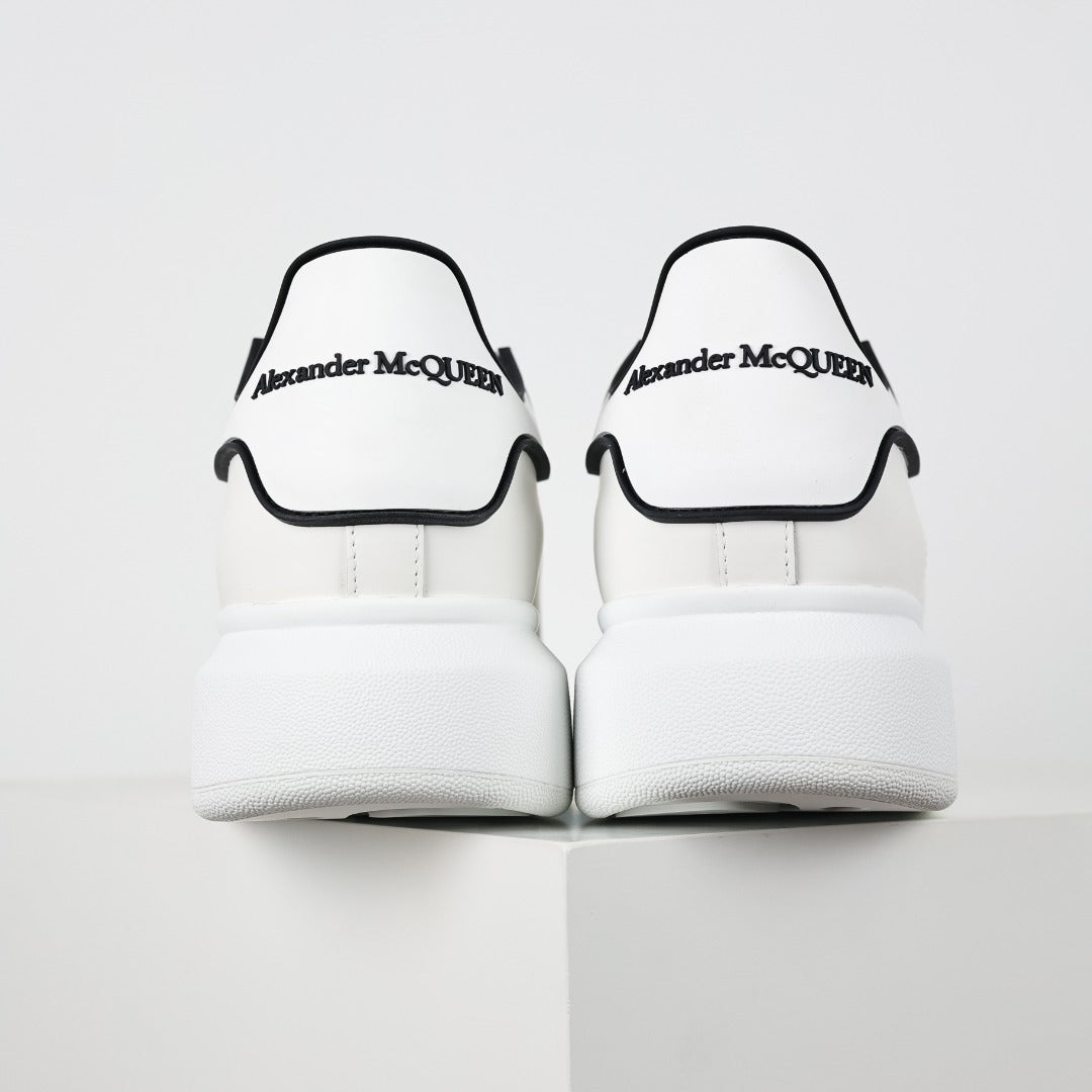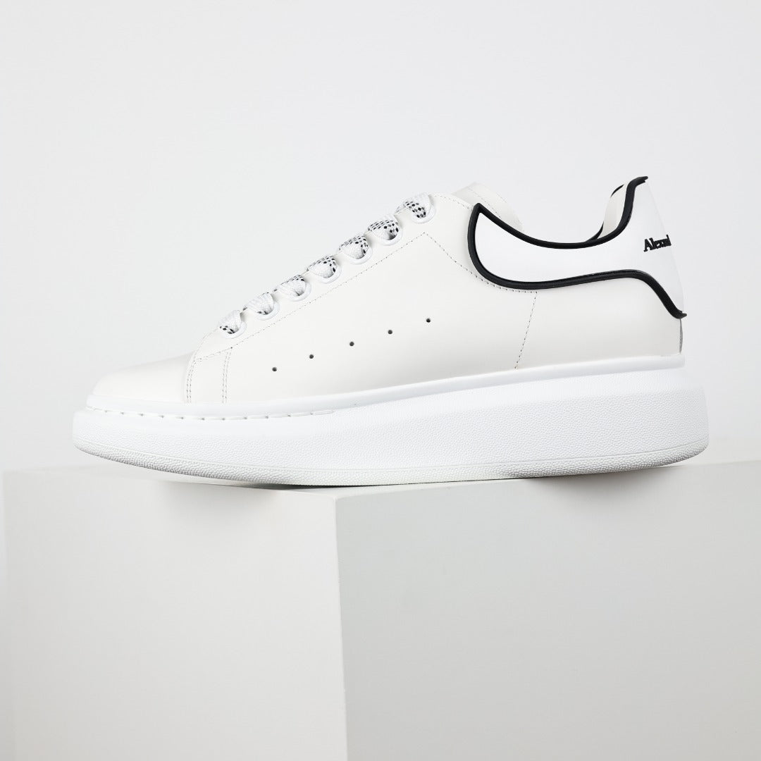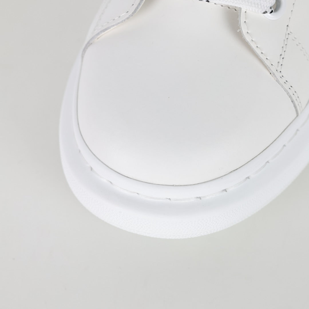 Featuring a super soft lambskin lining and breathable PU latex material, they provide ultimate comfort for all-day wear. The white smooth calfskin upper is complemented by black suede detailing at the heel, wide flat laces, and the iconic Alexander McQueen branding on the tongue and back.