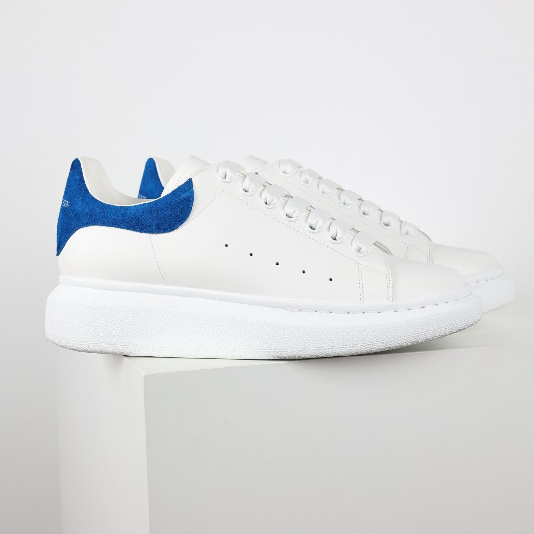With a sleek white smooth calfskin exterior, these lace-up sneakers are finished with chic black suede accents on the heel. The wide flat laces contribute to a secure fit, complemented by the iconic Alexander McQueen branding on the tongue and back. Each pair also includes an additional pair of white laces for versatility.