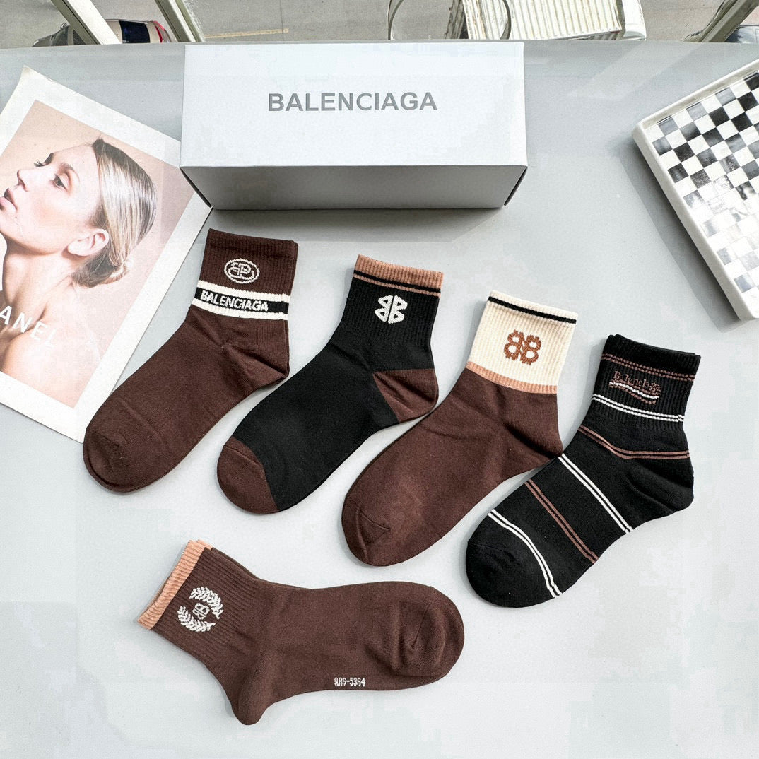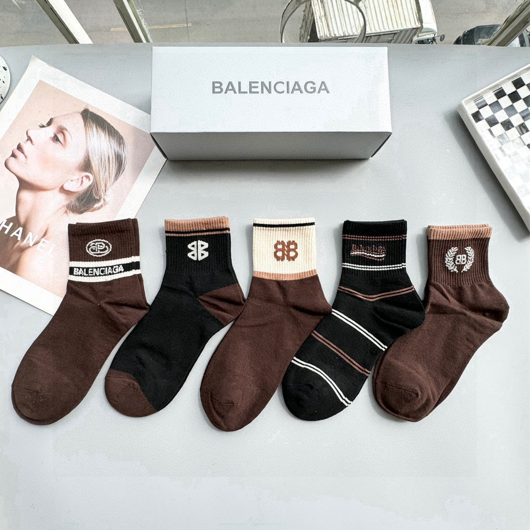 Elevate your wardrobe with the Balenciaga High-Quality Mid-Calf Socks. Each box contains five stylish pairs, designed for both men and women, making them a versatile addition to any fashionista's collection. Crafted from premium materials, these mid-calf socks are not only comfortable but also showcase a chic aesthetic that complements any outfit. Whether dressing up or down, these fashionable socks are a must-have for those who appreciate high style. Don’t miss out on this essential accessory for your everyday looks!