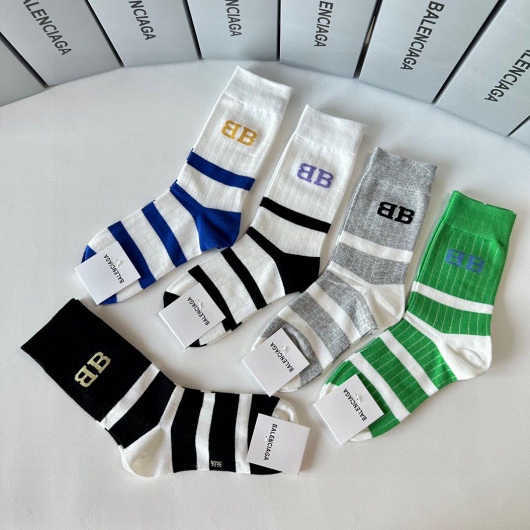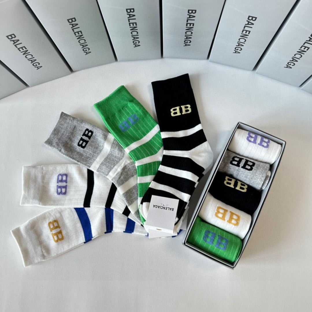 Elevate your sock collection with Balenciaga's new mid-length pile socks, now available in a convenient 5-pair box. These stylish tube socks feature a synchronized design for easy mixing and matching, making them a must-have accessory for any fashion-forward wardrobe. With their luxurious feel and trendy appeal, these socks are perfect for elevating your everyday style. Don’t miss out on this essential accessory that merges comfort with high-fashion!