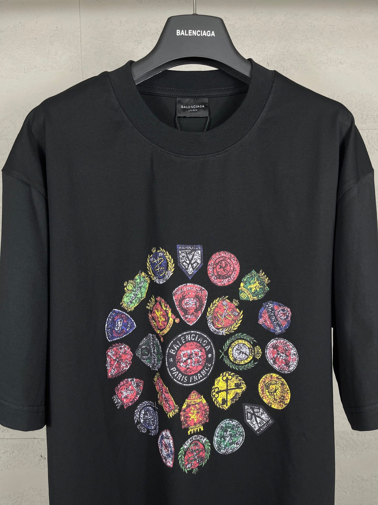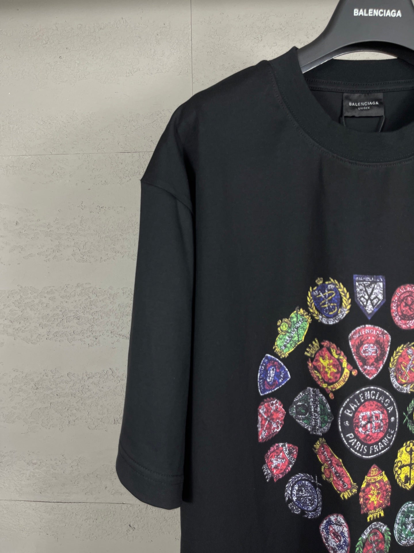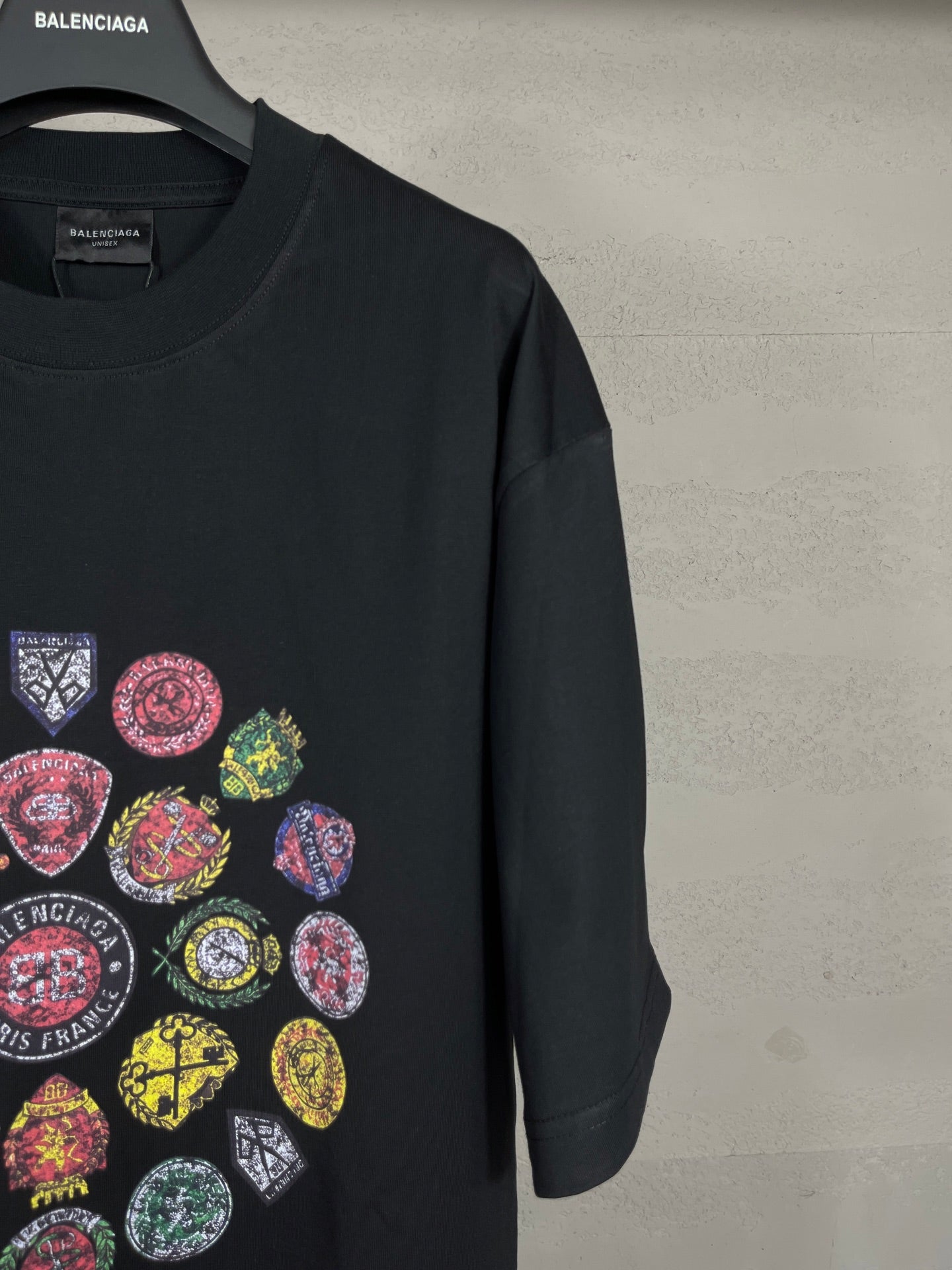 Elevate your wardrobe with the Balenciaga Paris SS25 Iconic Logo T-Shirt. This premium short-sleeved tee features a striking front badge icon and a statement logo, direct-printed for a crisp, three-dimensional effect. Crafted from custom-woven, dyed cotton double yarn in Paris, the fabric is soft, breathable, and weighs 260 grams, ensuring both comfort and durability.