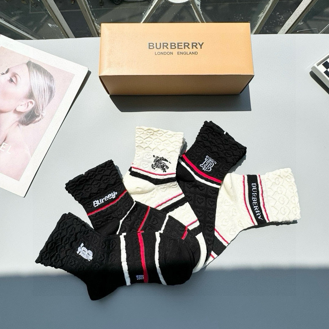 Elevate your wardrobe with Burberry's latest Bagh mid-calf socks, featuring five pairs elegantly packaged in a box. These stylish socks showcase a blend of vibrant colors and contemporary design, perfect for fashion enthusiasts and influencers alike. With their high-end appeal, they are easy to match with any outfit, making them a must-have accessory for your collection. Experience the luxury and trendsetting essence of Burberry with these popular socks that redefine everyday fashion.