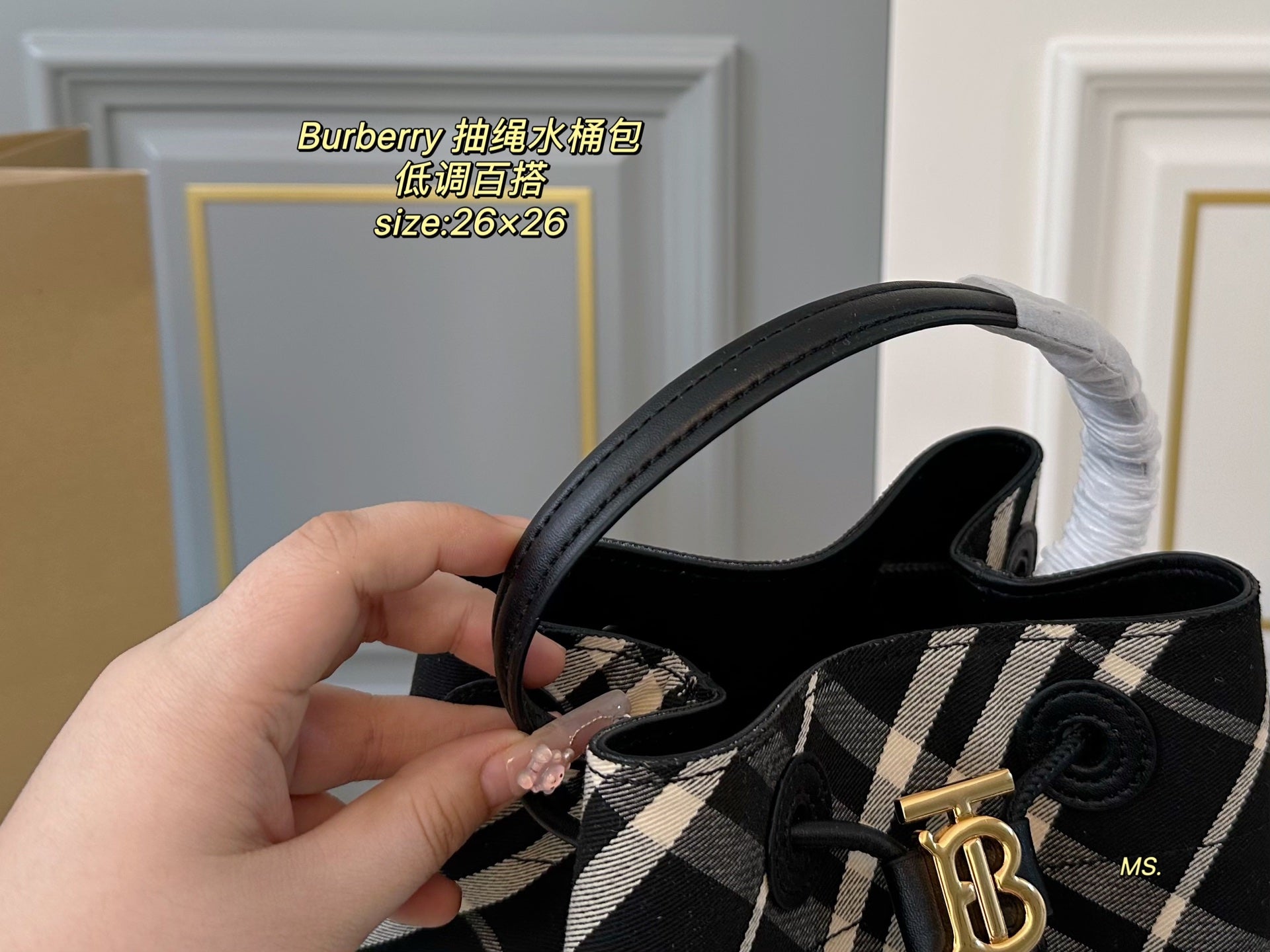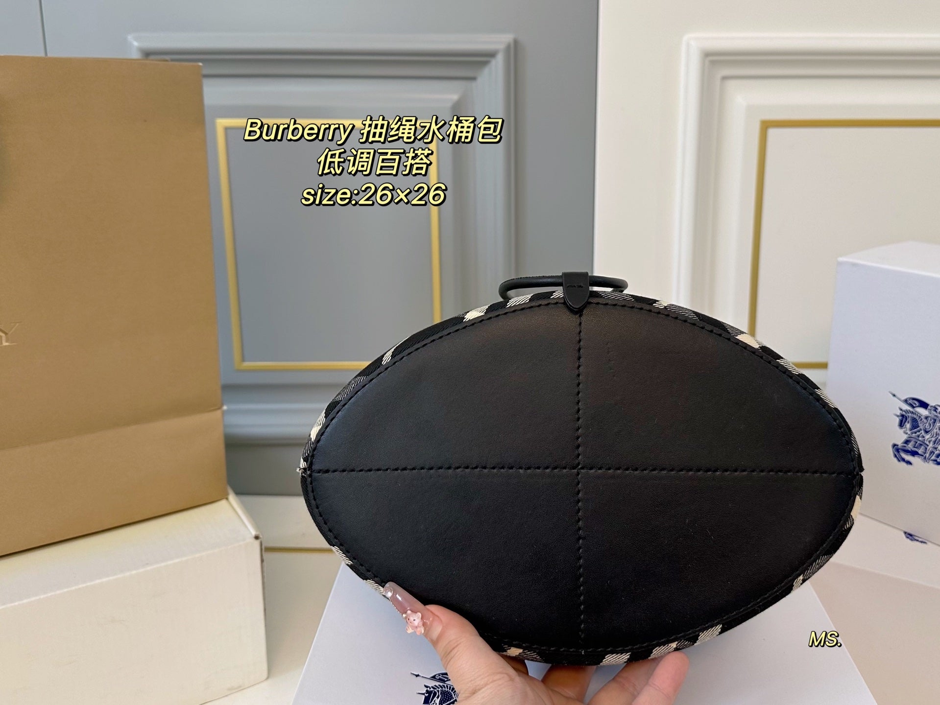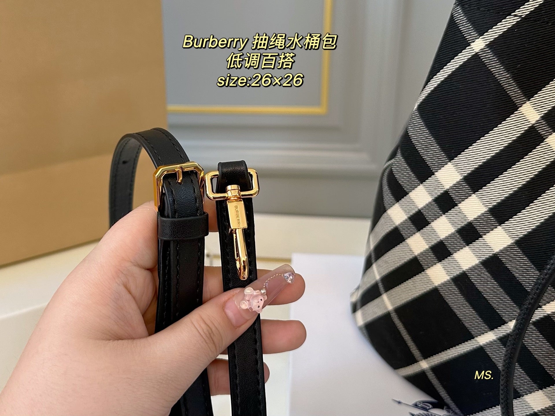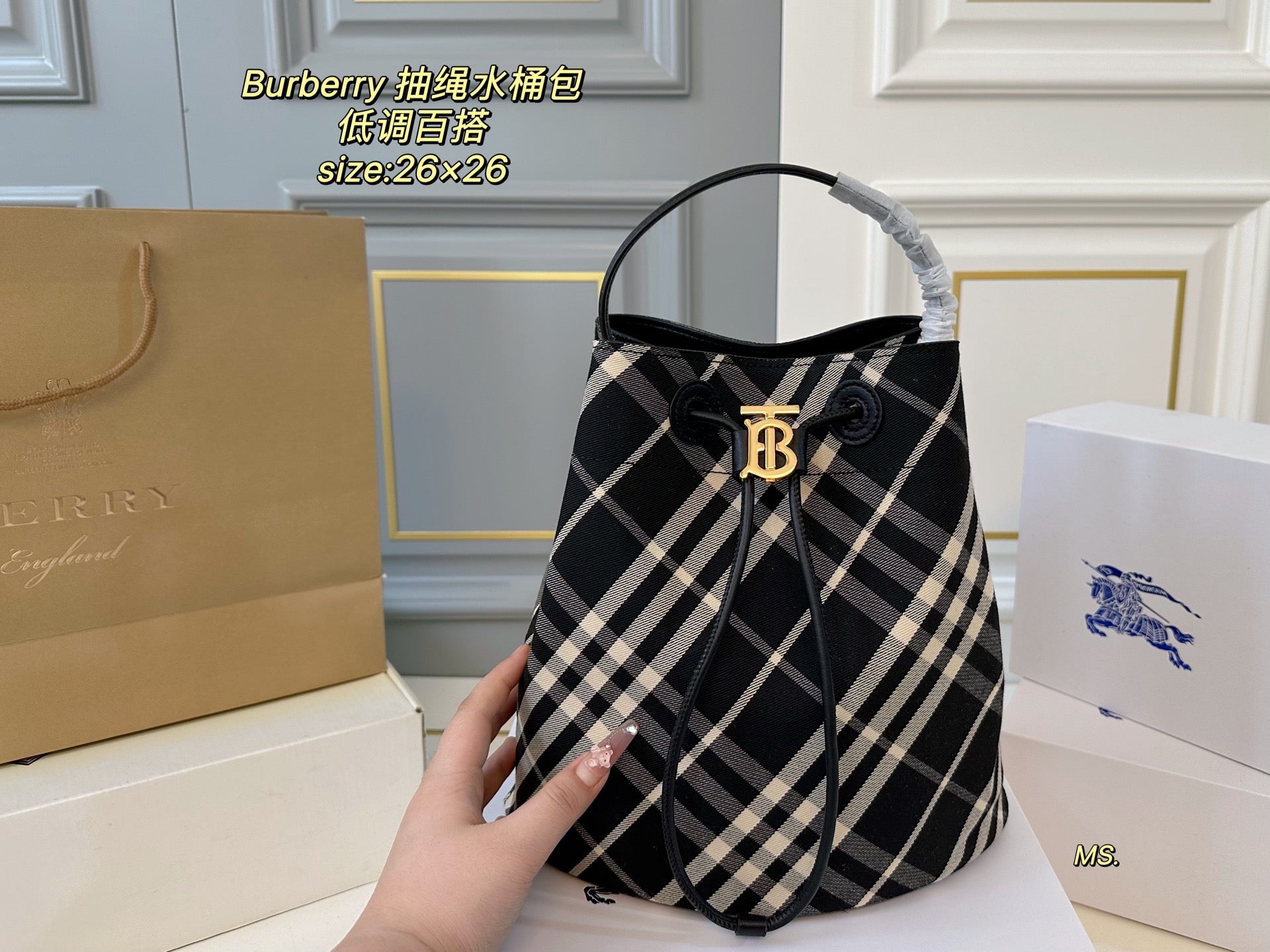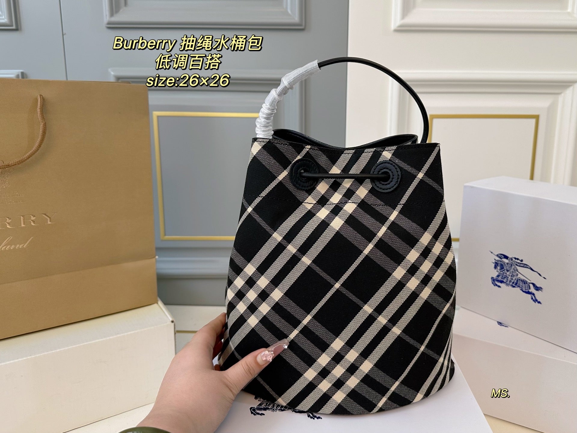 Elevate your accessory game with the Burberry Checkered Drawstring Bucket Bag. Measuring 26x26 cm, this eye-catching bag features a classic checkered pattern that embodies timeless elegance. The unique barrel-shaped design offers generous storage capacity while remaining lightweight for everyday use. With adjustable shoulder straps, this bag perfectly combines comfort and style, making it the ideal companion for daily outings, commutes, or casual gatherings. Embrace low-key sophistication and versatility with this must-have accessory.