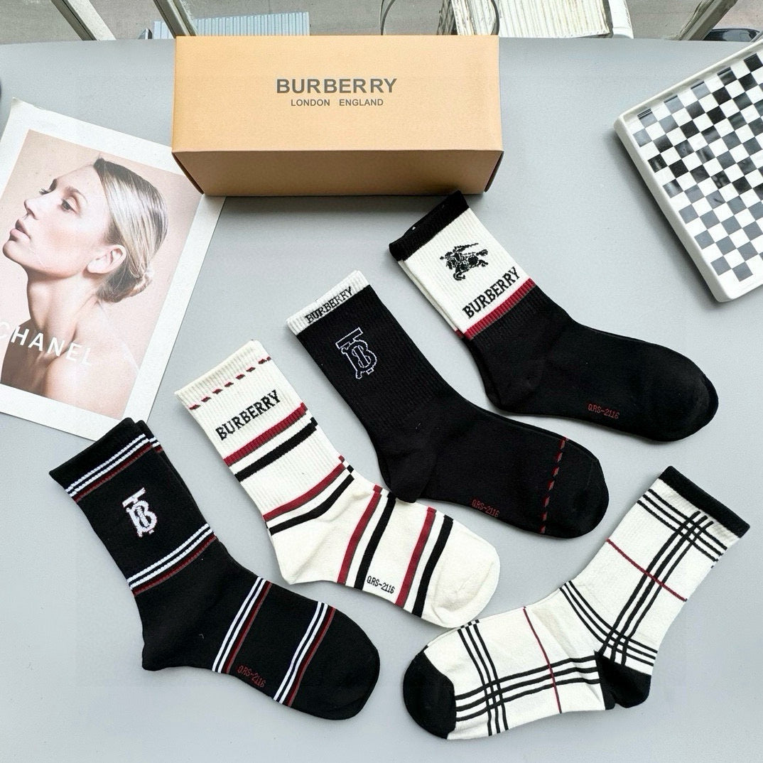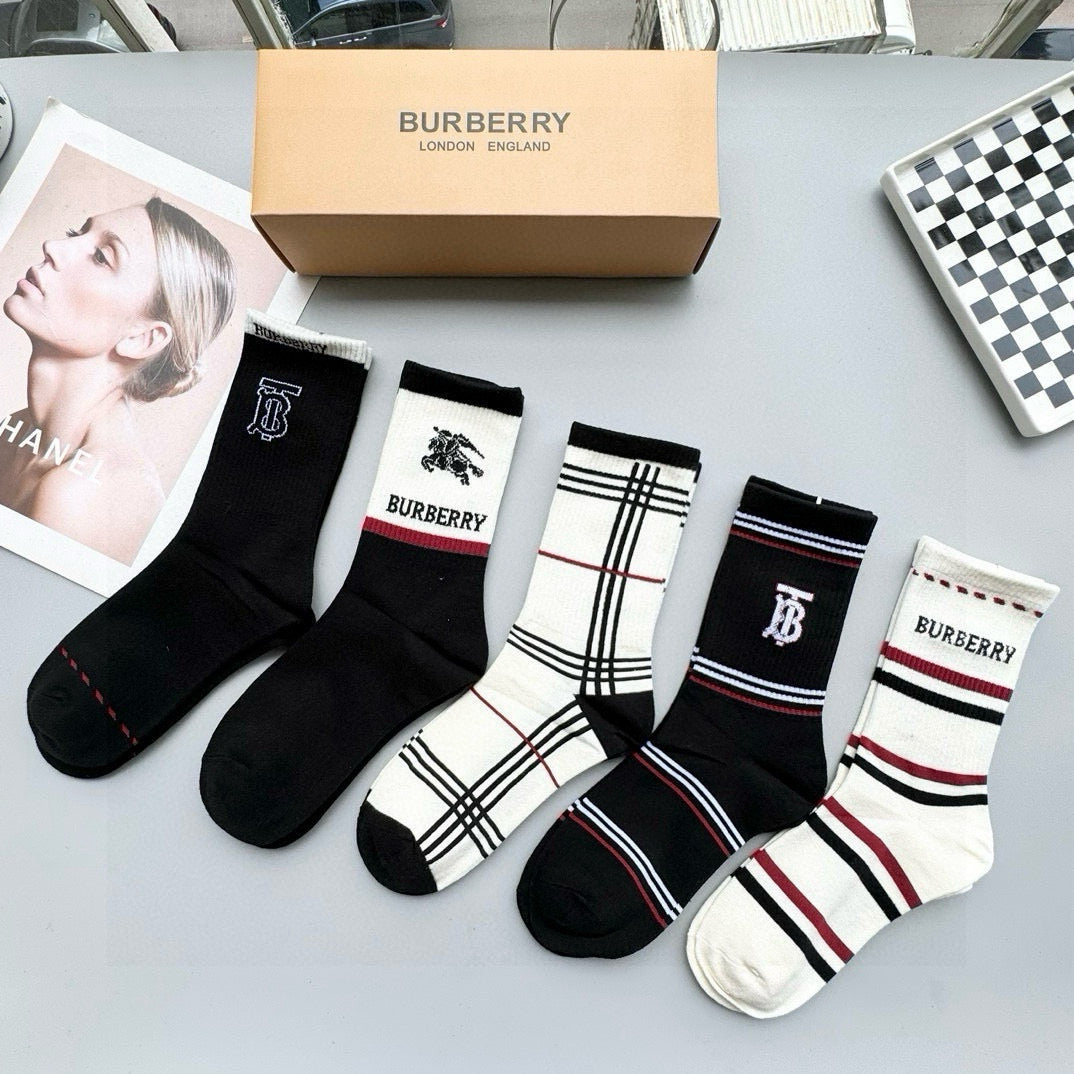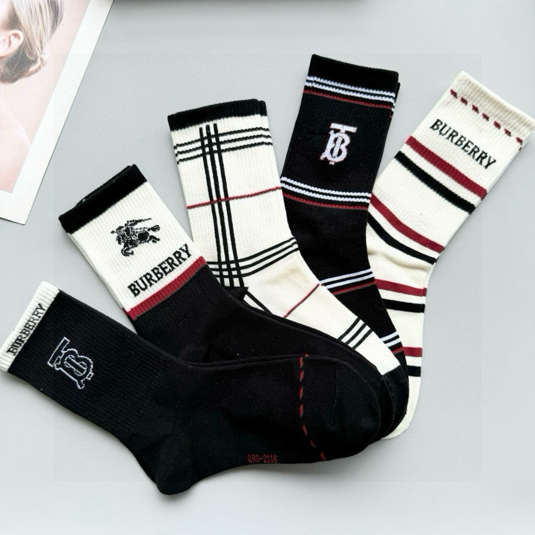 Elevate your sock collection with Burberry's latest embroidered TB mid-length socks, packaged in a convenient box of five pairs. These trendy high-end socks feature striking colors and stylish embroidery, making them the perfect accessory for any fashion enthusiast. Known for their iconic design, these socks offer both comfort and style, effortlessly complementing any outfit. A must-have for those who want to stay on-trend, these fashionable socks are perfect for adding a pop of personality to your wardrobe. Suitable for any occasion, make Burberry's TB socks your go-to choice for fashionable footwear.