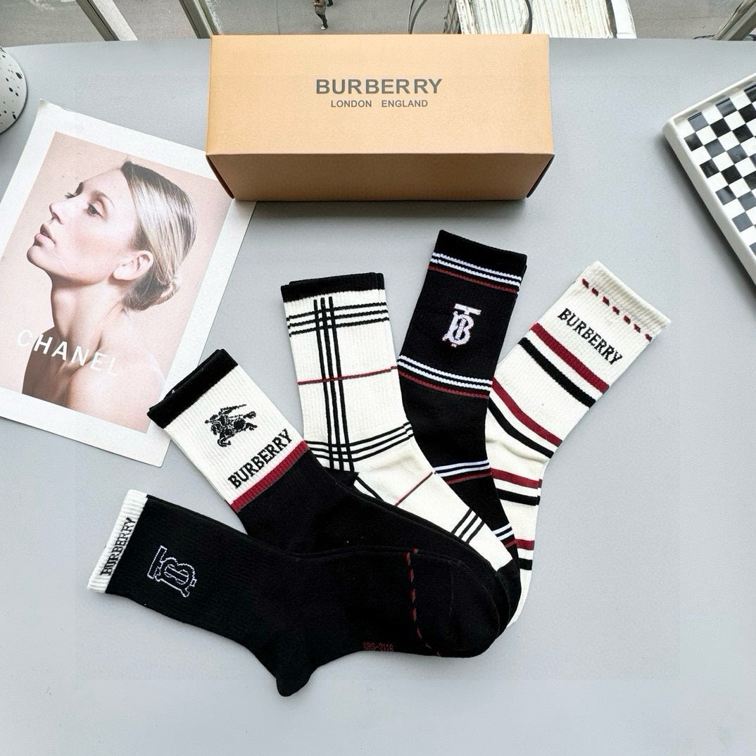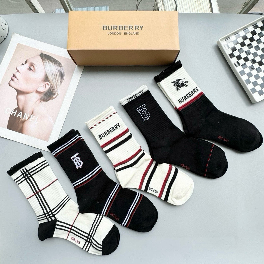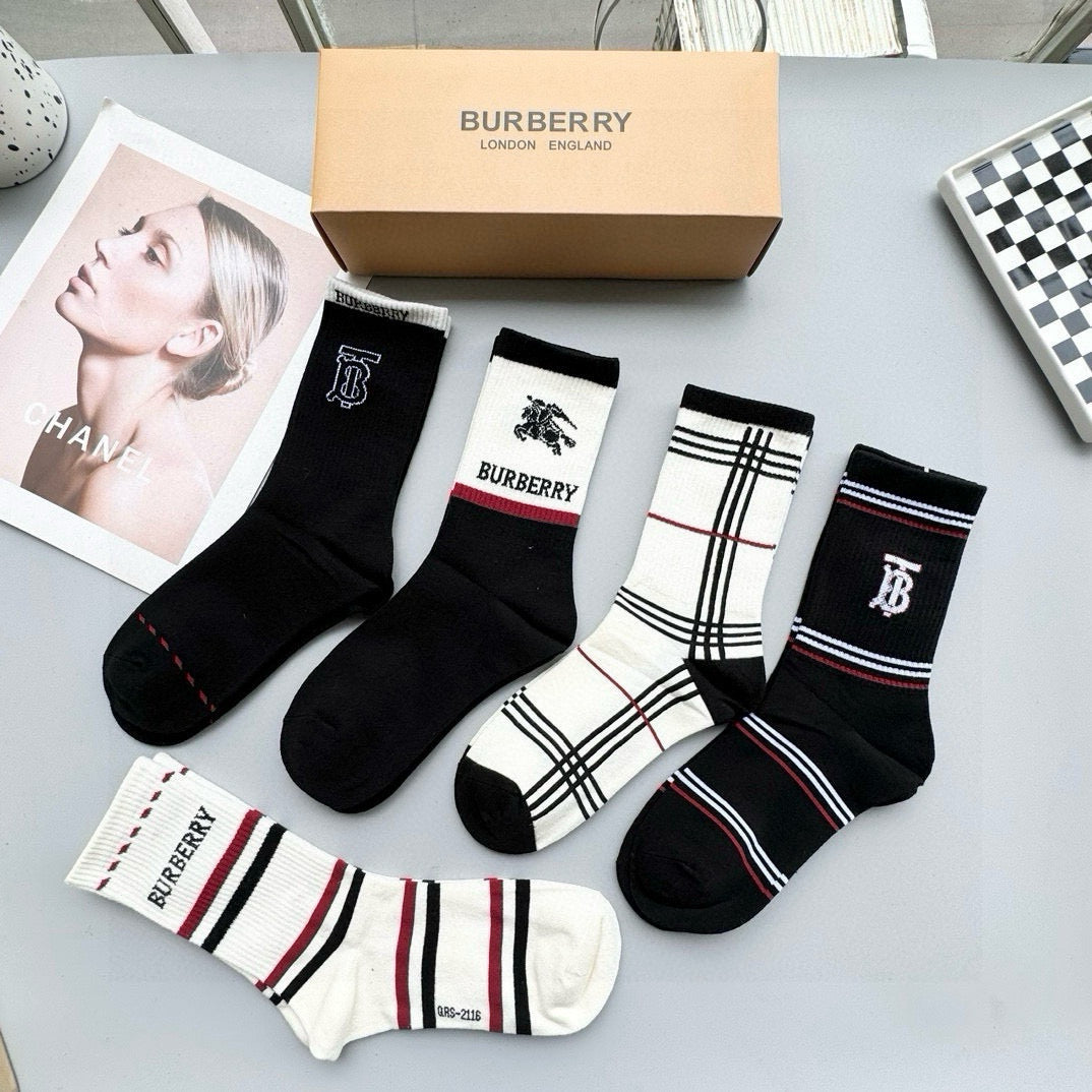 Elevate your sock collection with Burberry's latest embroidered TB mid-length socks, packaged in a convenient box of five pairs. These trendy high-end socks feature striking colors and stylish embroidery, making them the perfect accessory for any fashion enthusiast. Known for their iconic design, these socks offer both comfort and style, effortlessly complementing any outfit. A must-have for those who want to stay on-trend, these fashionable socks are perfect for adding a pop of personality to your wardrobe. Suitable for any occasion, make Burberry's TB socks your go-to choice for fashionable footwear.