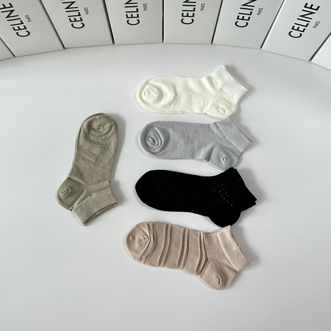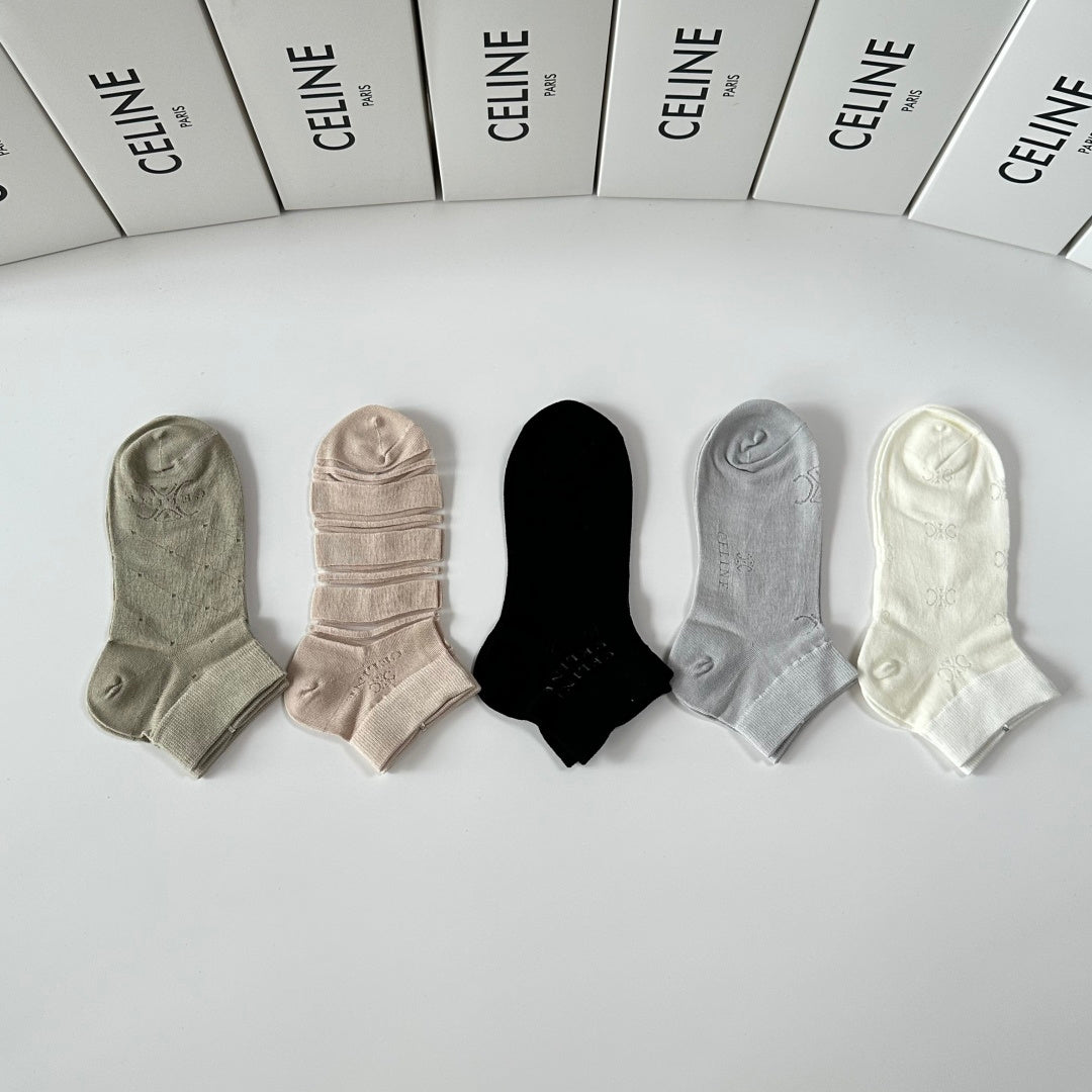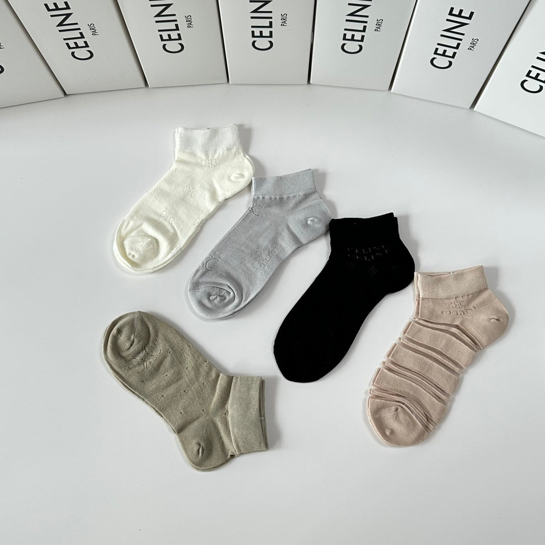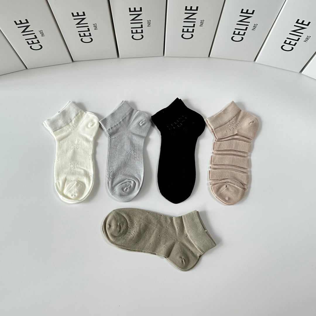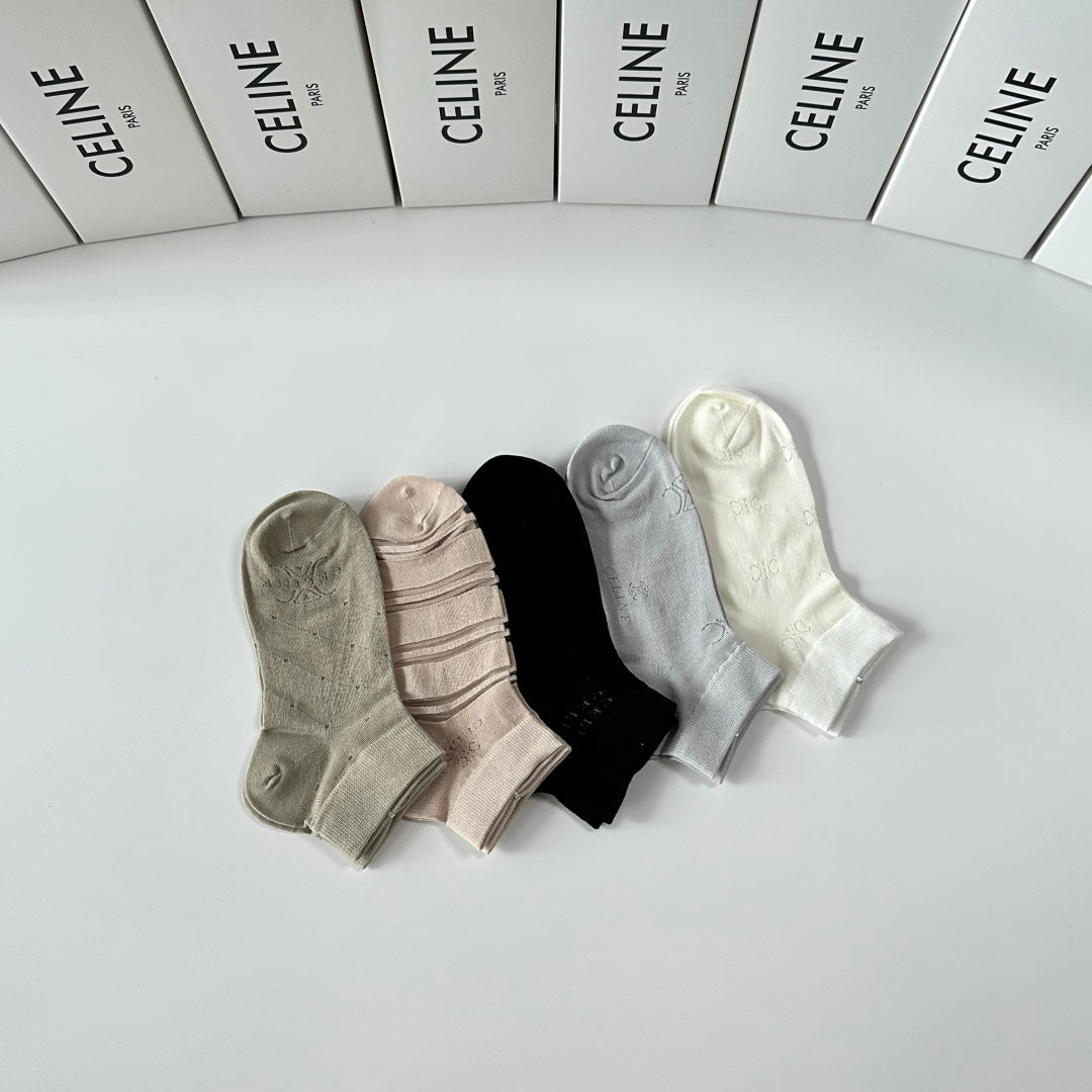 Elevate your sock collection with Celine's new mid-calf tube socks, thoughtfully presented in a convenient counter display. This set includes five stylish pairs, designed for effortless coordination with any outfit. Perfect for fashion enthusiasts, these socks are a trendy accessory that combines comfort and style. Don't miss out on this must-have addition to your wardrobe!