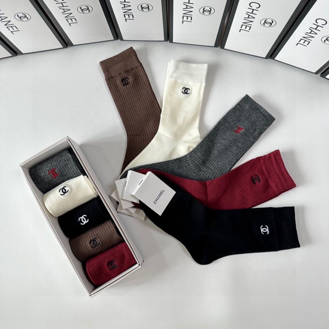 Elevate your sock collection with our Chanel Classic Embroidered Cotton Mid-Length Pile Socks. This exclusive set includes five pairs, beautifully packaged and ready to impress. Featuring luxurious, soft combed cotton, these socks combine comfort with timeless style. Perfect for fashion enthusiasts, they make a chic addition to any wardrobe. Don't miss out on this essential accessory from a leading brand—ideal for both casual outings and sophisticated gatherings.