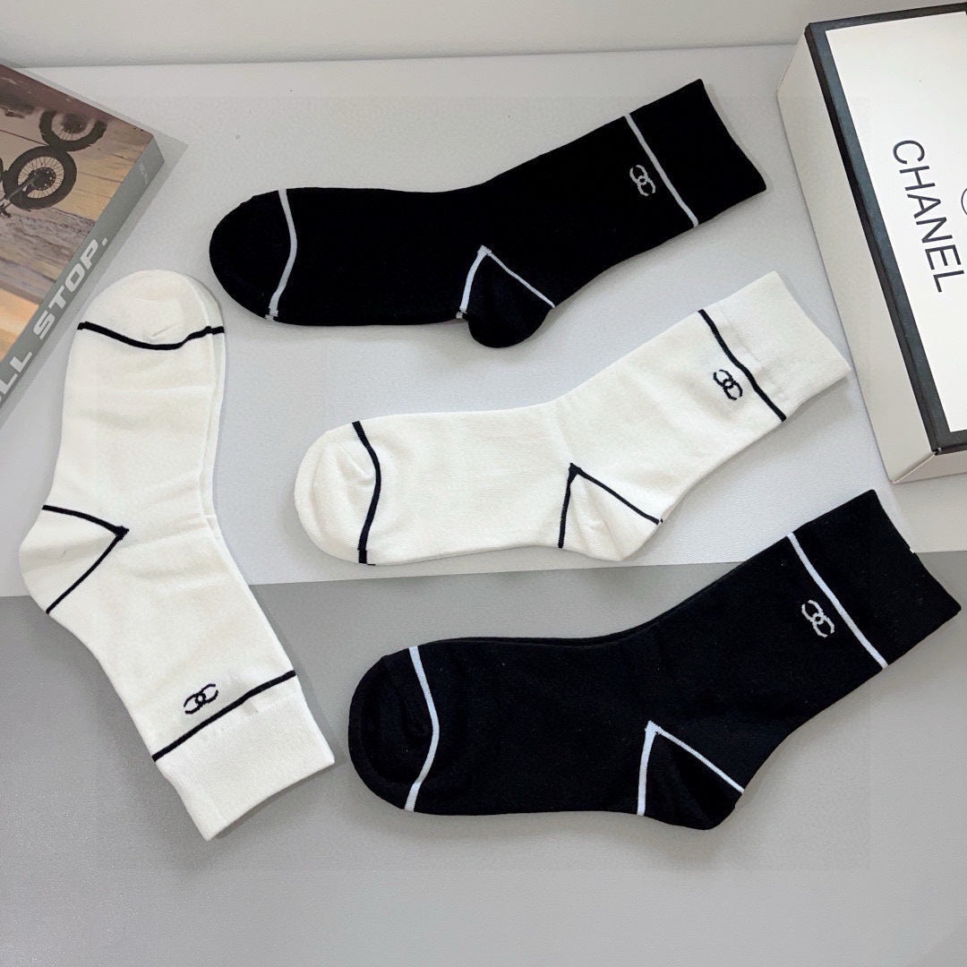 Elevate your wardrobe with our CHANEL Classic High Socks, packaged in a stylish box containing four pairs. Crafted from soft, high-quality pure cotton, these socks feature the iconic double C pattern logo, making them a timeless accessory for any fashion enthusiast. With their perfect blend of comfort and style, these socks are versatile and easy to pair with a variety of outfits. A must-have addition for those seeking to make a statement with high-end fashion staples.