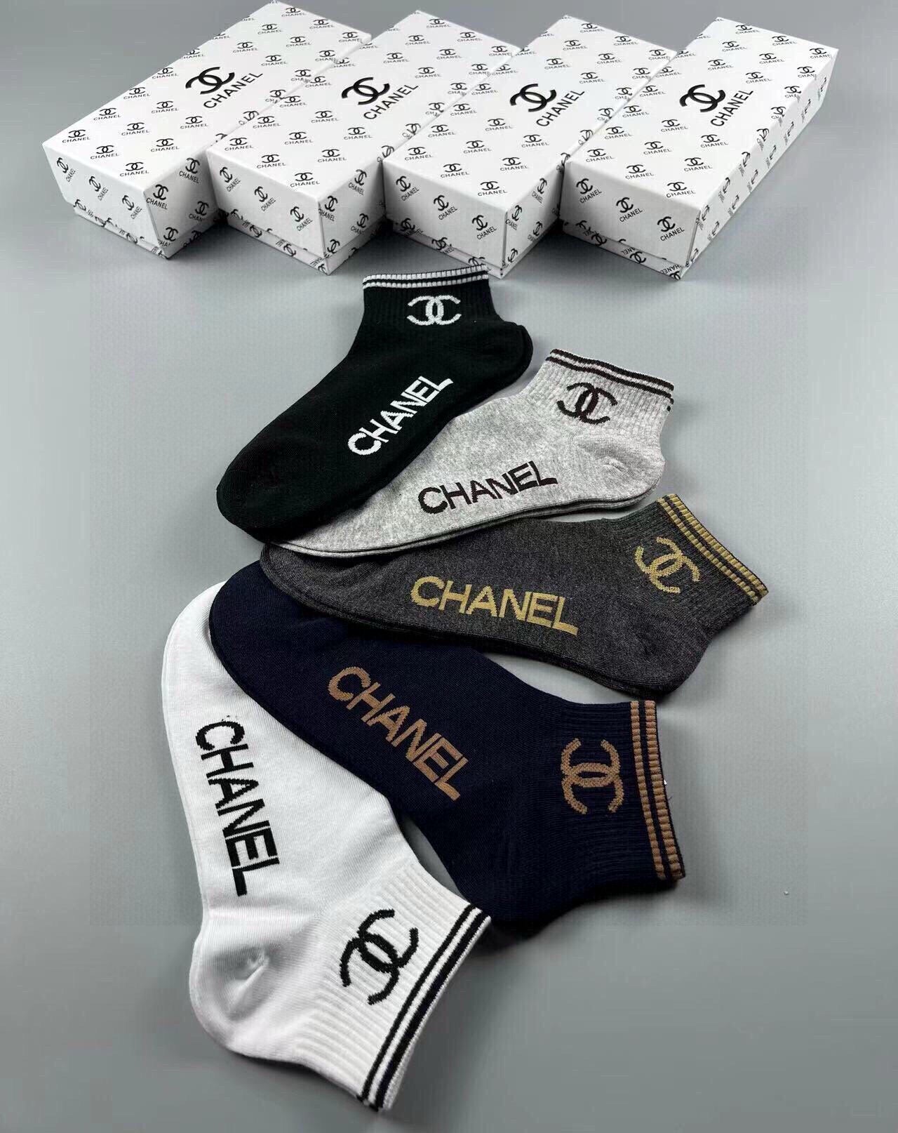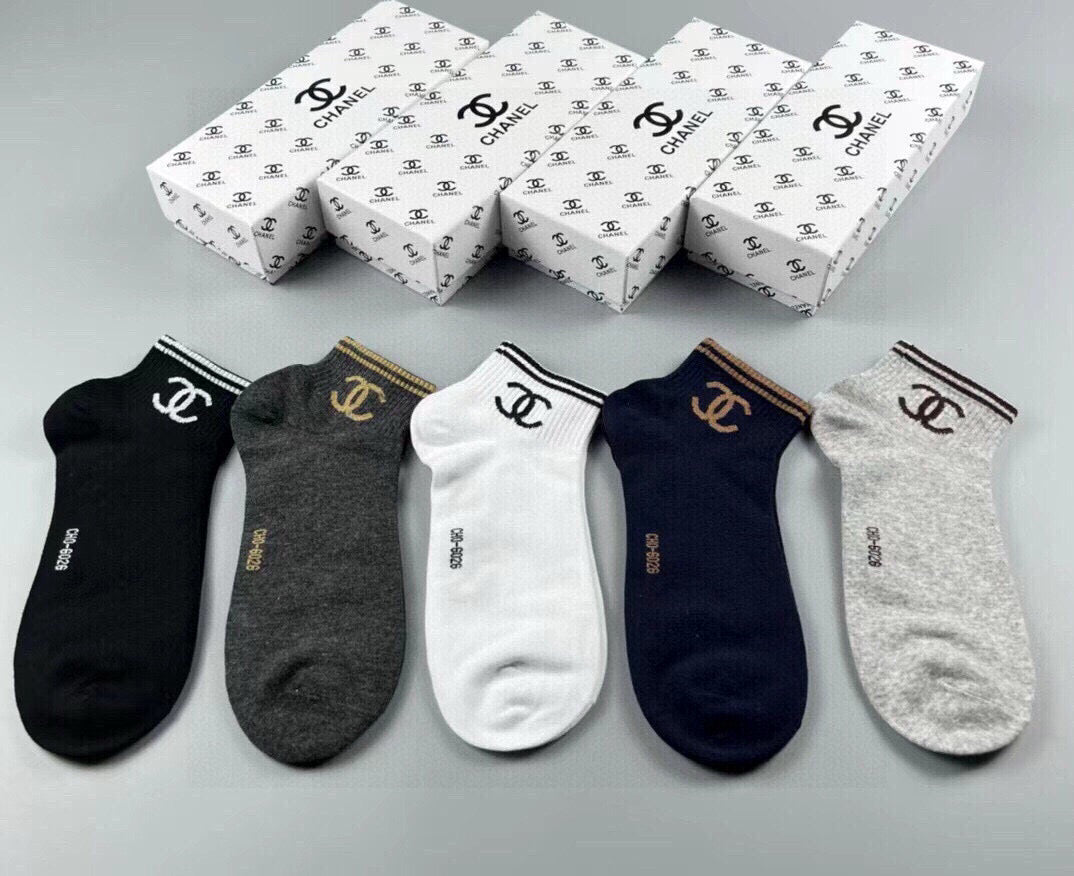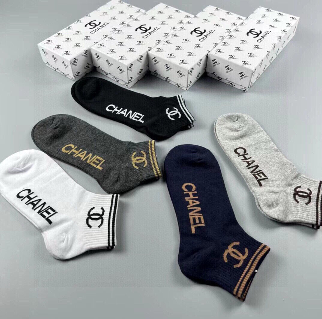 Elevate your sock collection with the CHANEL Classic Men's Socks, a premium set of five pairs that seamlessly blend comfort and style. Crafted from 100% pure cotton, these socks offer a soft, breathable feel that ensures all-day comfort. Featuring a jacquard logo design, they add a touch of sophistication to any outfit. Ideal for fashion enthusiasts and those embracing luxury, these versatile socks are perfect for both casual outings and formal occasions. Upgrade your wardrobe with this must-have accessory from CHANEL, and enjoy easy styling with every ensemble.