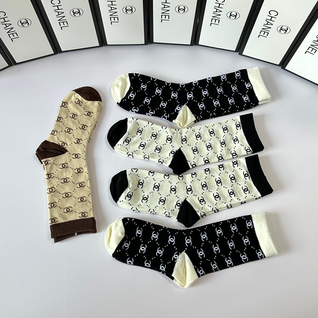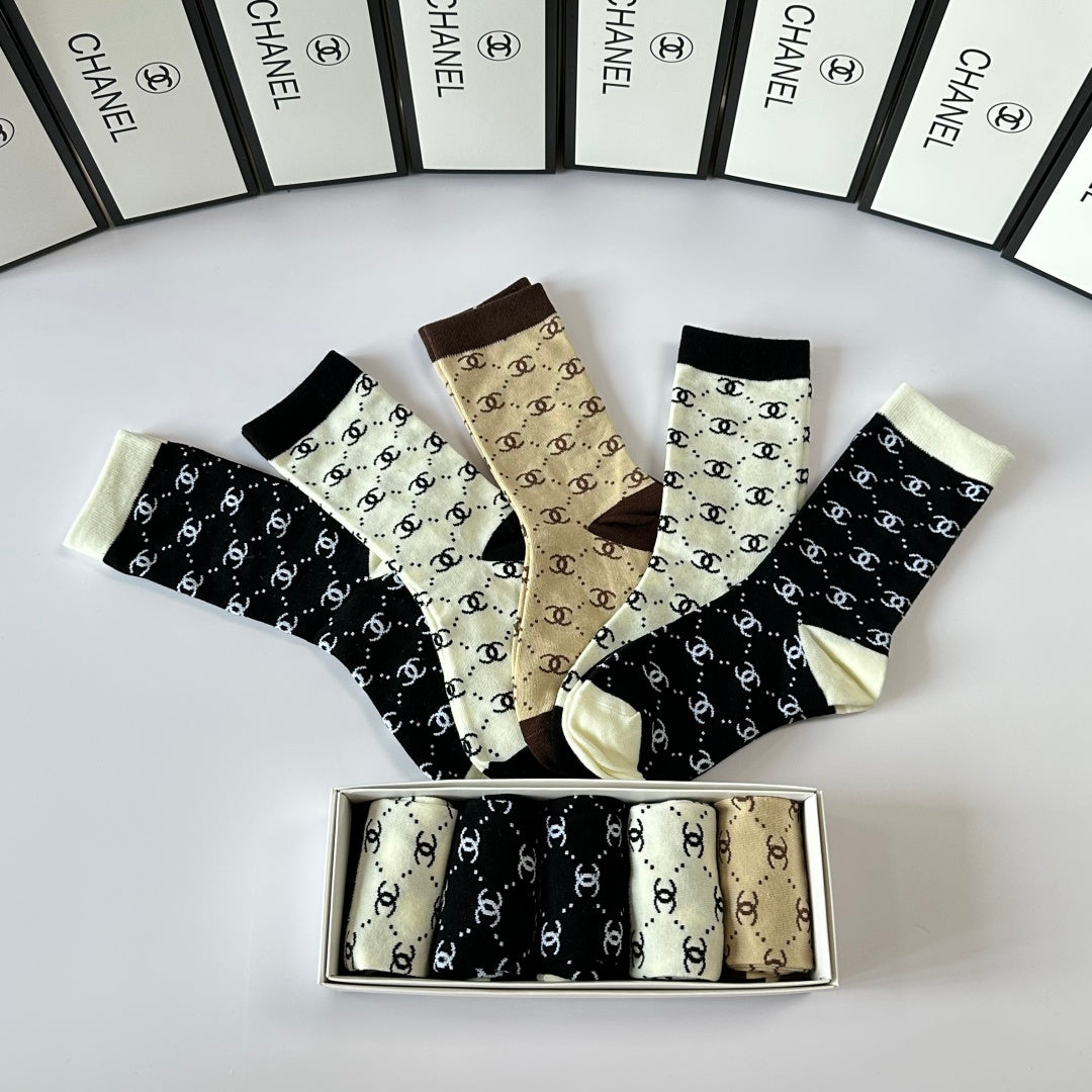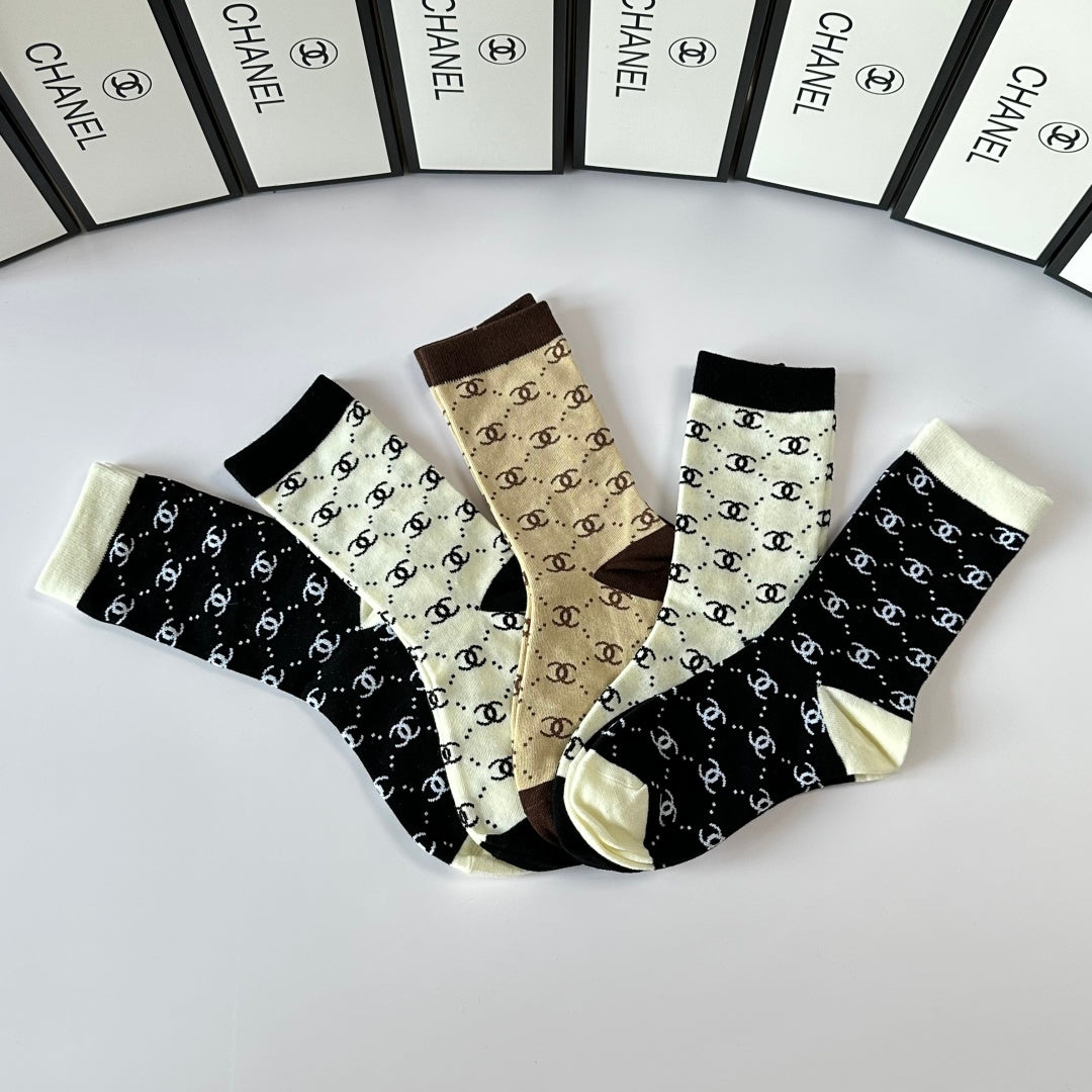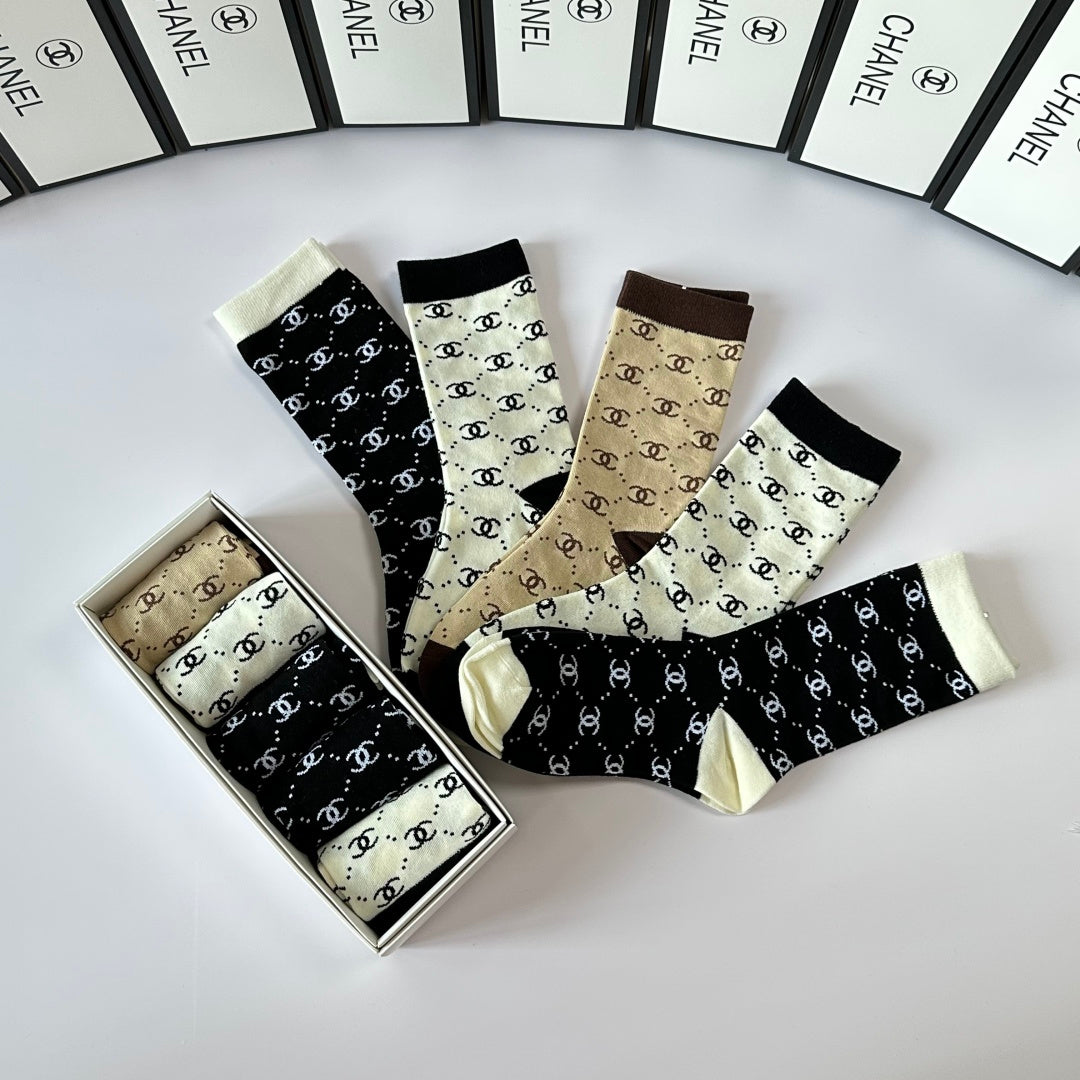 Elevate your sock collection with the Chanel Classic Mid-Length Pile Socks. This premium set includes five pairs of stylish tube socks, beautifully packaged for a touch of luxury. Designed for effortless coordination with any outfit, these socks are a must-have for fashion enthusiasts. Embrace the chic vibe of a big brand and enhance your daily wear with these trendy essentials. Perfect for both casual and formal occasions, they effortlessly blend comfort and style.