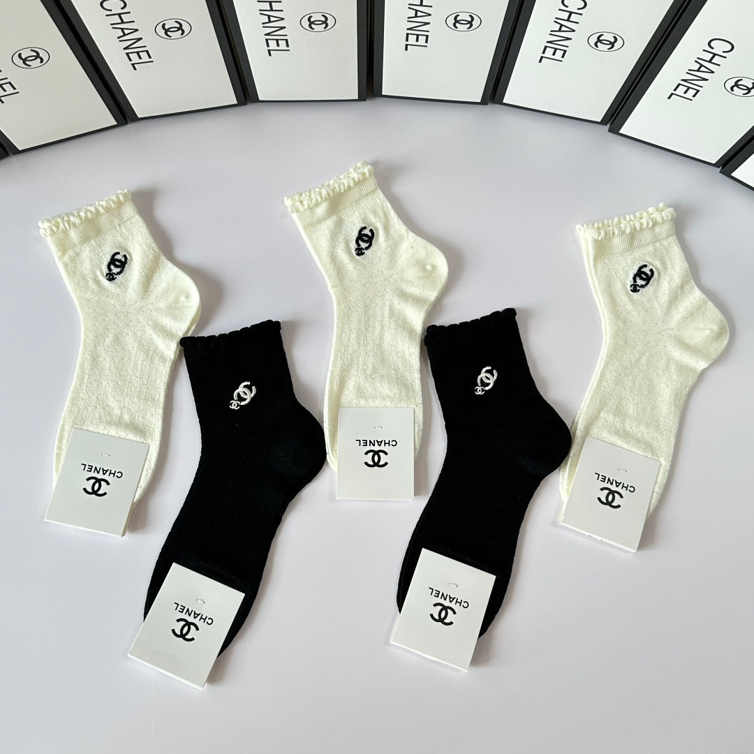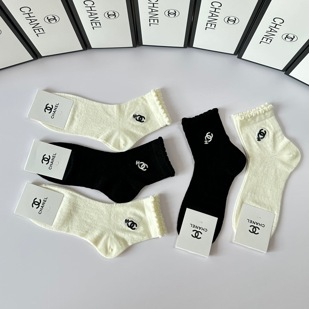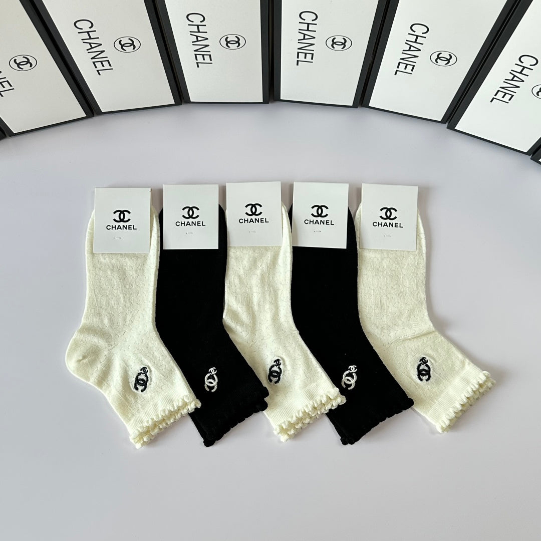 Elevate your sock collection with this exclusive set of Chanel embroidered mid-length pile socks. Perfectly packaged in a counter-ready box, this stylish five-pair set is a must-have for fashion enthusiasts. With a versatile design, these socks are easy to coordinate with any outfit. Experience the luxury of Chanel—one of the world’s leading fashion brands—every day with this chic accessory. Ideal for gifting or personal use, these socks combine comfort and elegance effortlessly.