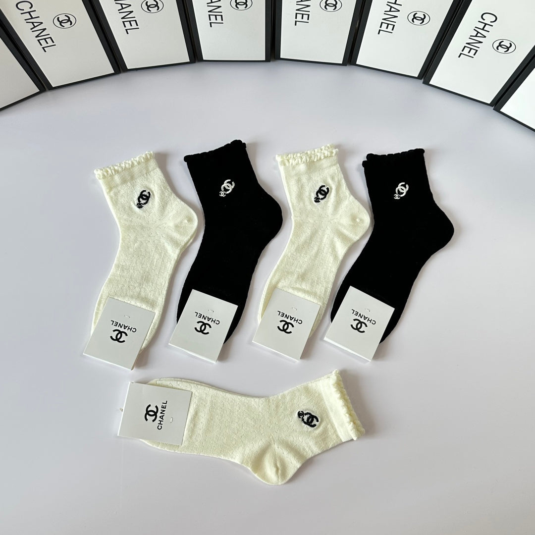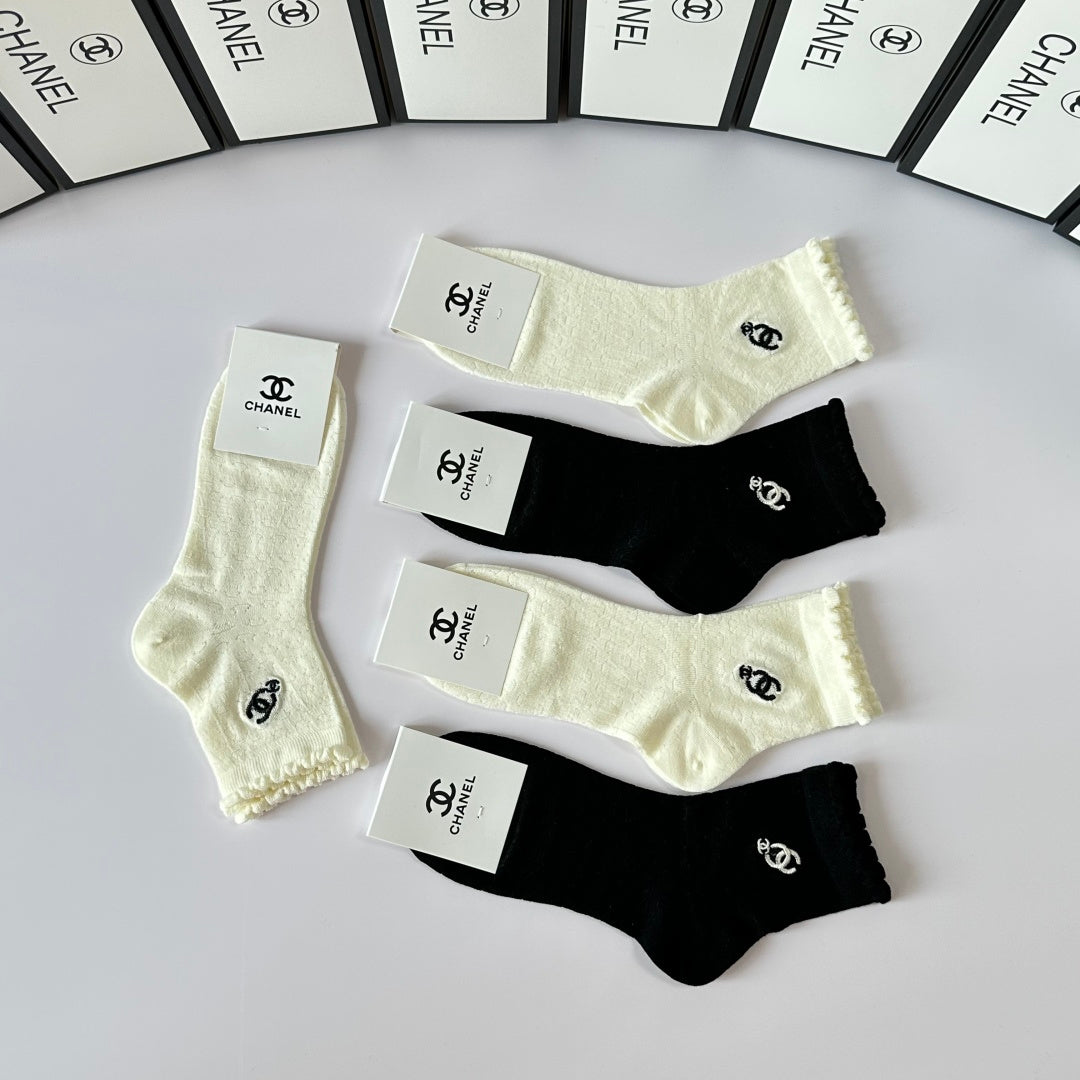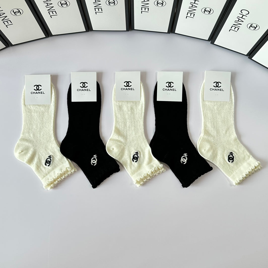 Elevate your sock collection with this exclusive set of Chanel embroidered mid-length pile socks. Perfectly packaged in a counter-ready box, this stylish five-pair set is a must-have for fashion enthusiasts. With a versatile design, these socks are easy to coordinate with any outfit. Experience the luxury of Chanel—one of the world’s leading fashion brands—every day with this chic accessory. Ideal for gifting or personal use, these socks combine comfort and elegance effortlessly.