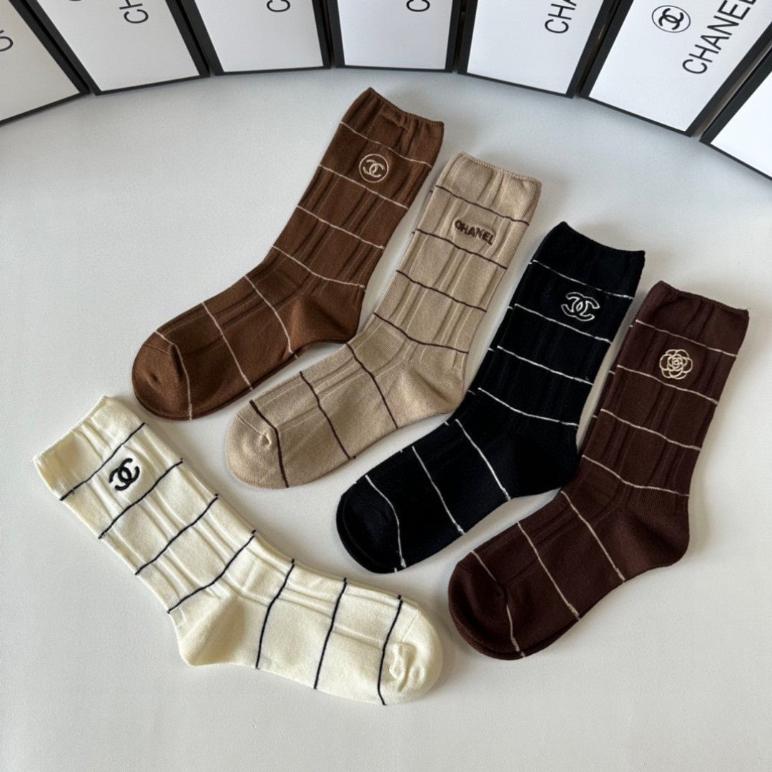 Elevate your sock game with Chanel's new embroidered mid-length socks, elegantly packaged in a stylish counter box. This collection includes five pairs of coordinated tube socks, making it the perfect accessory for any outfit. Effortlessly chic and easy to match, these socks are a must-have for fashion enthusiasts who appreciate quality and design. Upgrade your wardrobe or gift a loved one with this luxurious set!