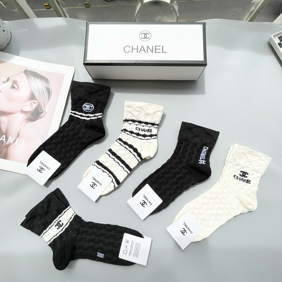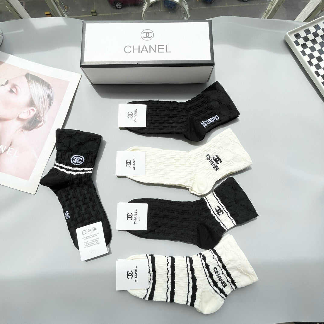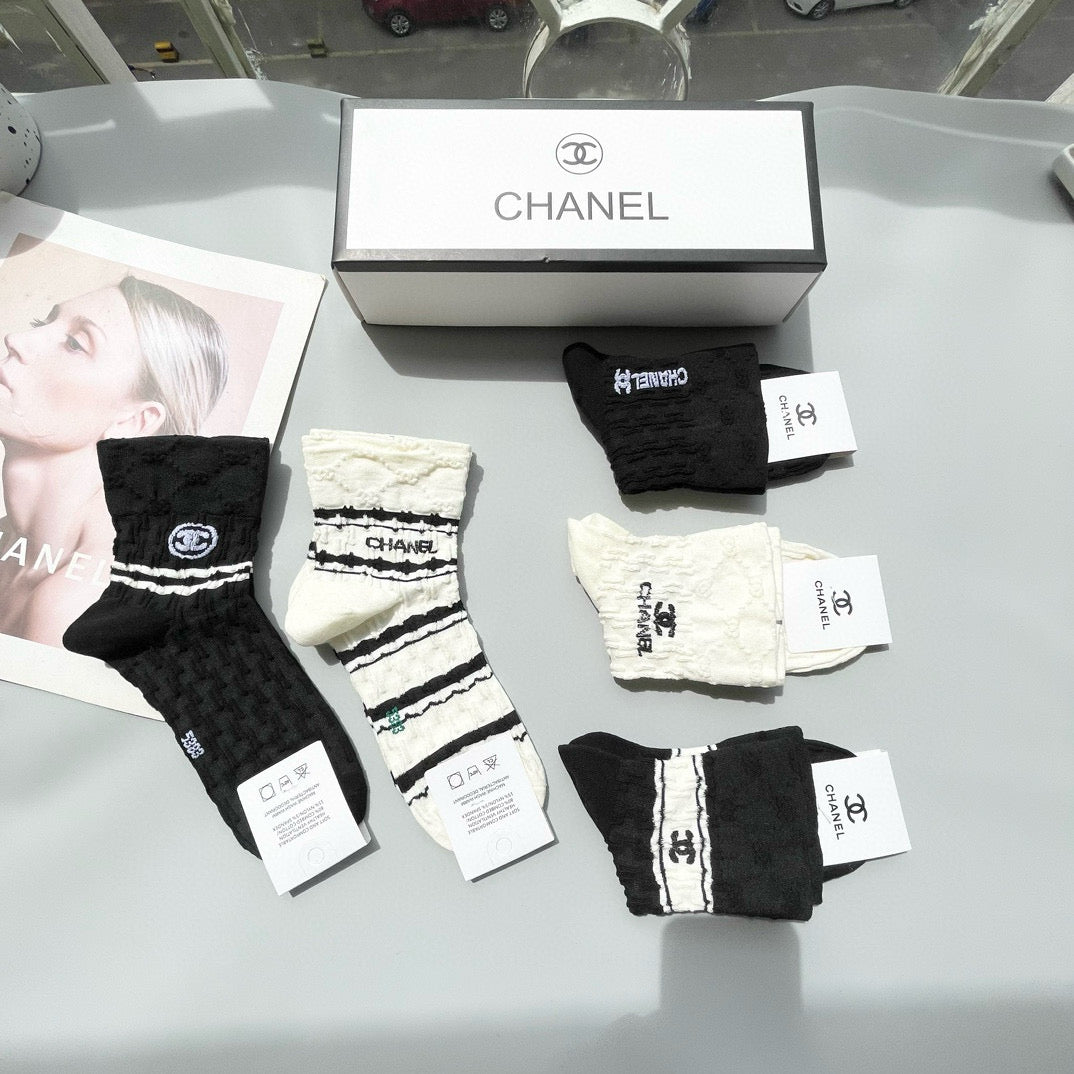 Elevate your sock collection with this exclusive set of Chanel mid-calf socks, beautifully packaged with five fashionable pairs in each box. These stylish socks are a key accessory for fashion enthusiasts, seamlessly blending luxury and comfort. Perfect for pairing with both casual and formal outfits, they offer a chic, sophisticated touch to any ensemble. Don't miss out on this essential addition to your wardrobe—your feet will thank you! Recommended for those who appreciate high-quality, fashionable accessories.