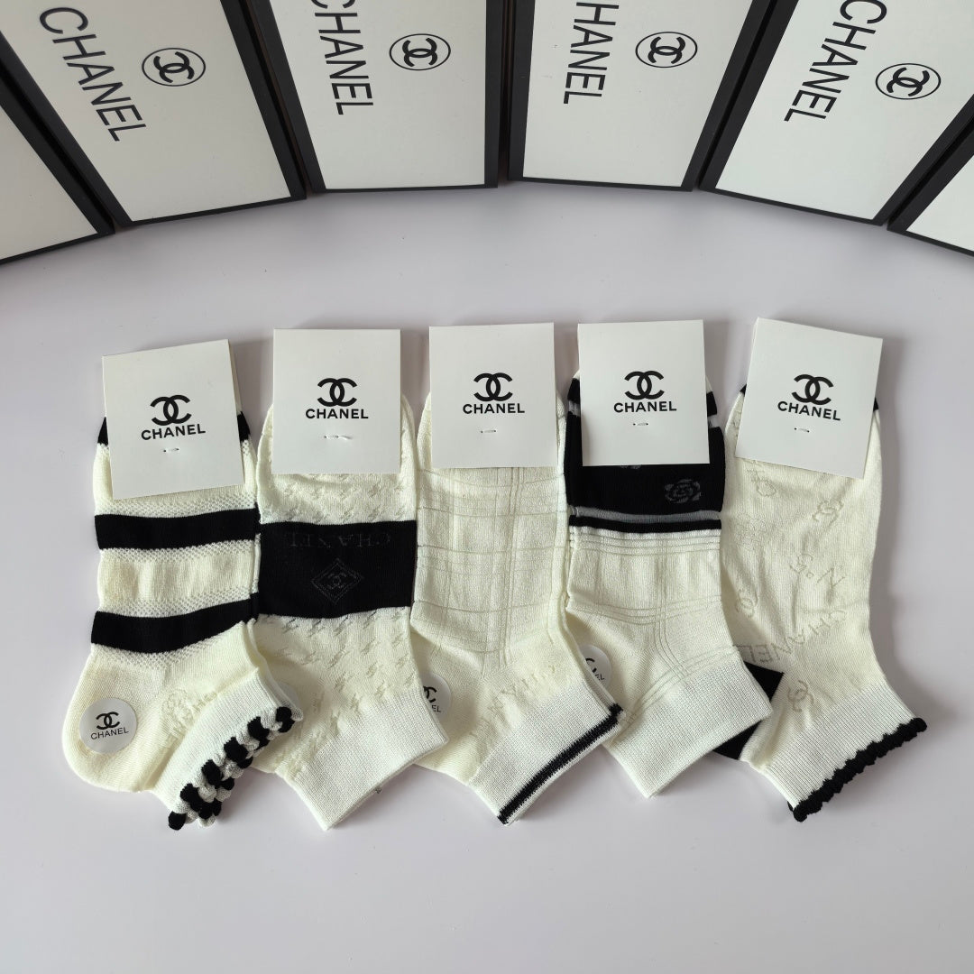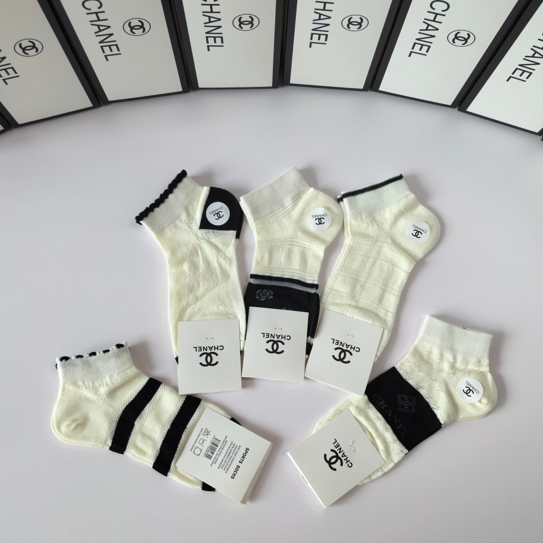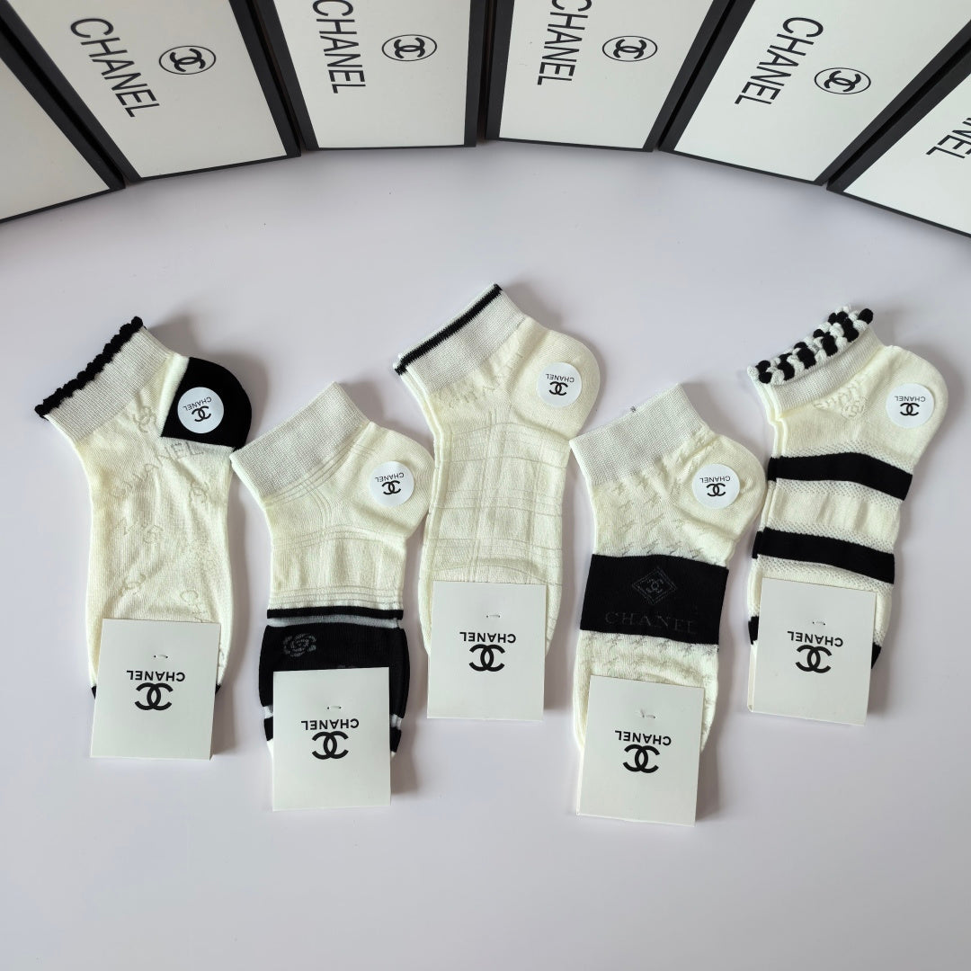 Elevate your wardrobe with the new Chanel mid-length pile socks, thoughtfully packaged in a stylish counter box. This set includes five pairs of premium tube socks, making them a perfect addition for fashion enthusiasts. Their versatile design allows for effortless styling with any outfit. Don't miss out on this must-have accessory from a leading brand. Upgrade your sock collection today!