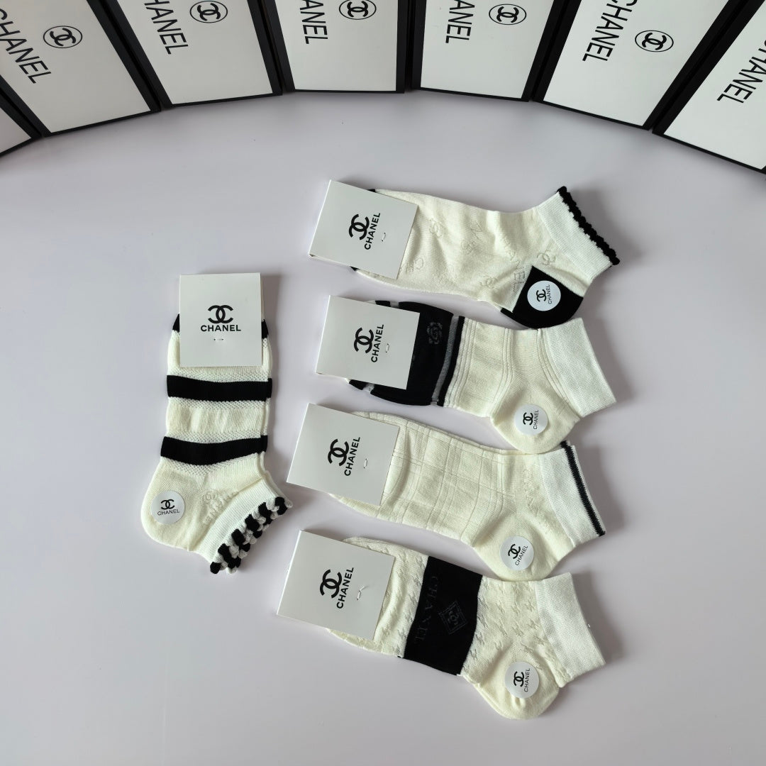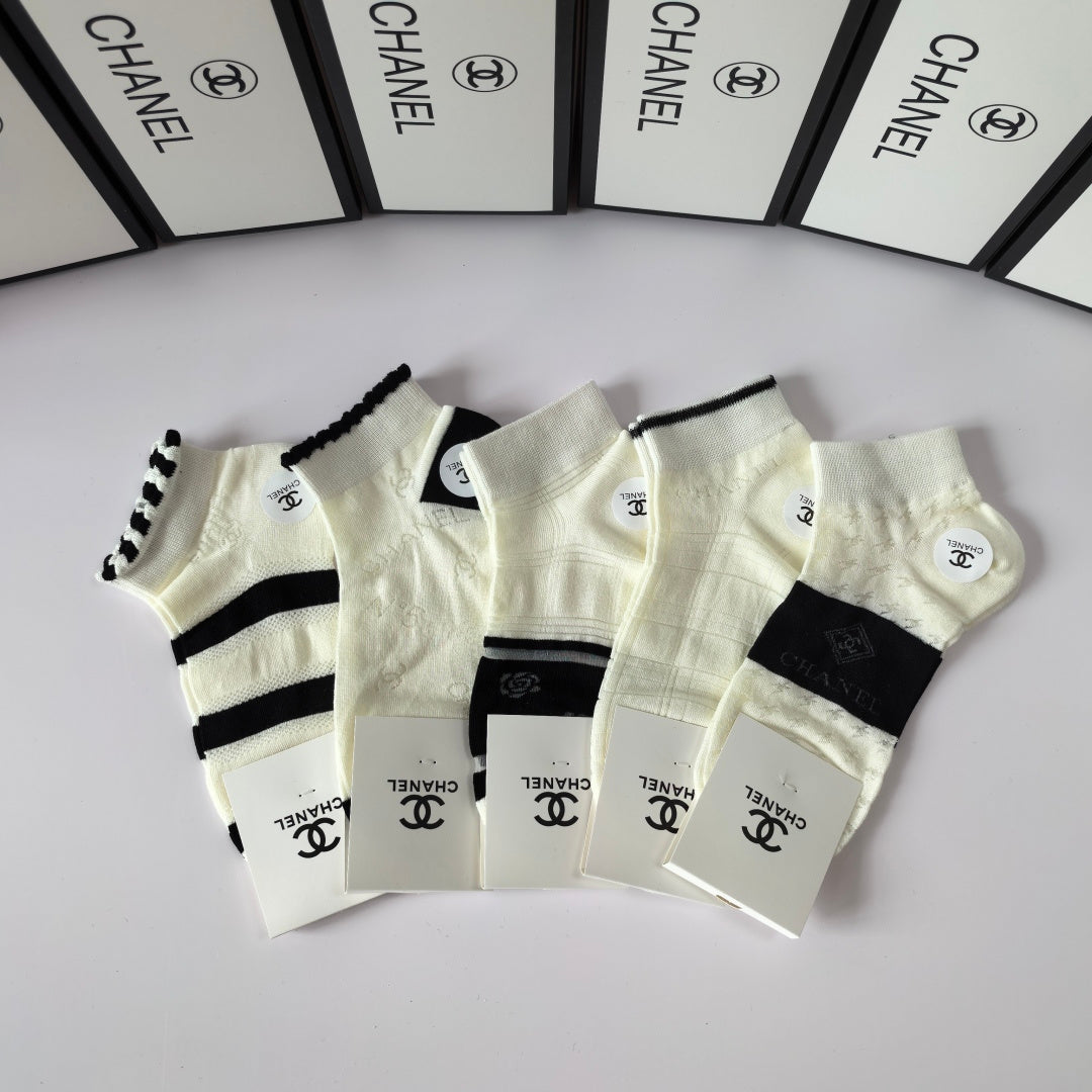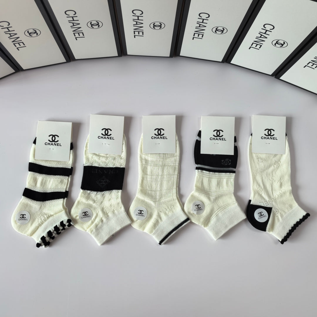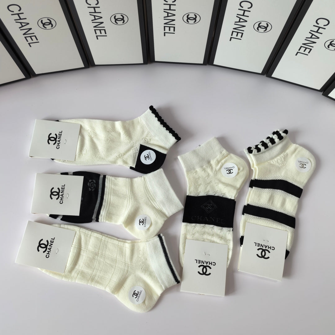 Elevate your wardrobe with the new Chanel mid-length pile socks, thoughtfully packaged in a stylish counter box. This set includes five pairs of premium tube socks, making them a perfect addition for fashion enthusiasts. Their versatile design allows for effortless styling with any outfit. Don't miss out on this must-have accessory from a leading brand. Upgrade your sock collection today!