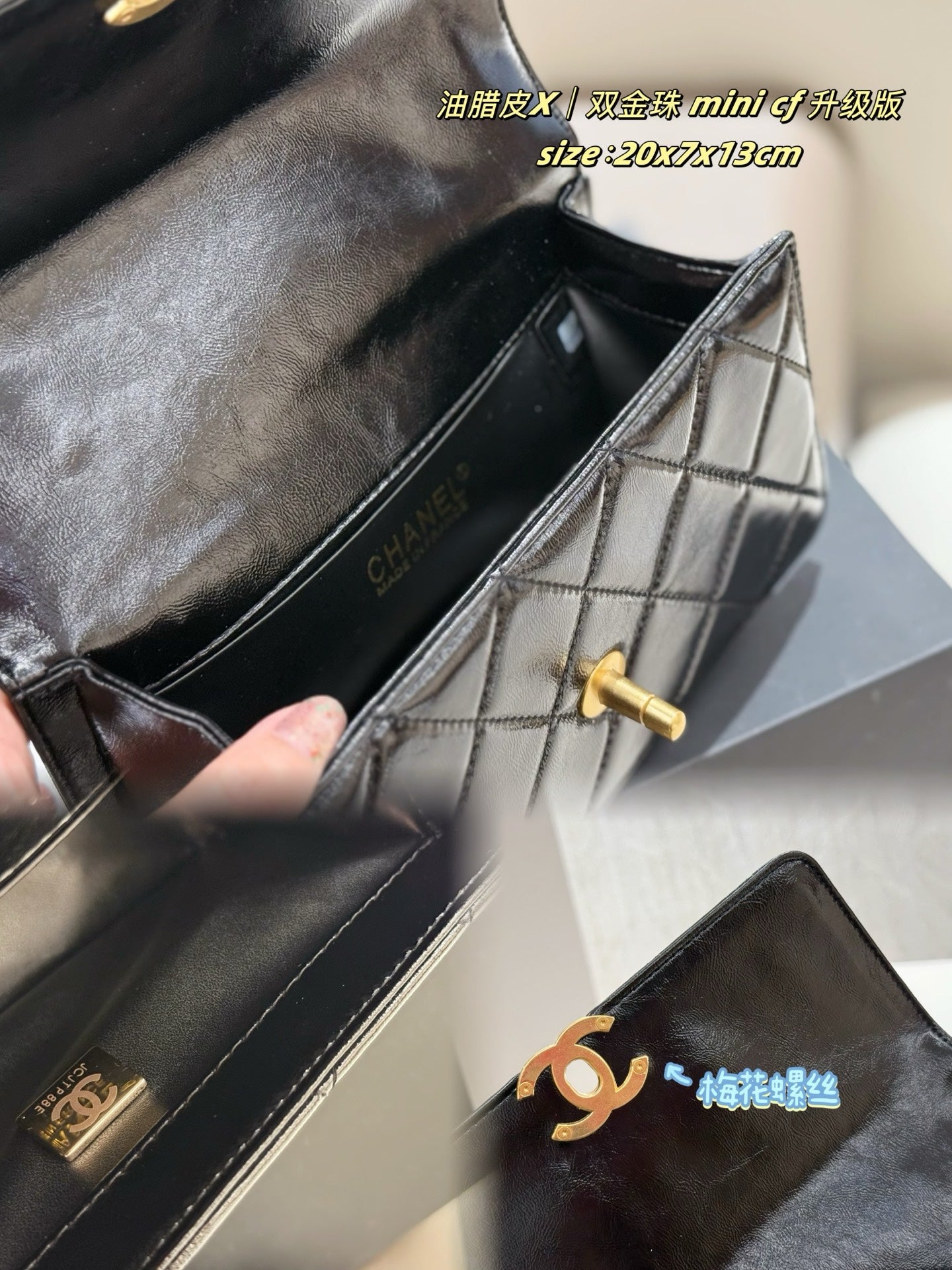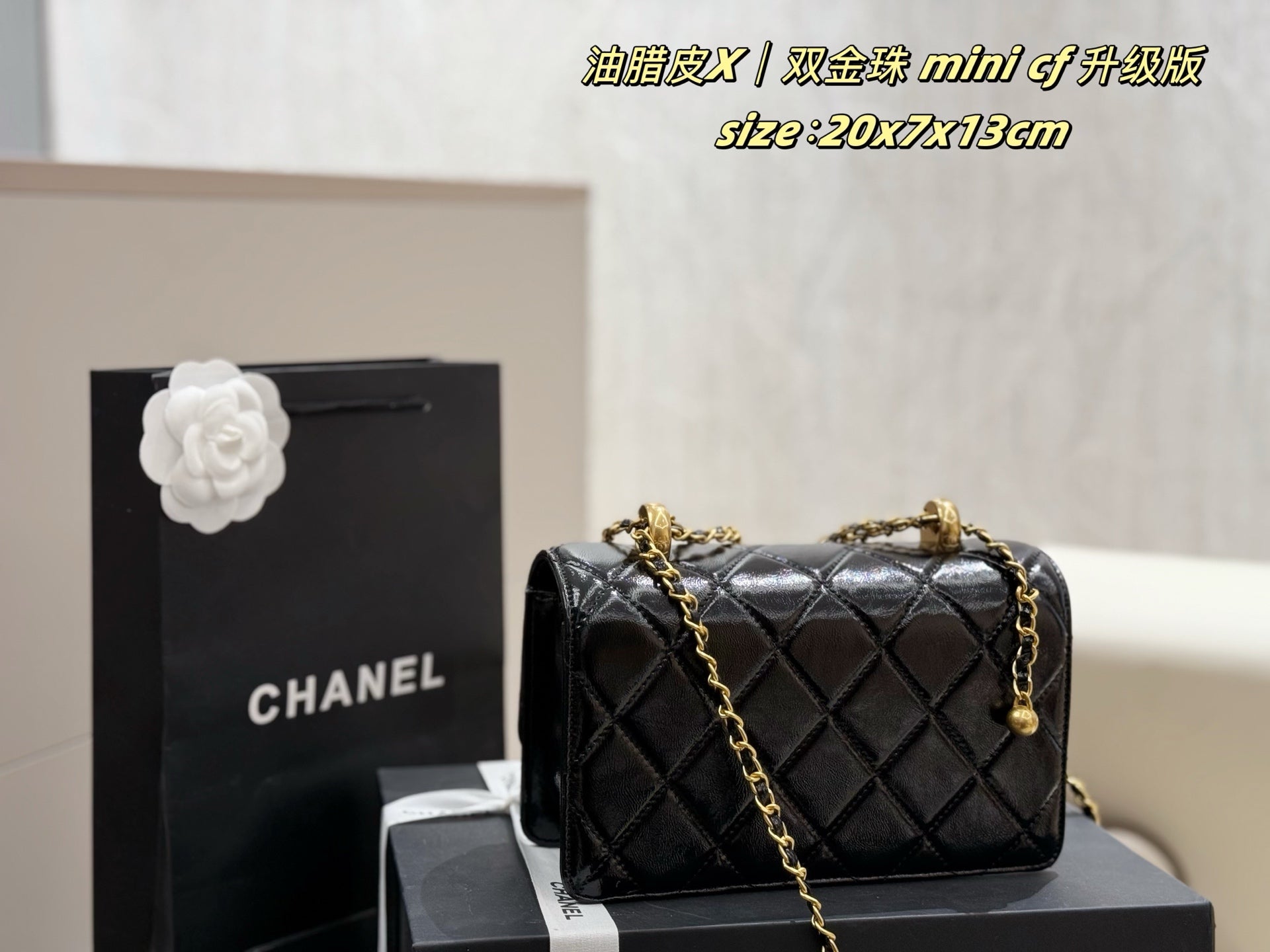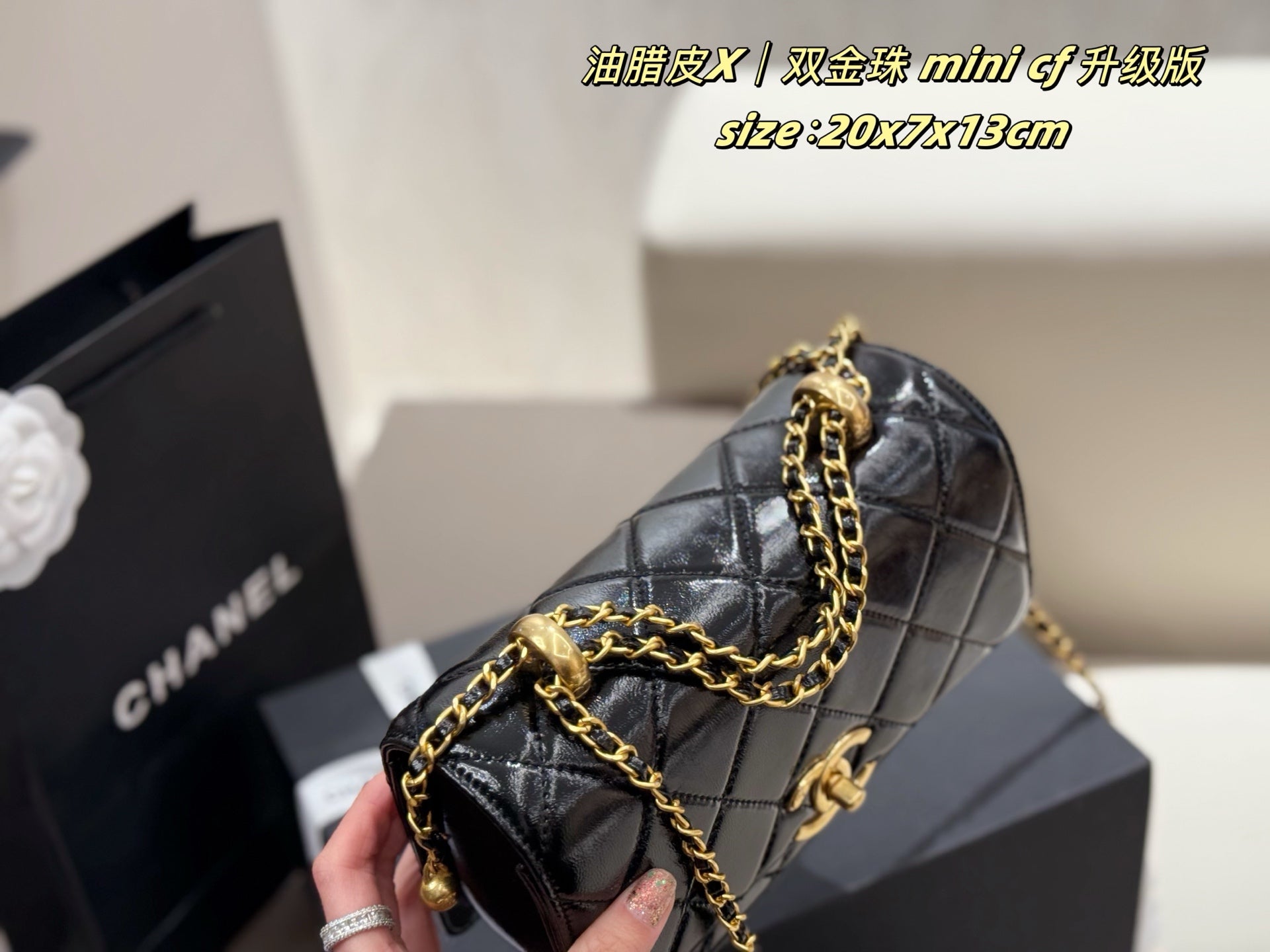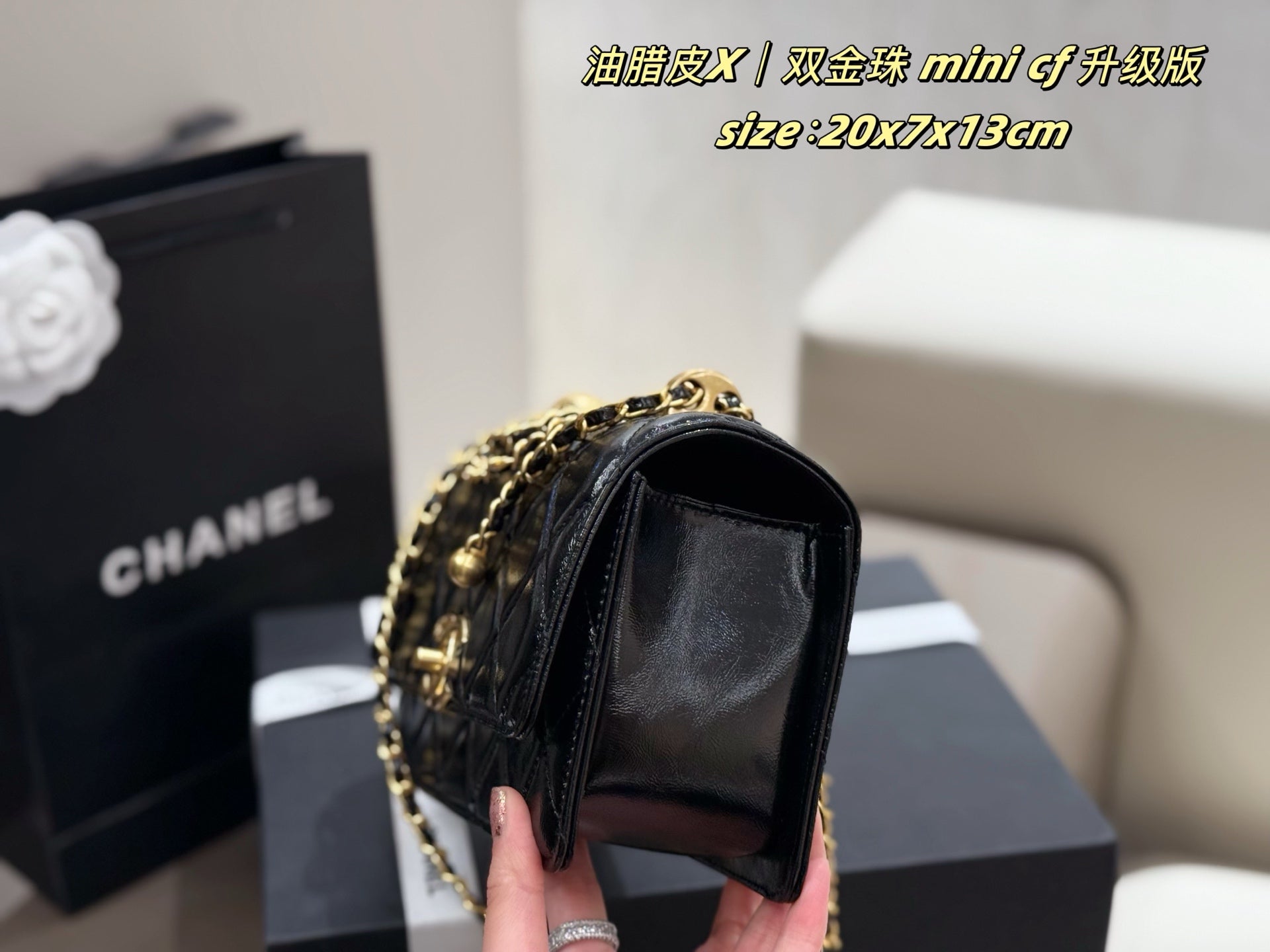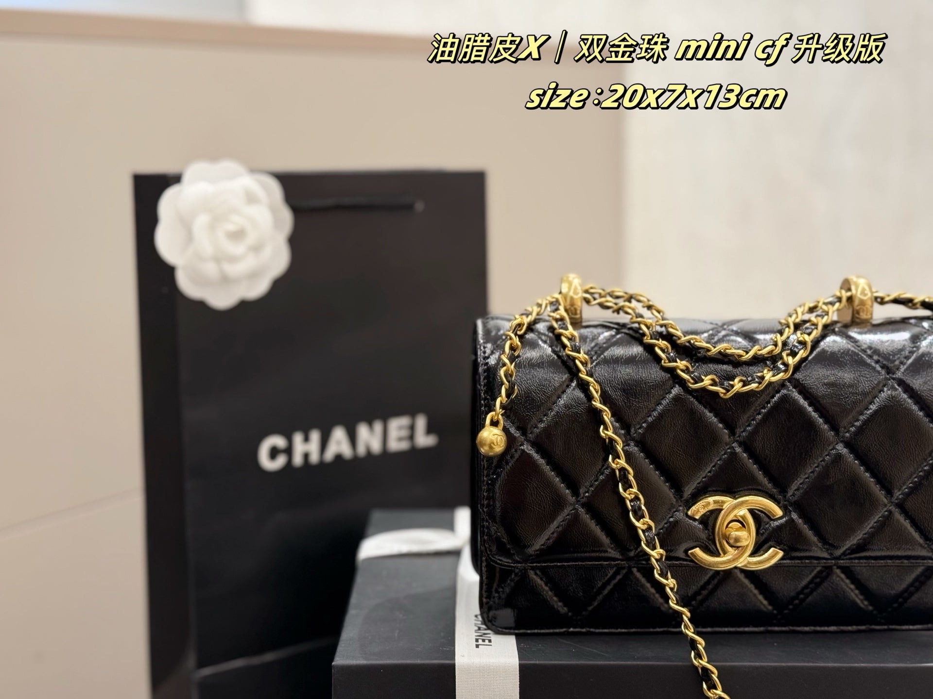 Introducing the upgraded Chanel Mini CF Double Gold Beads Handbag, an essential addition to your collection. This stylish handbag comes with a luxurious folding box and an airplane case, perfect for travel or gifting.