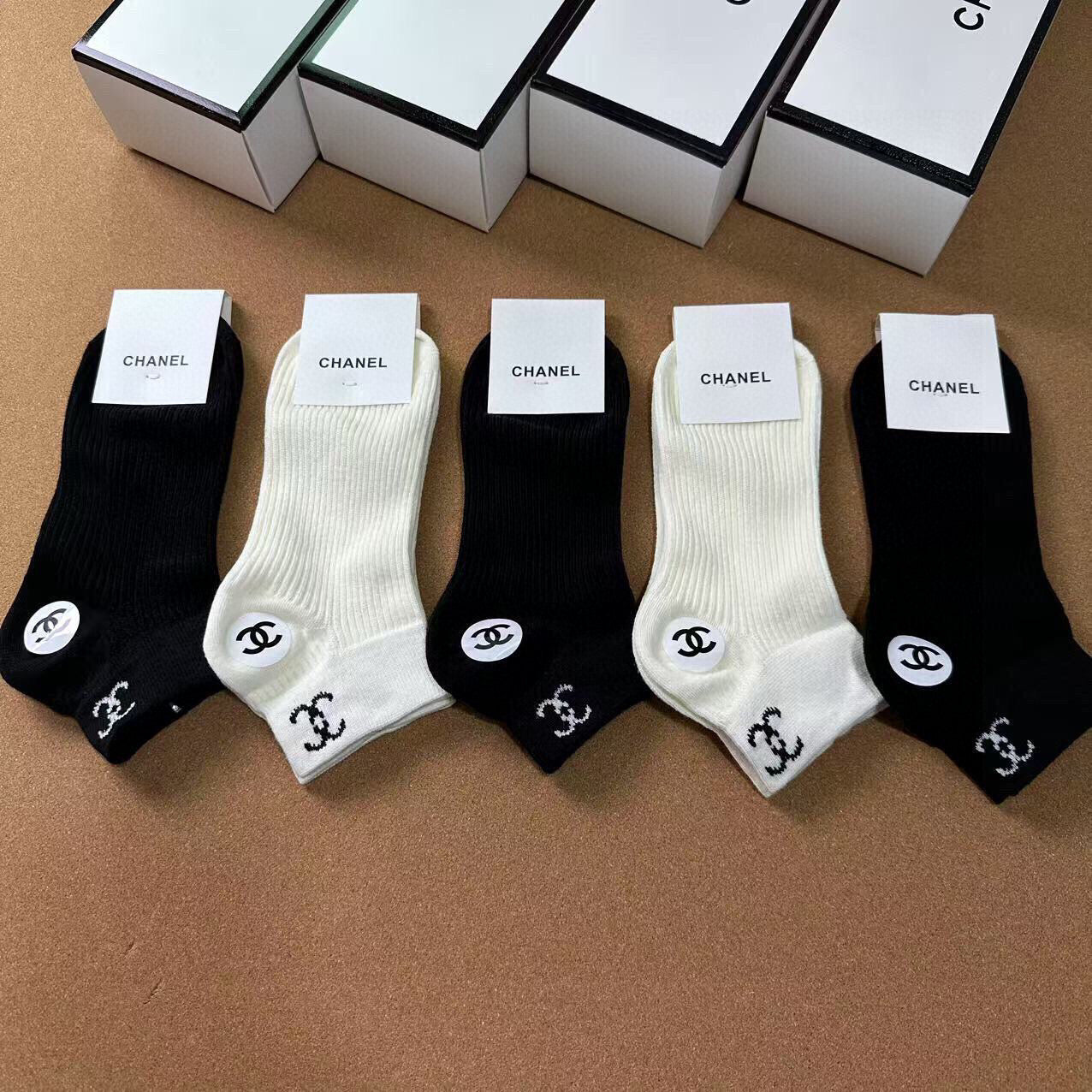 Elevate your wardrobe with this exclusive set of CHANEL women's socks. Designed for fashionistas, this collection includes five pairs of luxurious pure cotton socks, each featuring the classic jacquard Double C logo. Perfect for any occasion, these socks effortlessly complement your outfits while providing unmatched comfort. A must-have accessory for every style-savvy individual!