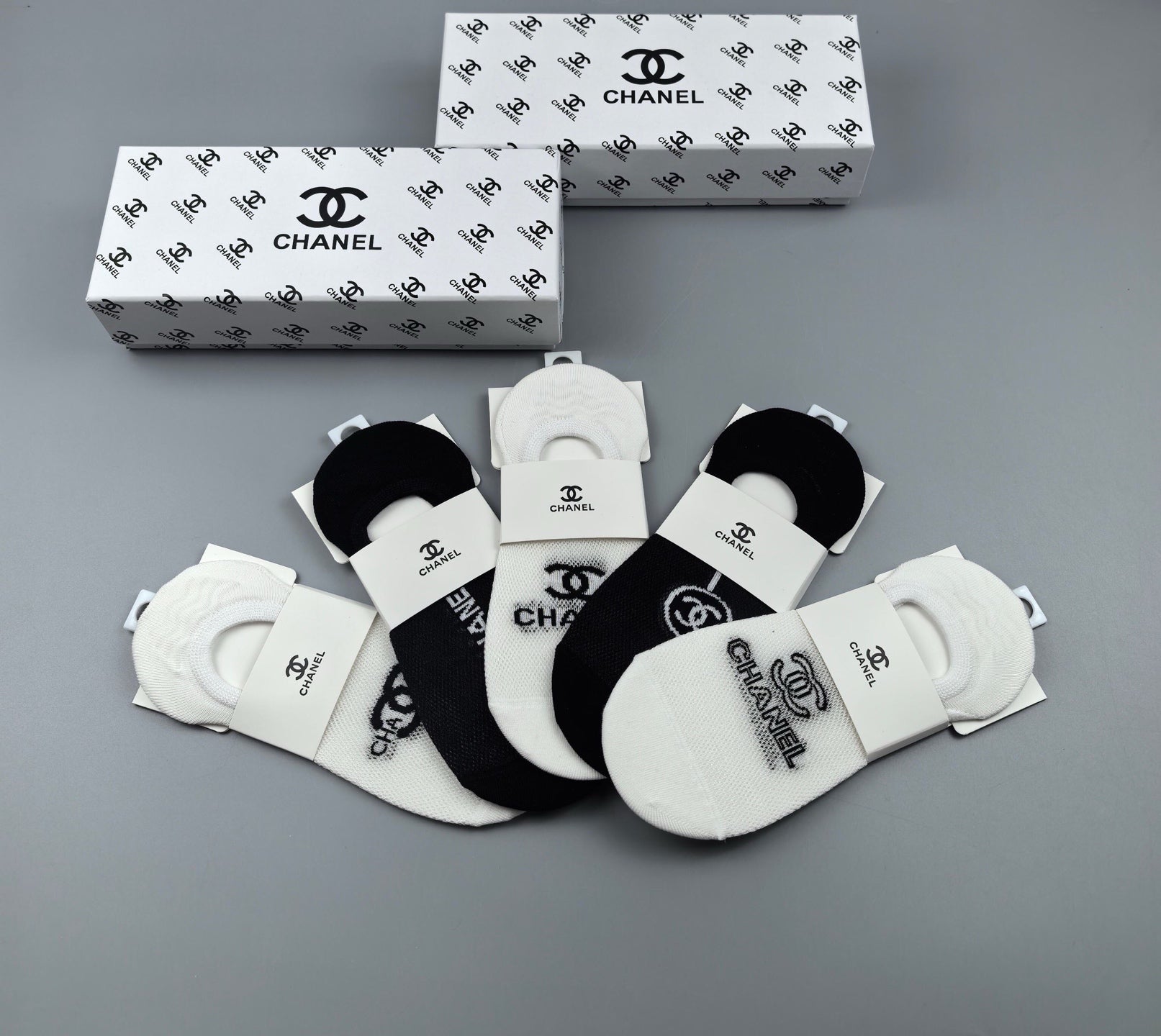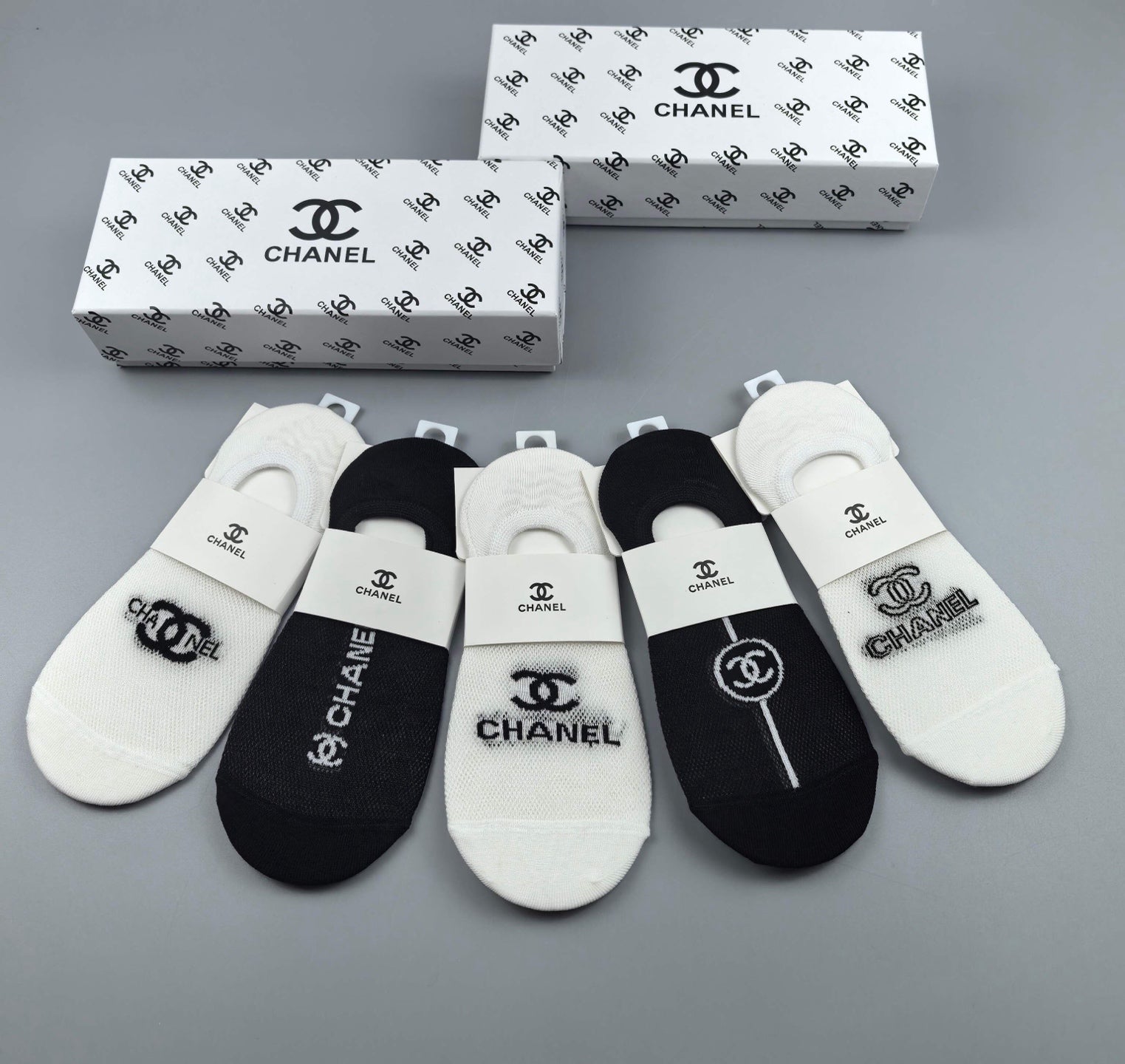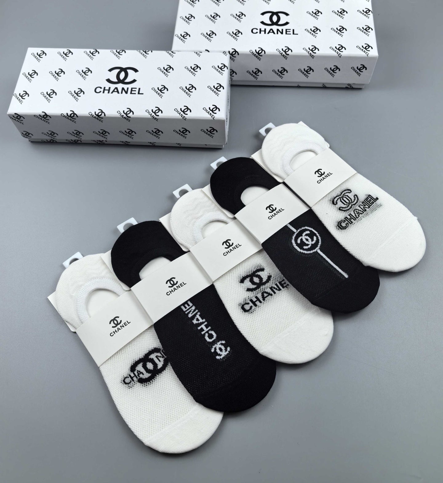 Elevate your wardrobe with the Chanel Women's Invisible Socks. This elegant 5-pair set features the iconic jacquard logo and is crafted from premium pure cotton for exceptional comfort. Perfect for fashion enthusiasts, these socks provide a seamless fit that complements any outfit. Experience the luxury of big brand style every day with these versatile and easy-to-match essentials.