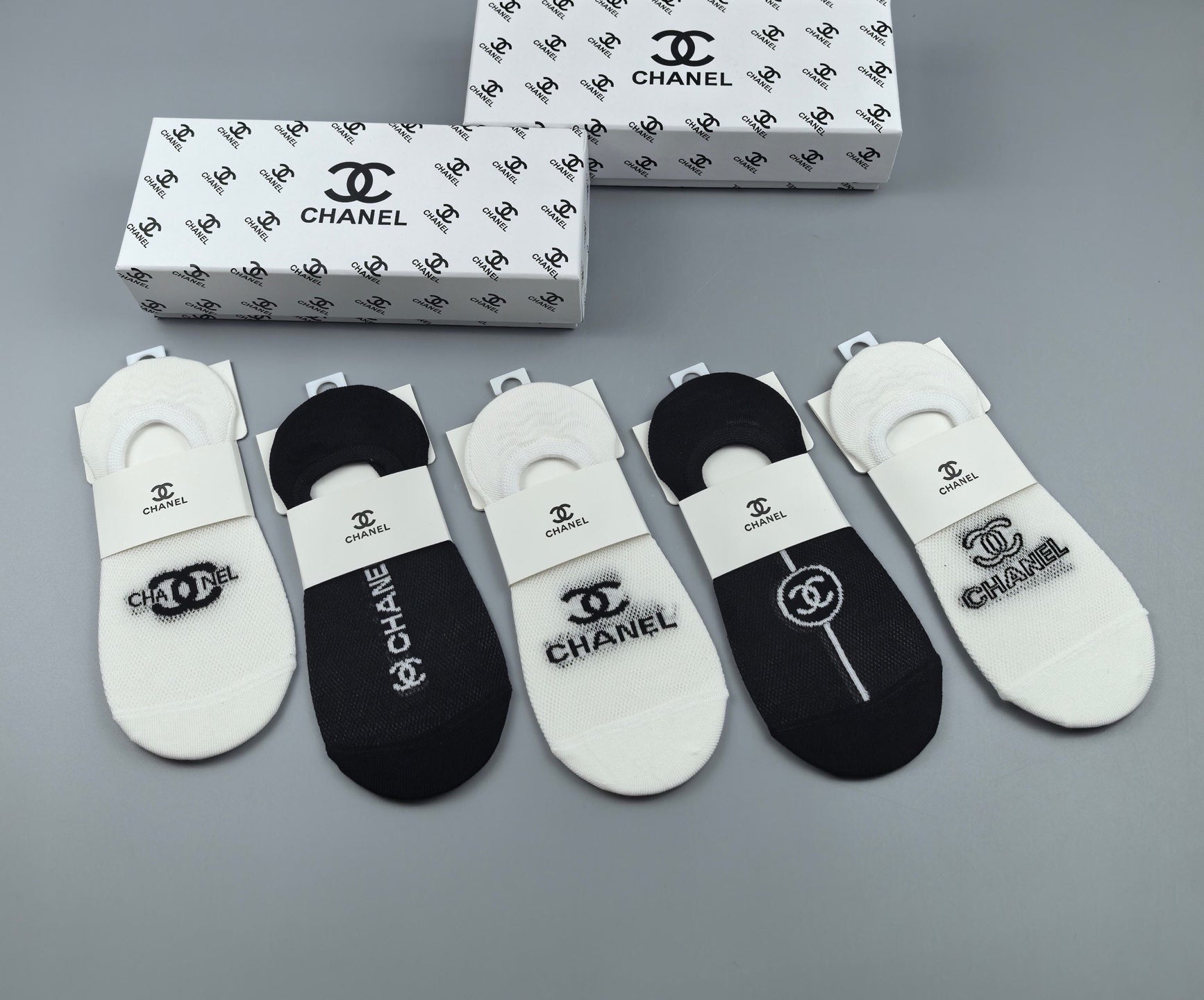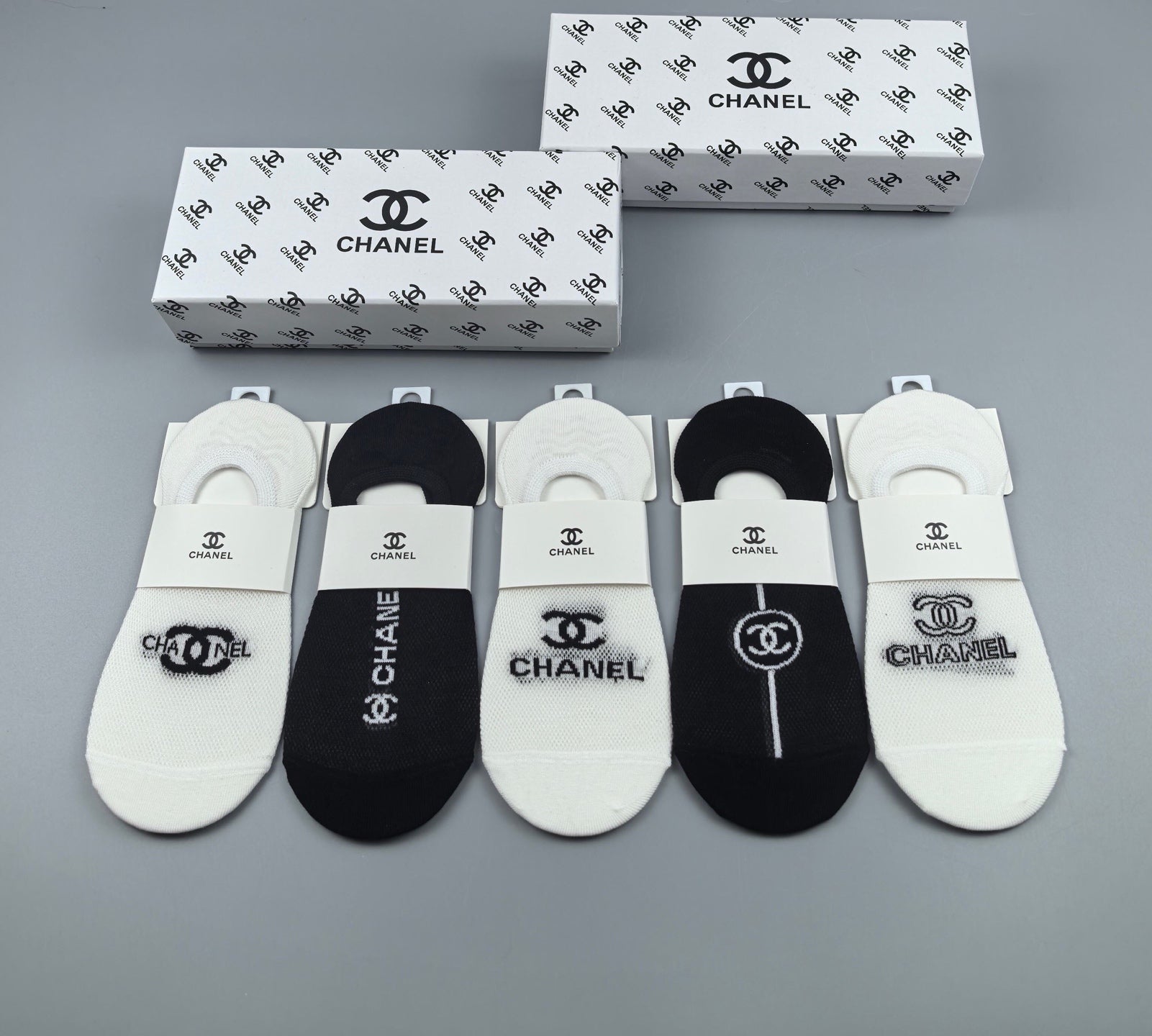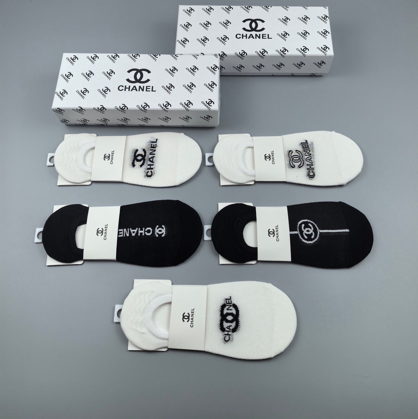 Elevate your wardrobe with the Chanel Women's Invisible Socks. This elegant 5-pair set features the iconic jacquard logo and is crafted from premium pure cotton for exceptional comfort. Perfect for fashion enthusiasts, these socks provide a seamless fit that complements any outfit. Experience the luxury of big brand style every day with these versatile and easy-to-match essentials.