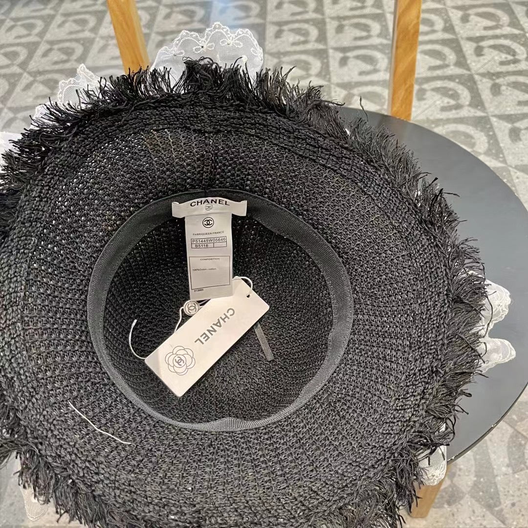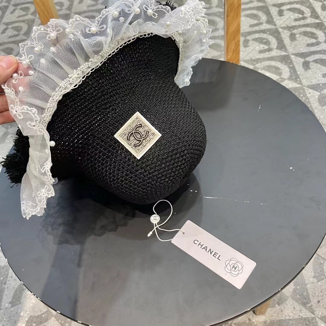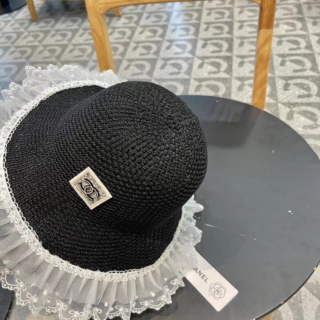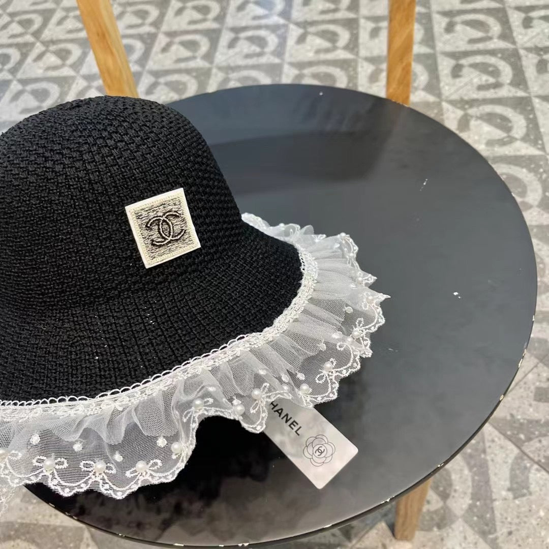 Chanel Women's Pearl Lace Straw Hat - UV Protection Large Brim Summer Beach Hat