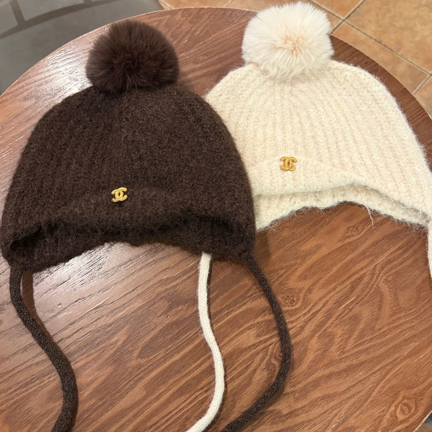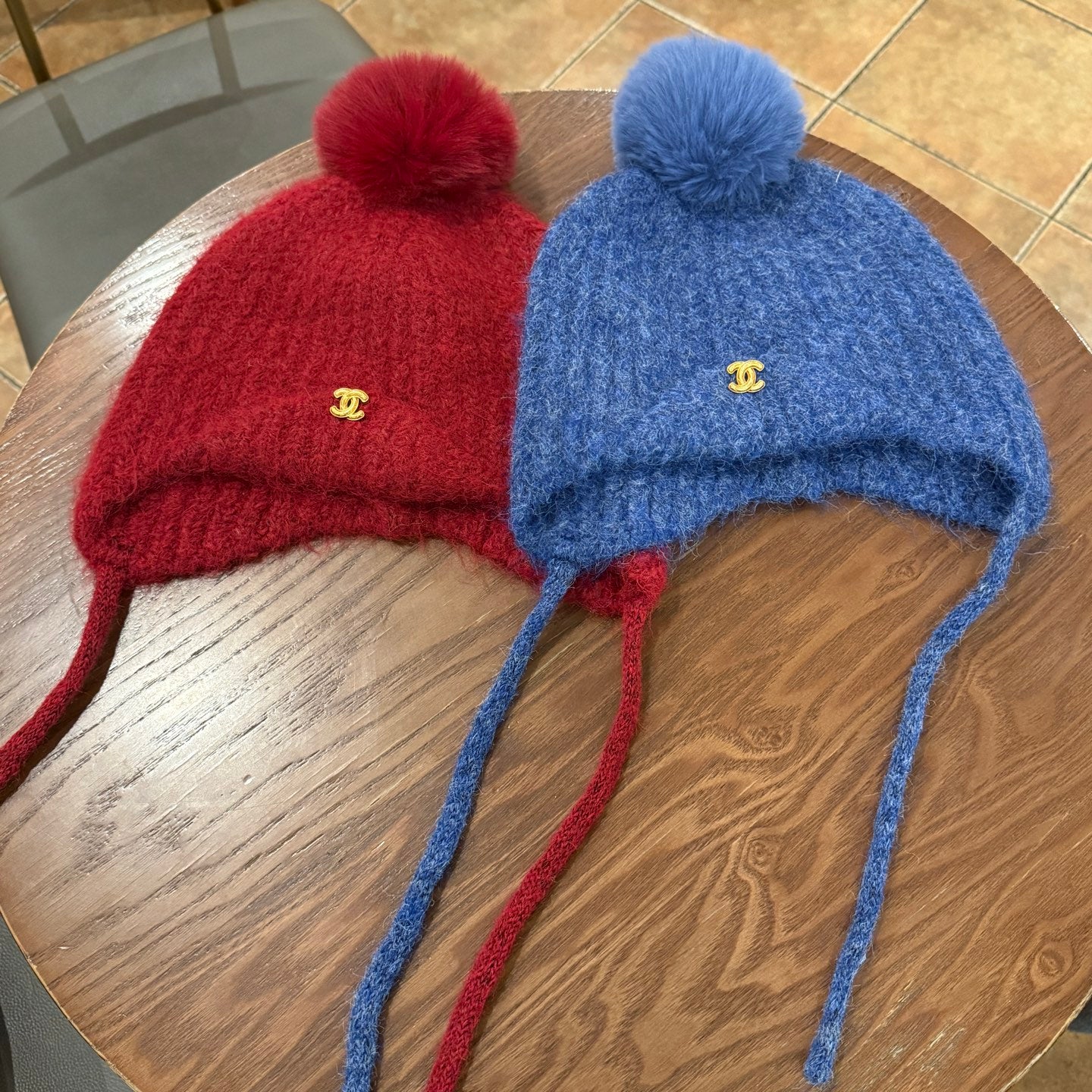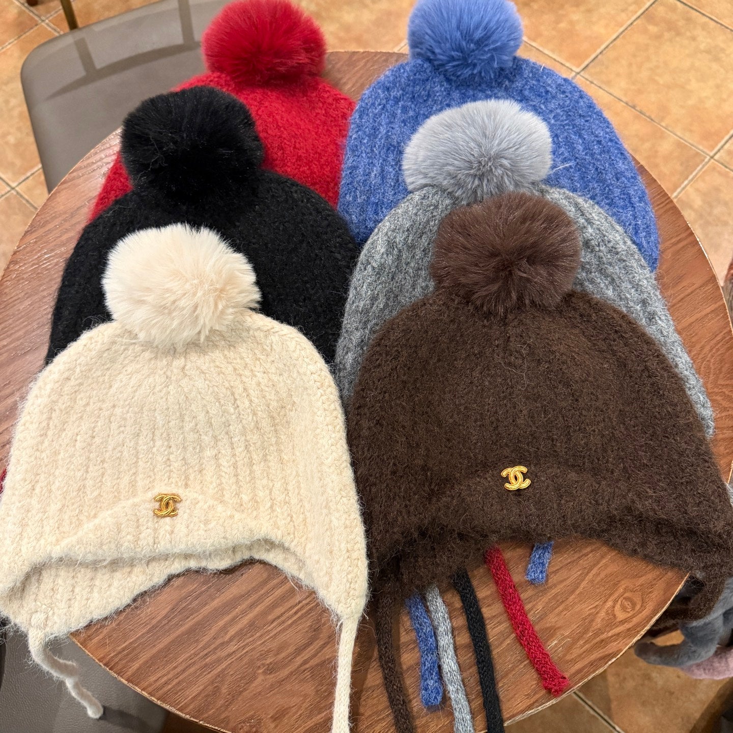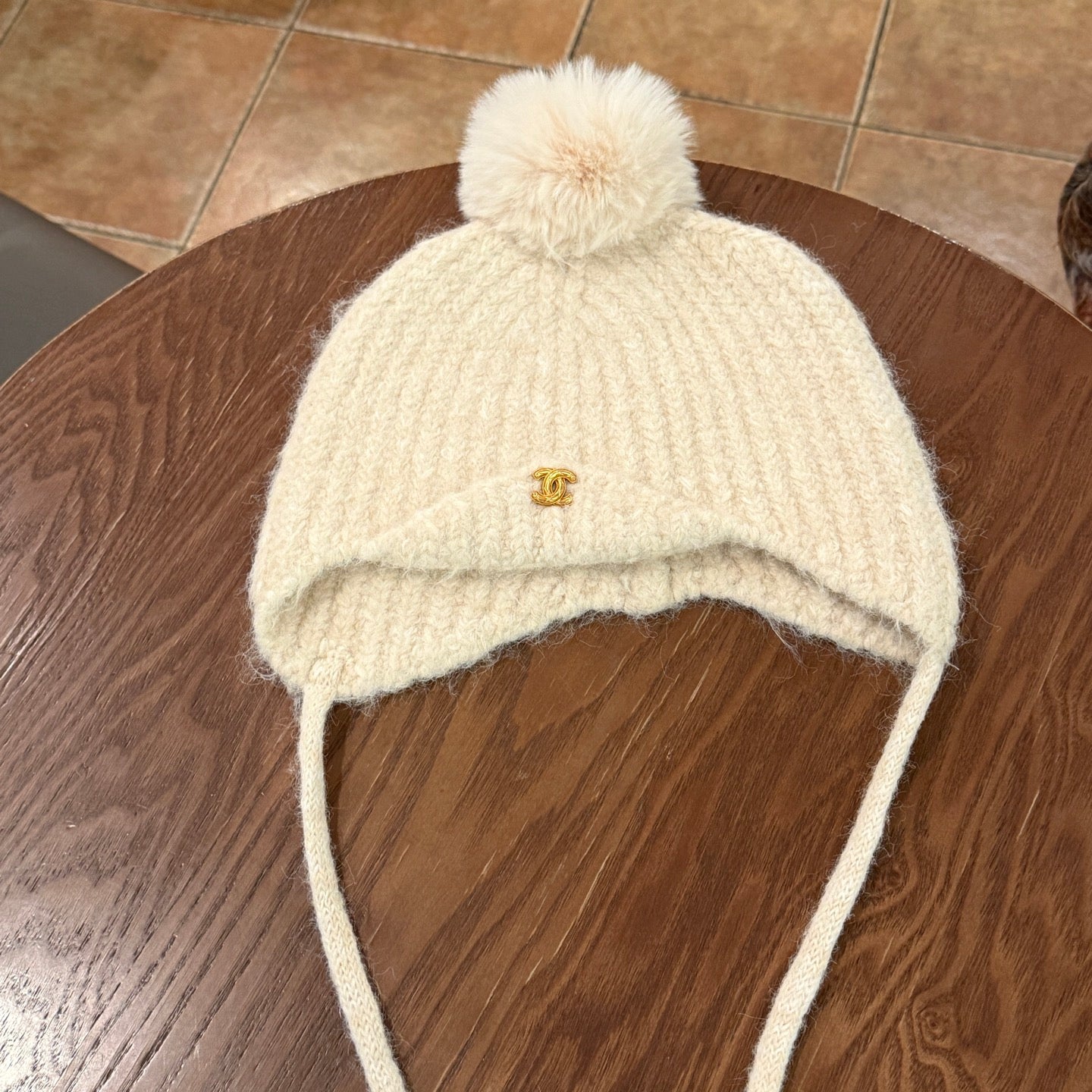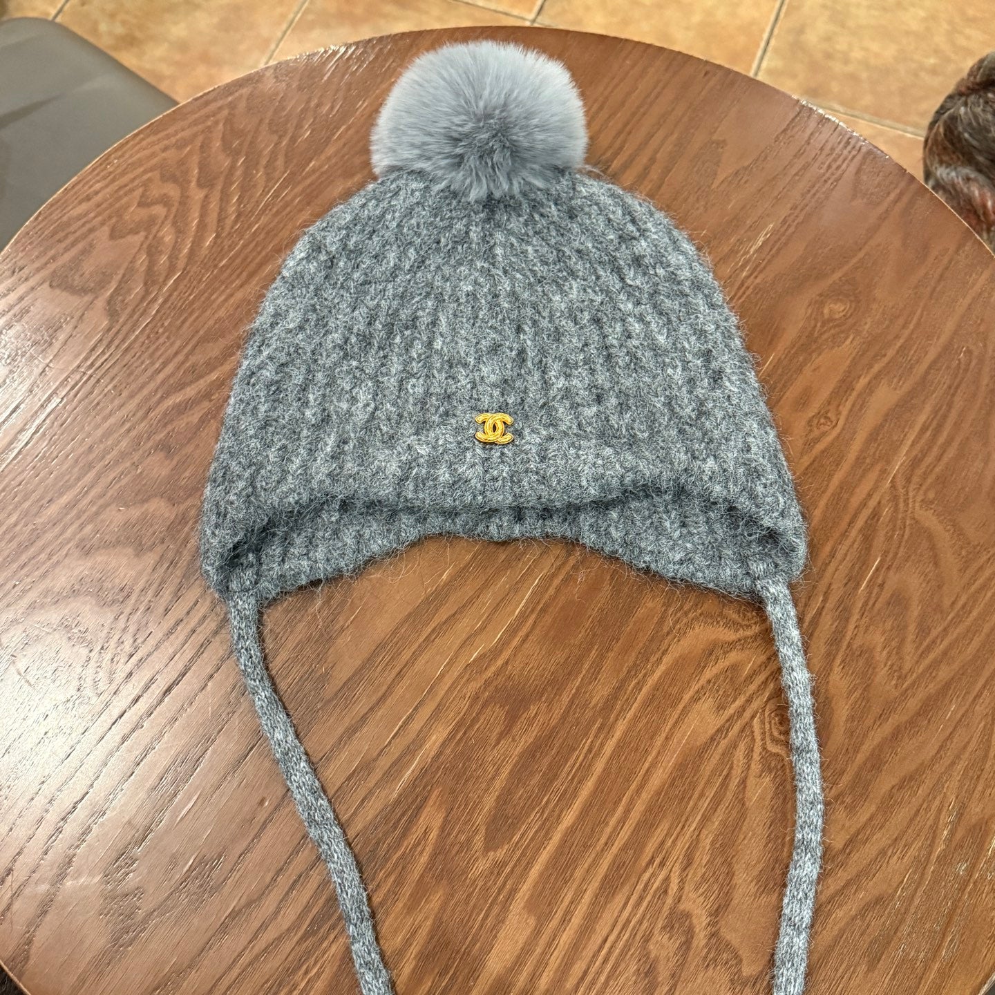 Chic Chanel Knitted Wool Ear Protection Hat with Fur Pom Pom
