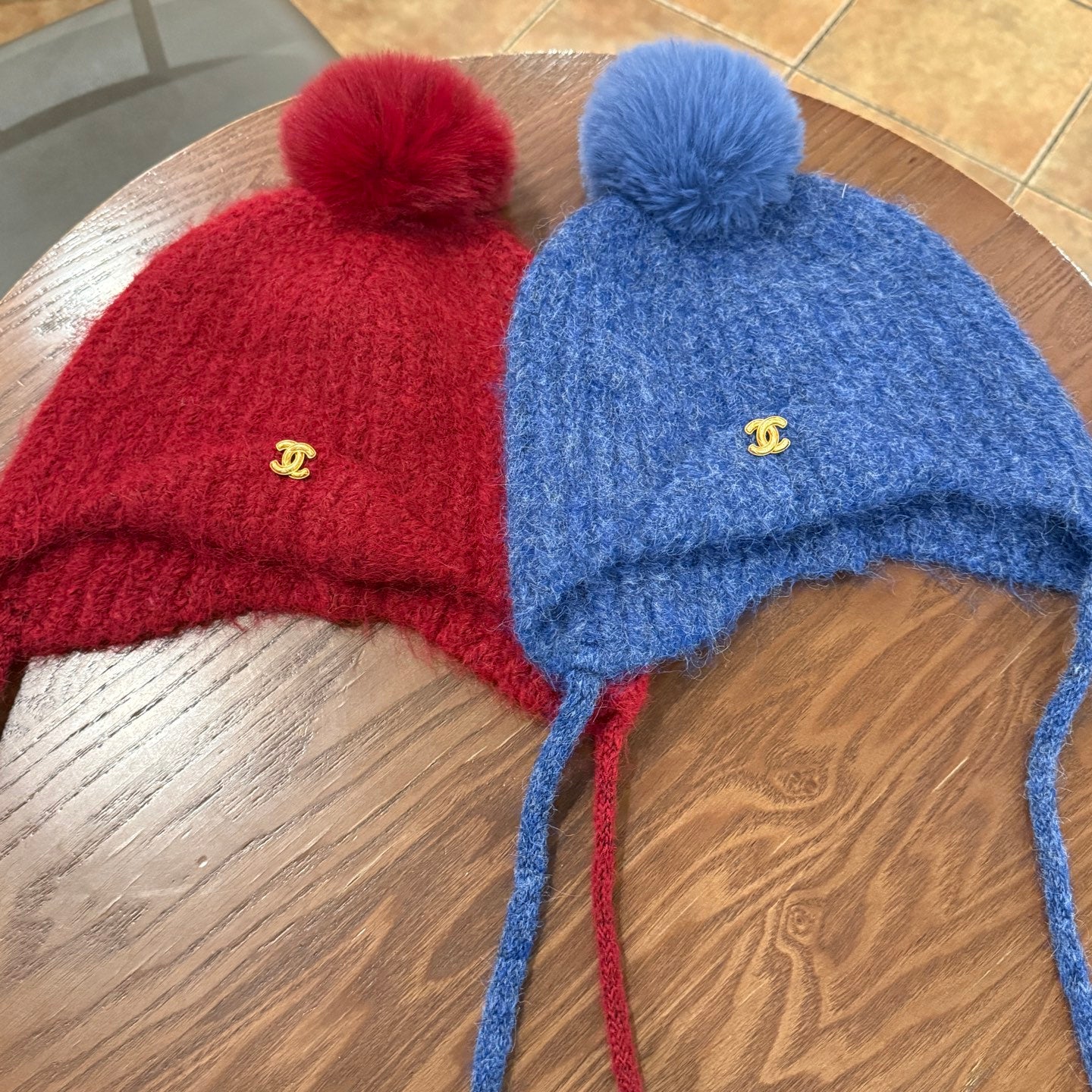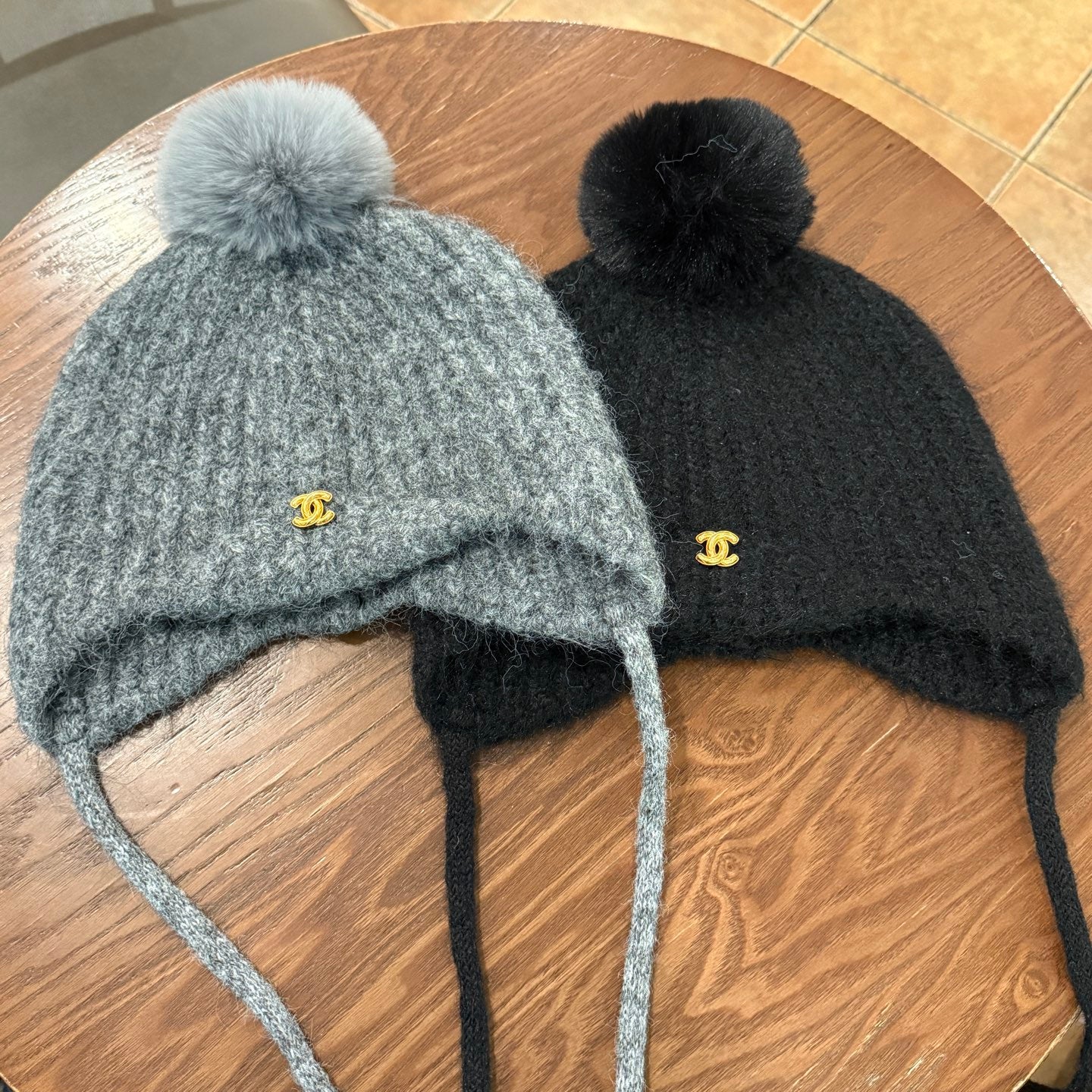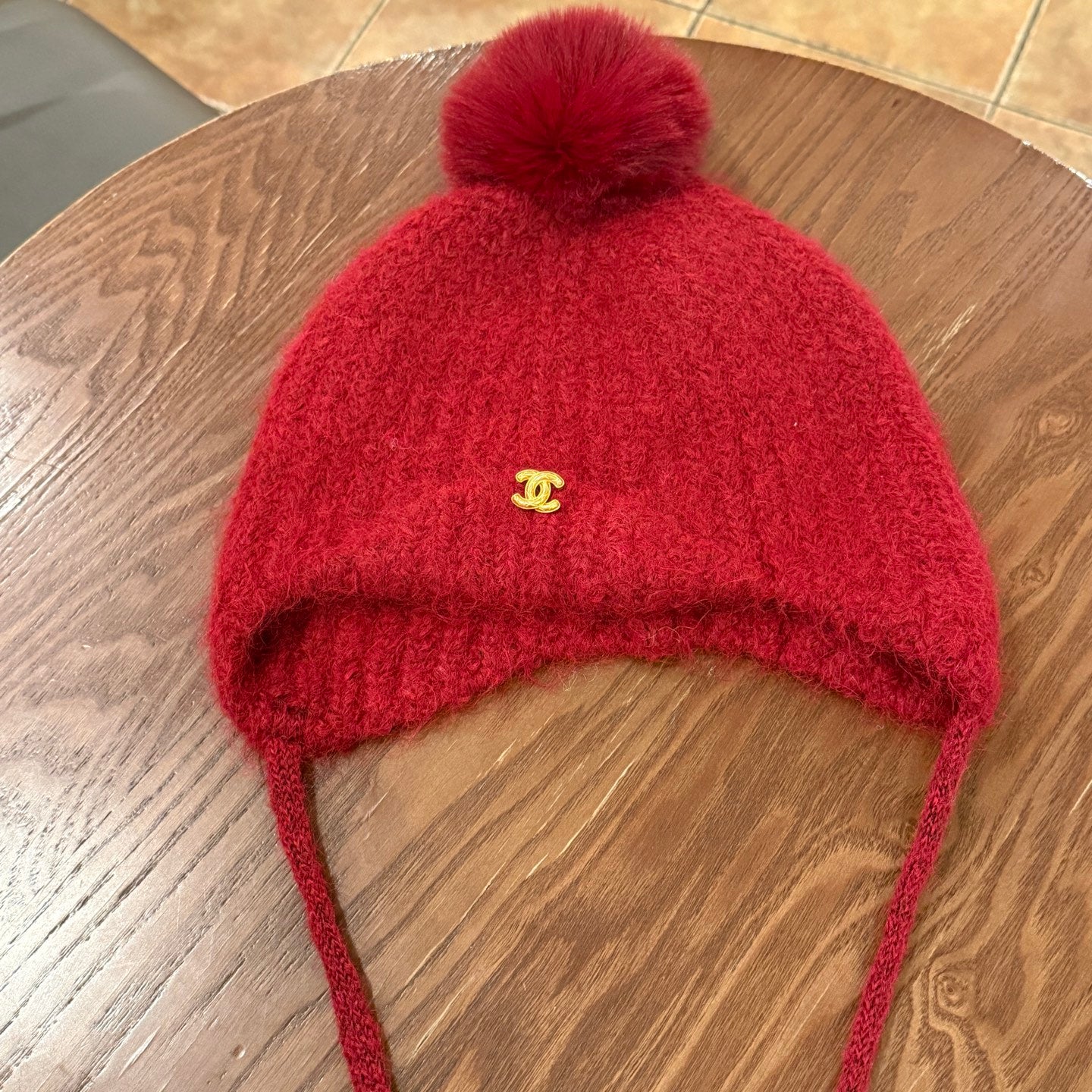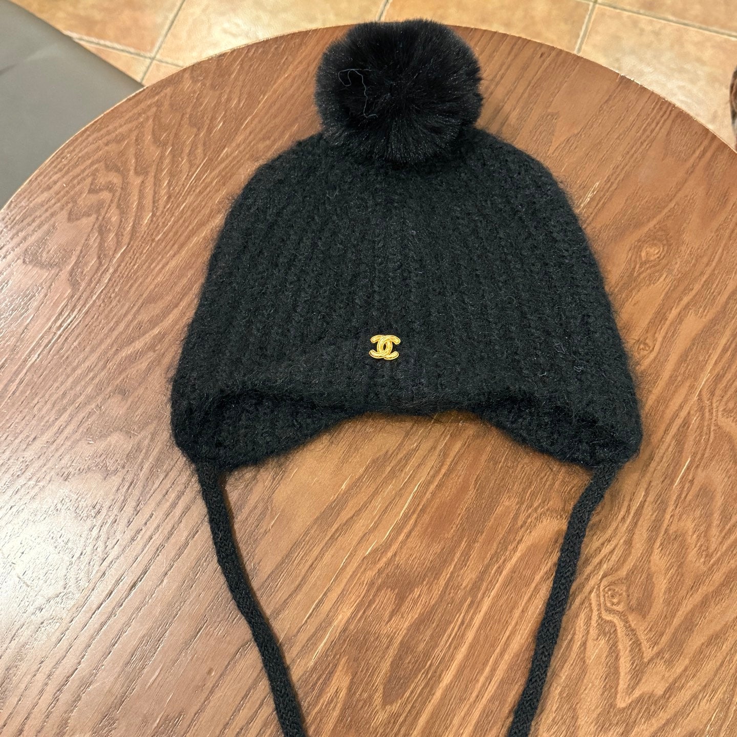 Chic Chanel Knitted Wool Ear Protection Hat with Fur Pom Pom
