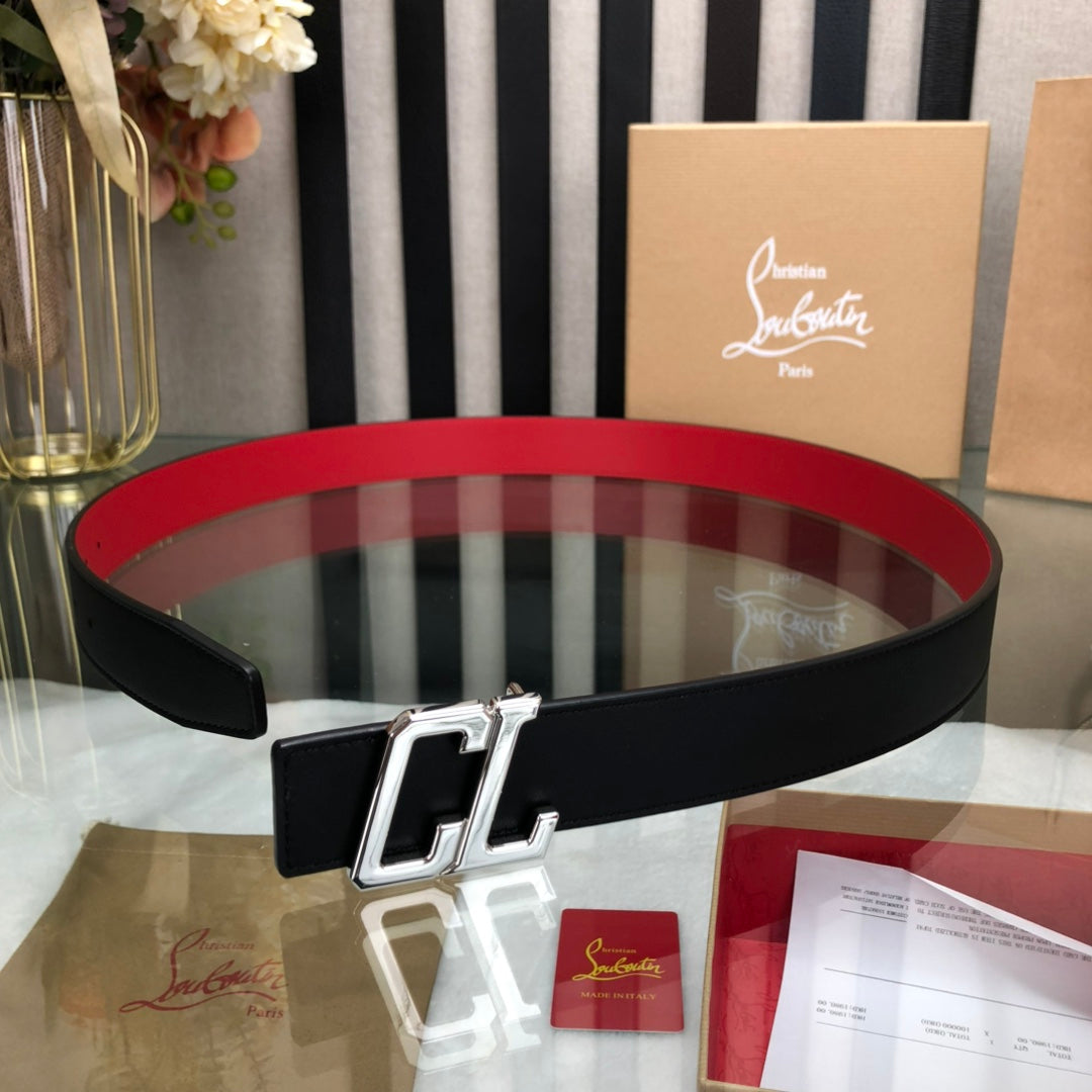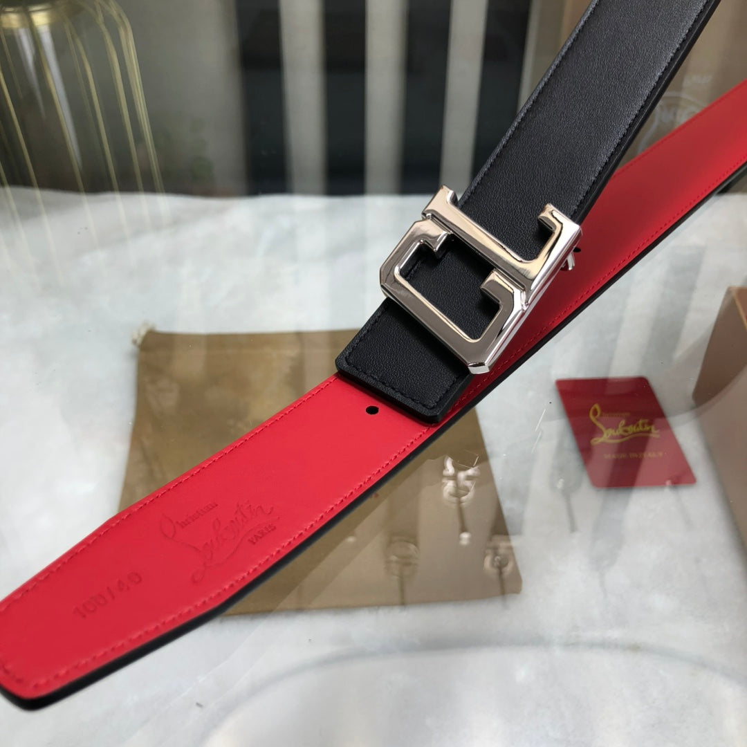 Elevate your style with the Christian Louboutin Men's Belt, featuring a striking black design with a vibrant red base. Crafted from luxurious double-sided cowhide, this belt offers versatility and sophistication. The standout Ricky signature logo buckle adds a touch of elegance to any outfit. Packaged in a 3.5-inch wide box, it makes for the perfect gift or a stylish addition to your wardrobe. Upgrade your accessory game with this timeless piece.
