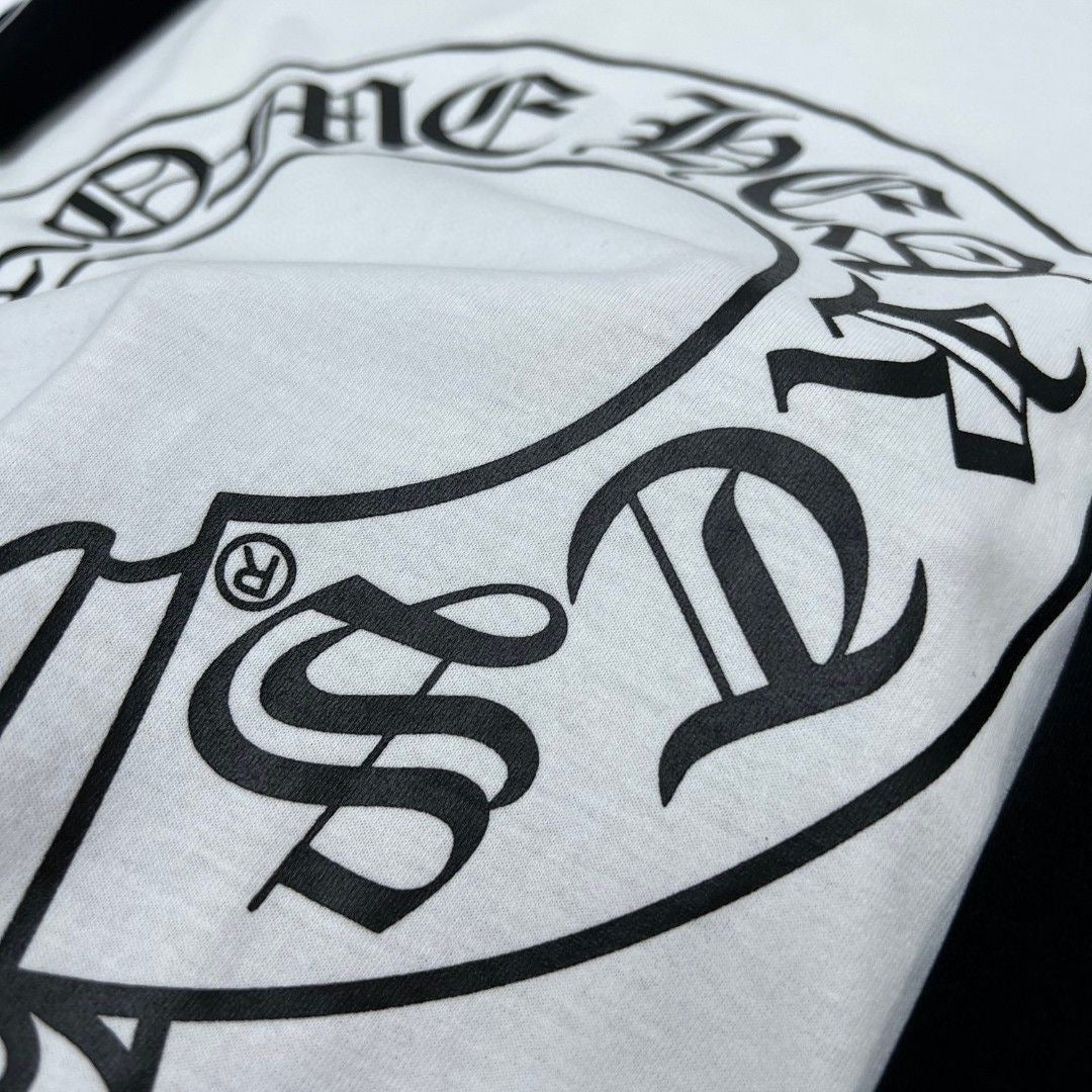 Elevate your streetwear collection with the Chrome Hearts Black and White Raglan Long Sleeve T-Shirt. Crafted from premium 280g double yarn fabric, this top features spliced raglan sleeves adorned with intricate Sanskrit prints, ensuring a unique and refreshing look.