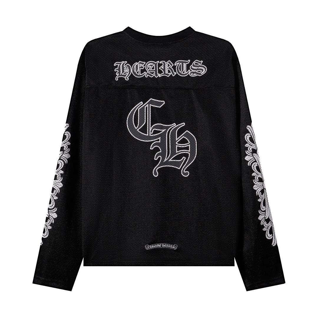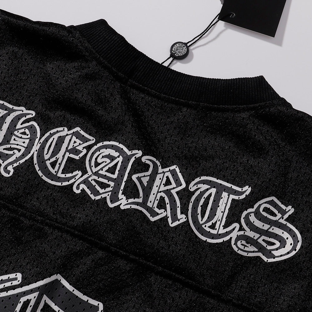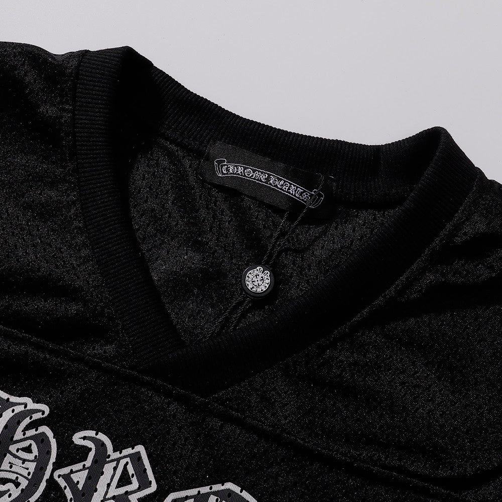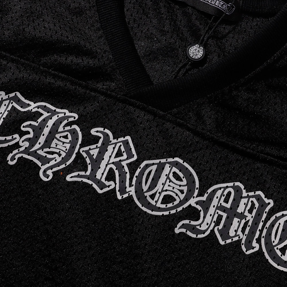 Elevate your wardrobe with the Chrome Hearts Black & White Spliced Raglan Sleeve Long Sleeve T-Shirt. This unique piece features an eye-catching design with raglan sleeves adorned with intricate Sanskrit lettering, showcasing the signature Chrome Hearts aesthetic. The collar is detailed with a classic Gothic font logo for a timeless look and feel.