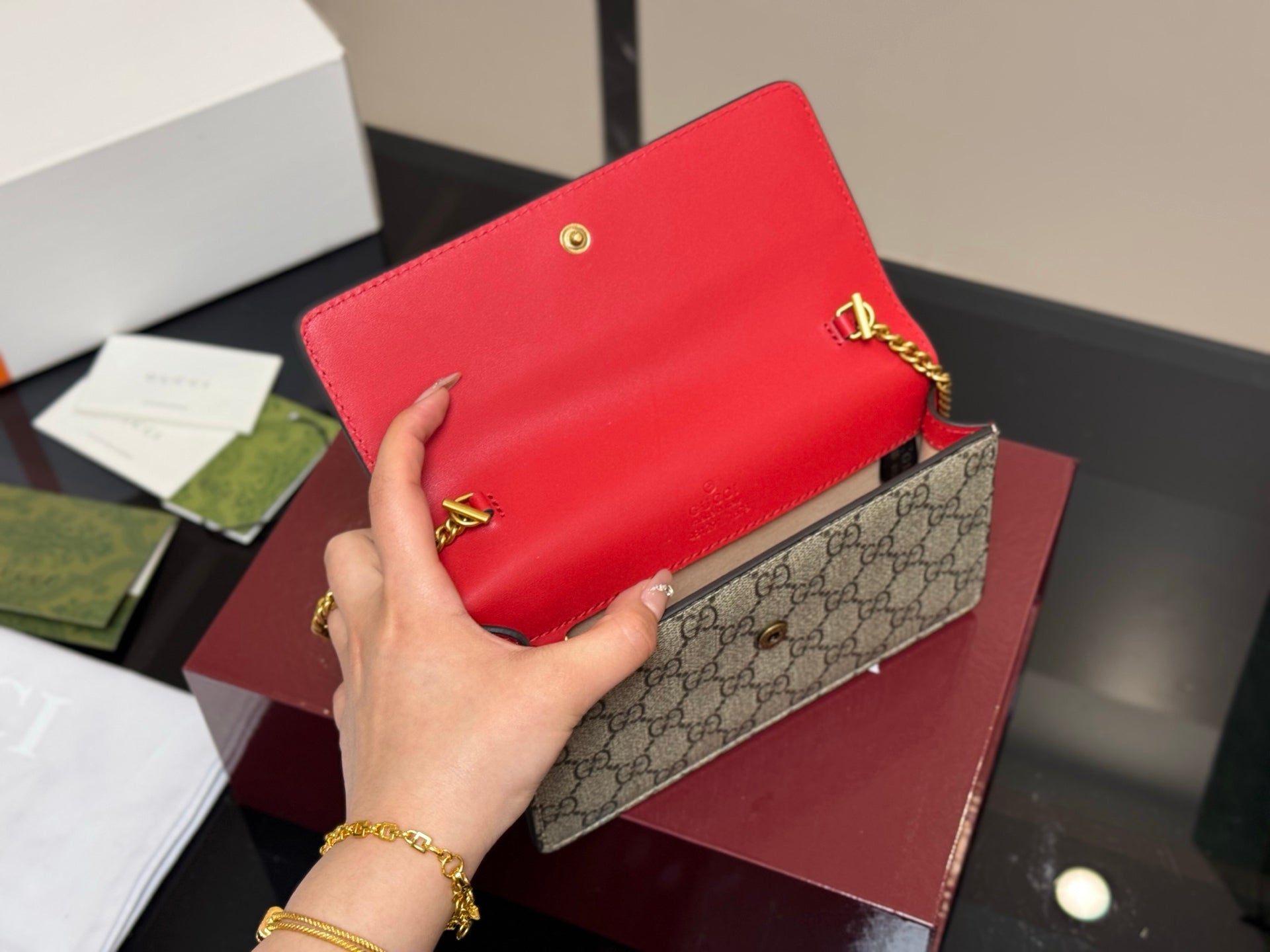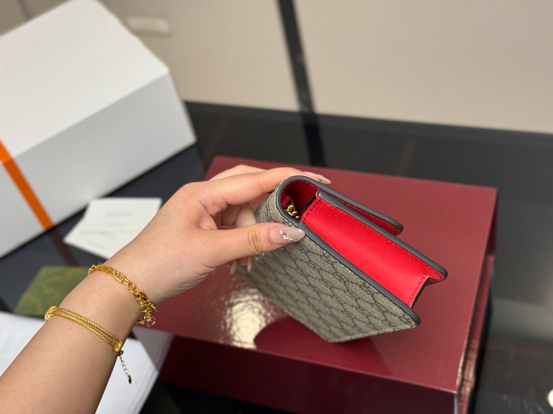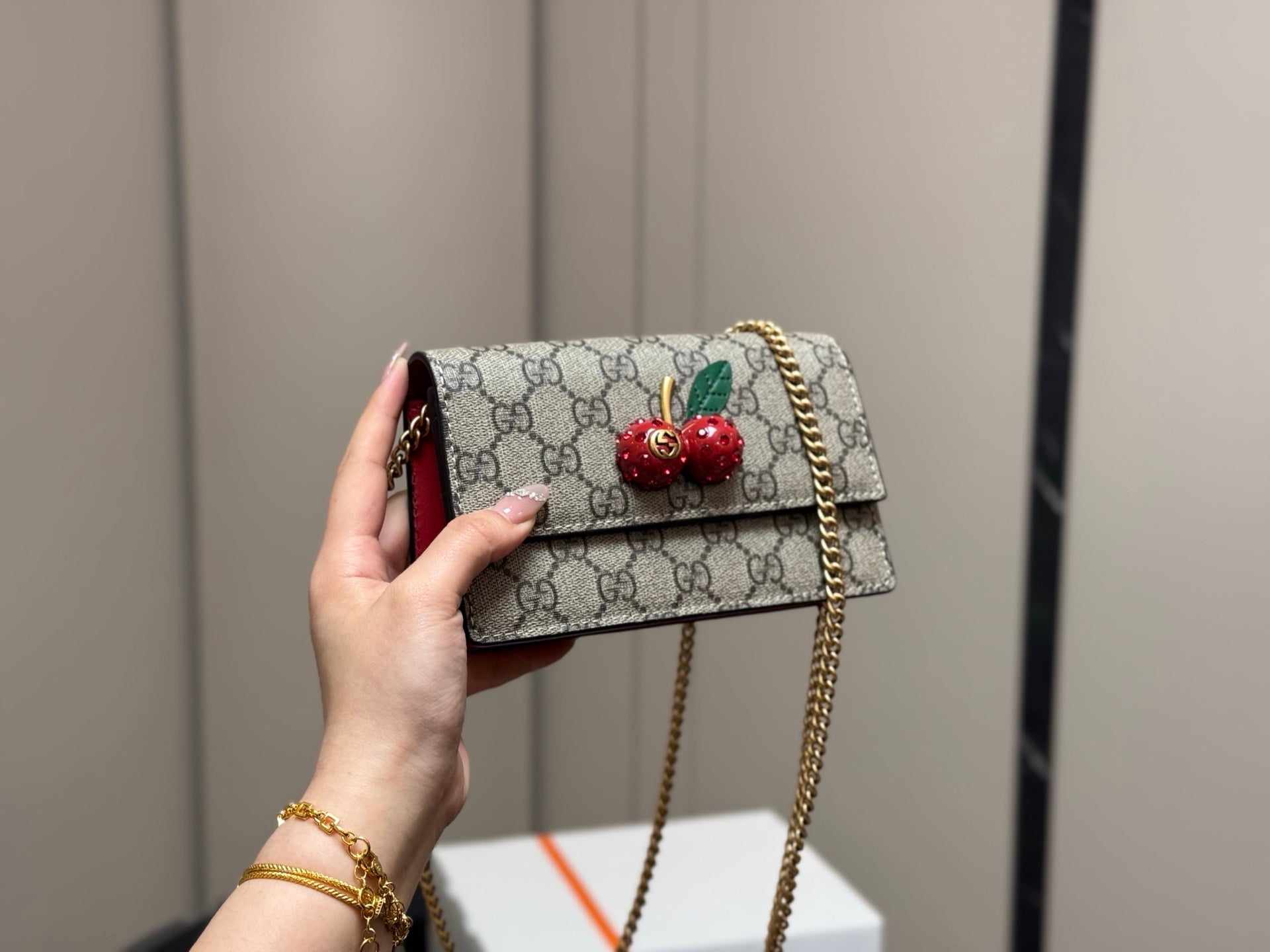 Introducing the adorable GG Cherry Chain Bag, the perfect blend of style and charm! This cute and compact handbag features an exclusive cherry motif that remains a crowd favorite every year. With dimensions of 20x12cm and 17x10cm, it comes equipped with a folding box for easy storage and travel. Elevate your fashion game with this customized version inspired by Gucci, designed to hold your essentials while making a bold statement. Embrace cuteness and functionality with the GG Cherry Chain Bag!