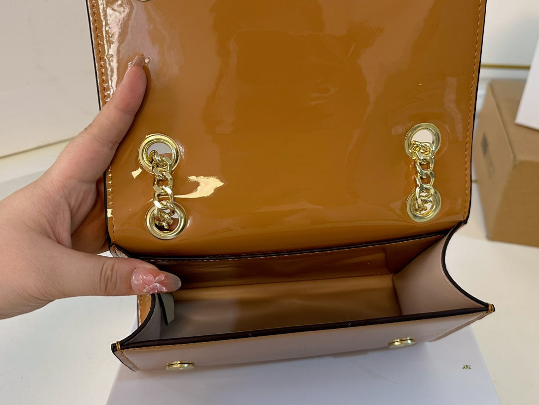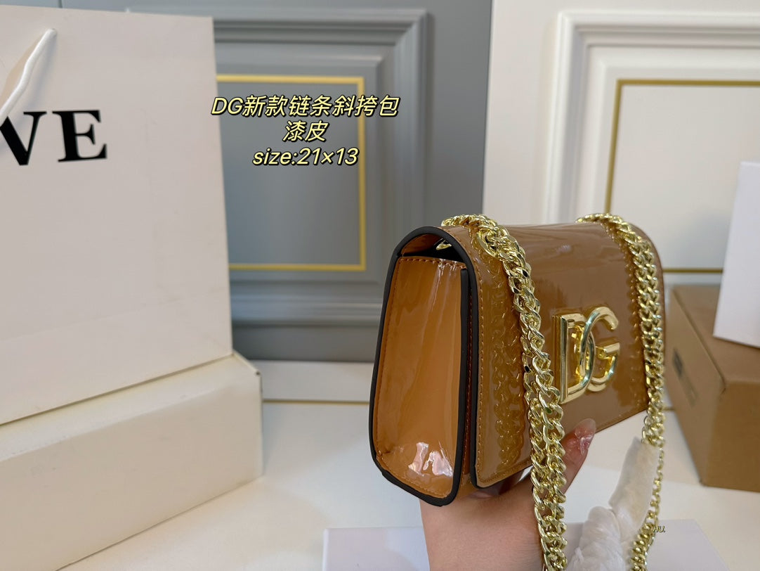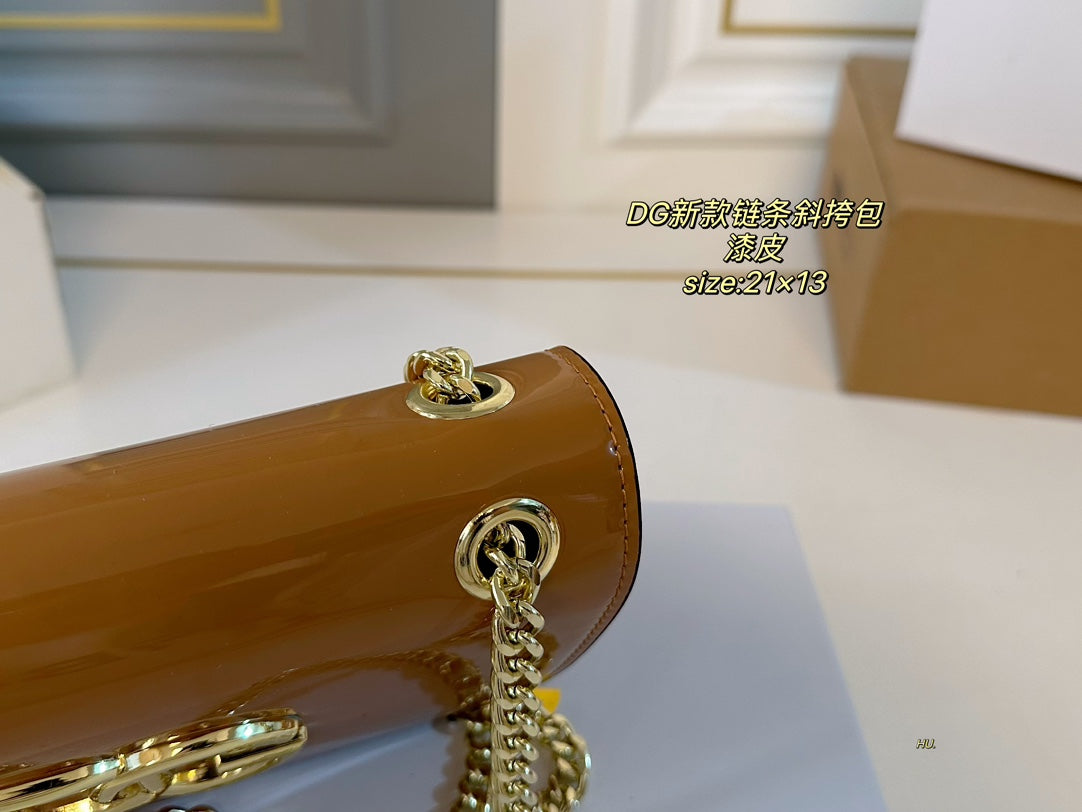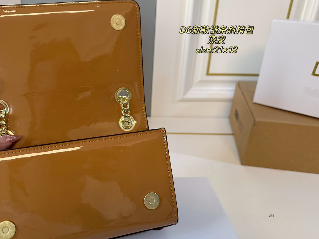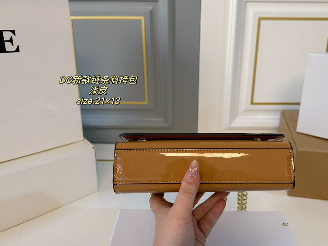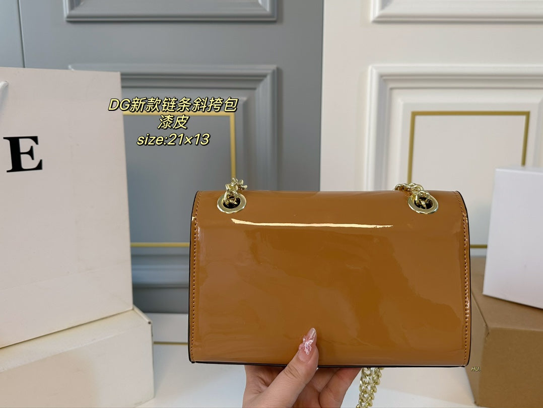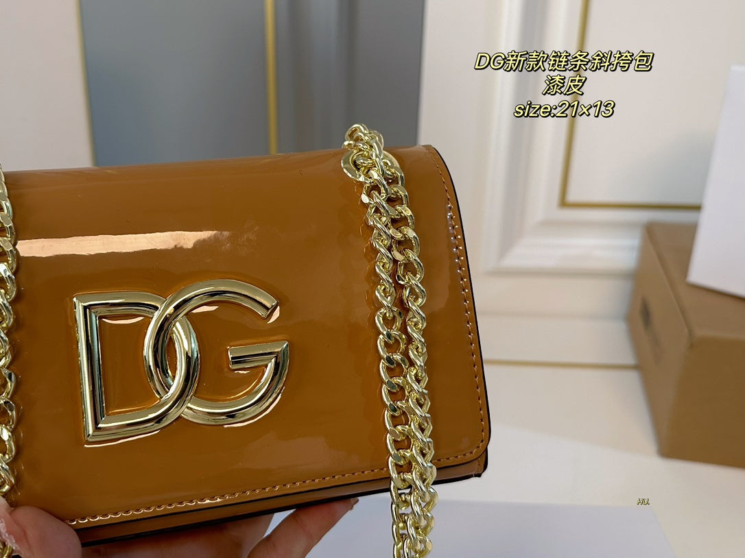 Elevate your style with the D&G Dolce & Gabbana Chain Crossbody Bag, crafted from high-quality patent leather and presented in an elegant box. Measuring 21×13 cm, this bag features the iconic DG logo, making it instantly recognizable. Its three-dimensional and straight design exudes a modern, minimalist aesthetic that seamlessly integrates retro chic with contemporary fashion.