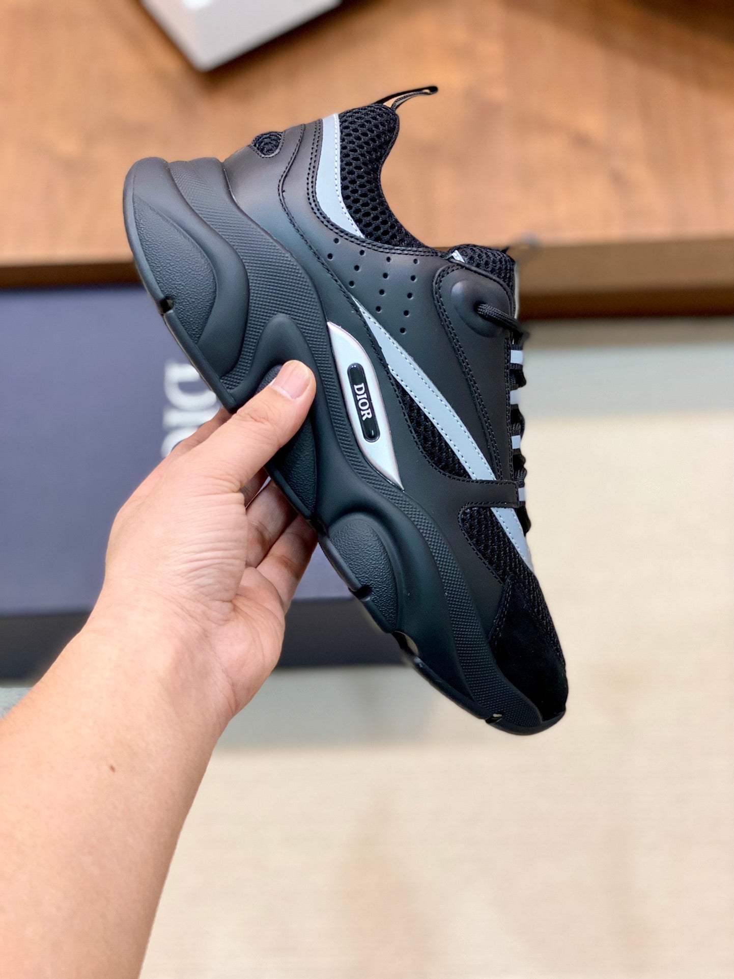 A sleek black mesh fabric tongue and heel counter complement the black laces, while an embossed "Di~r" logo on the side adds a touch of sophistication. Perfect for a sporty chic look, these versatile sneakers can easily be paired with your favorite classic suit.