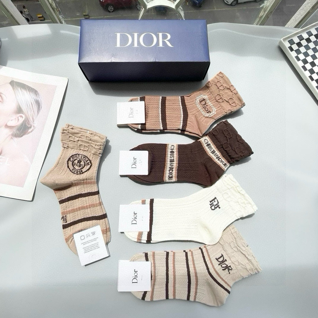 Elevate your sock game with our exclusive Dior Mid-Calf Fashion Socks, available in a stylish 5-pair box set. Designed for both men and women, these high-quality socks blend comfort and luxury, making them a must-have for fashion enthusiasts. Perfect for pairing with any outfit, they offer a chic way to express your individual style. Enhance your wardrobe with these fashionable mid-calf socks that are sure to leave a lasting impression. Ideal for everyday wear or special occasions, these socks are the ultimate accessory for discerning trendsetters. Don’t miss out on this essential addition to your fashion collection!