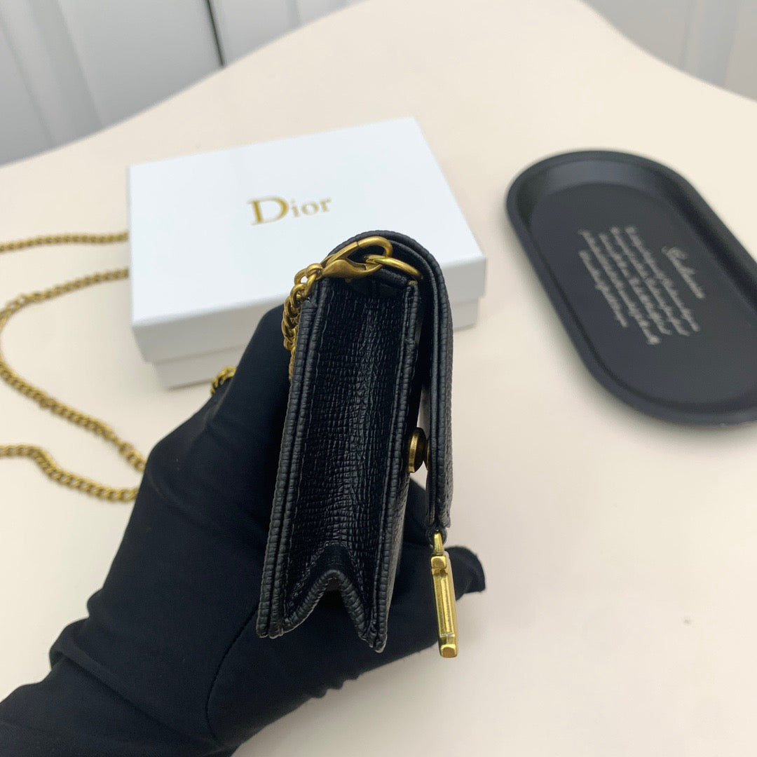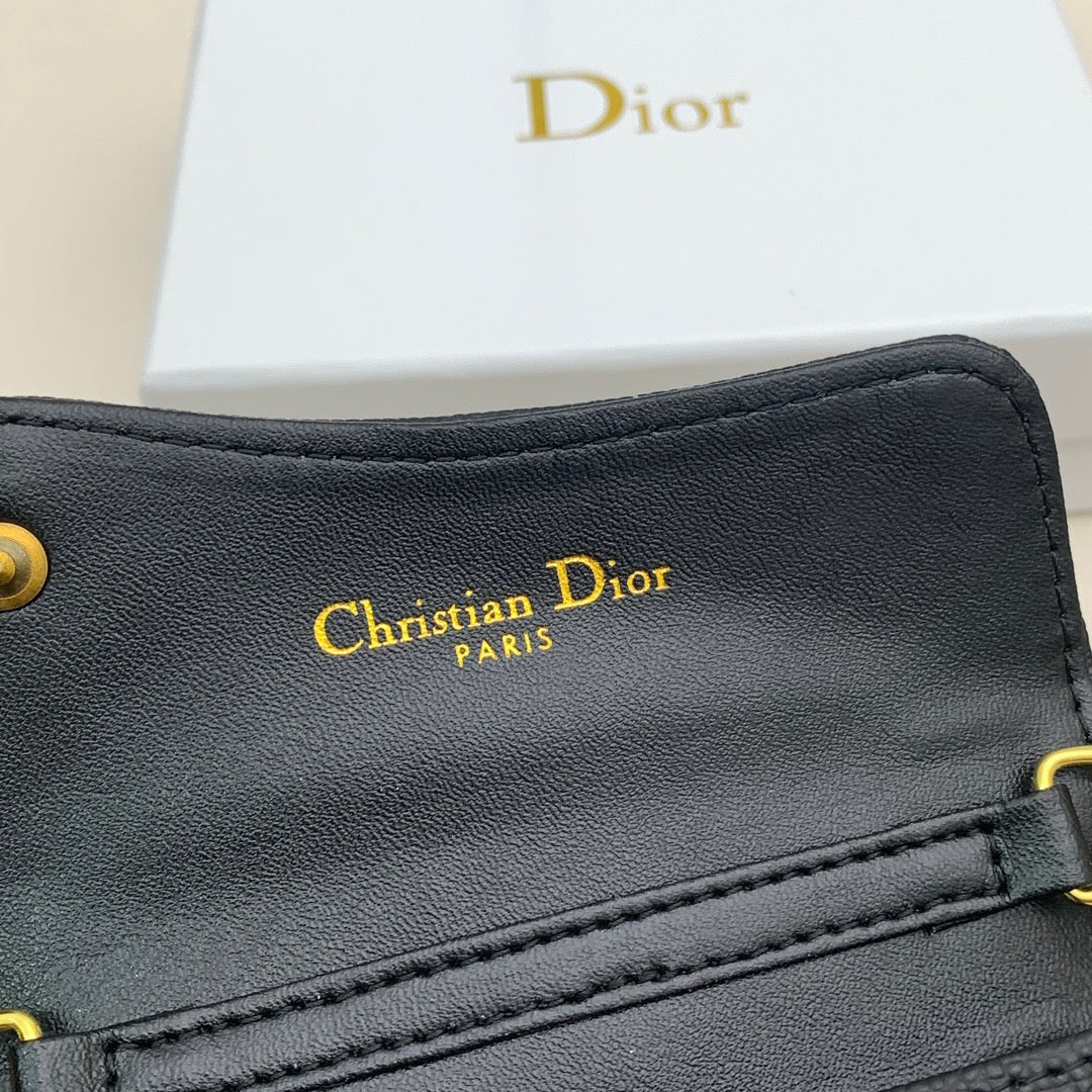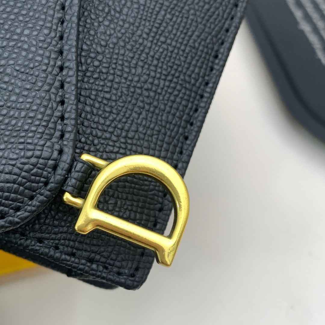 Introducing the Dior Saddle Bag in classic black, designed for the modern individual. Measuring 10.5" x 7", this compact bag is ideal for everyday essentials, easily accommodating a dozen cards and cash. Crafted from premium imported calfskin and adorned with elegant bronze "D" accents, this bag seamlessly blends retro charm with contemporary style. Perfect for any occasion, elevate your accessory collection with this exquisite piece today!