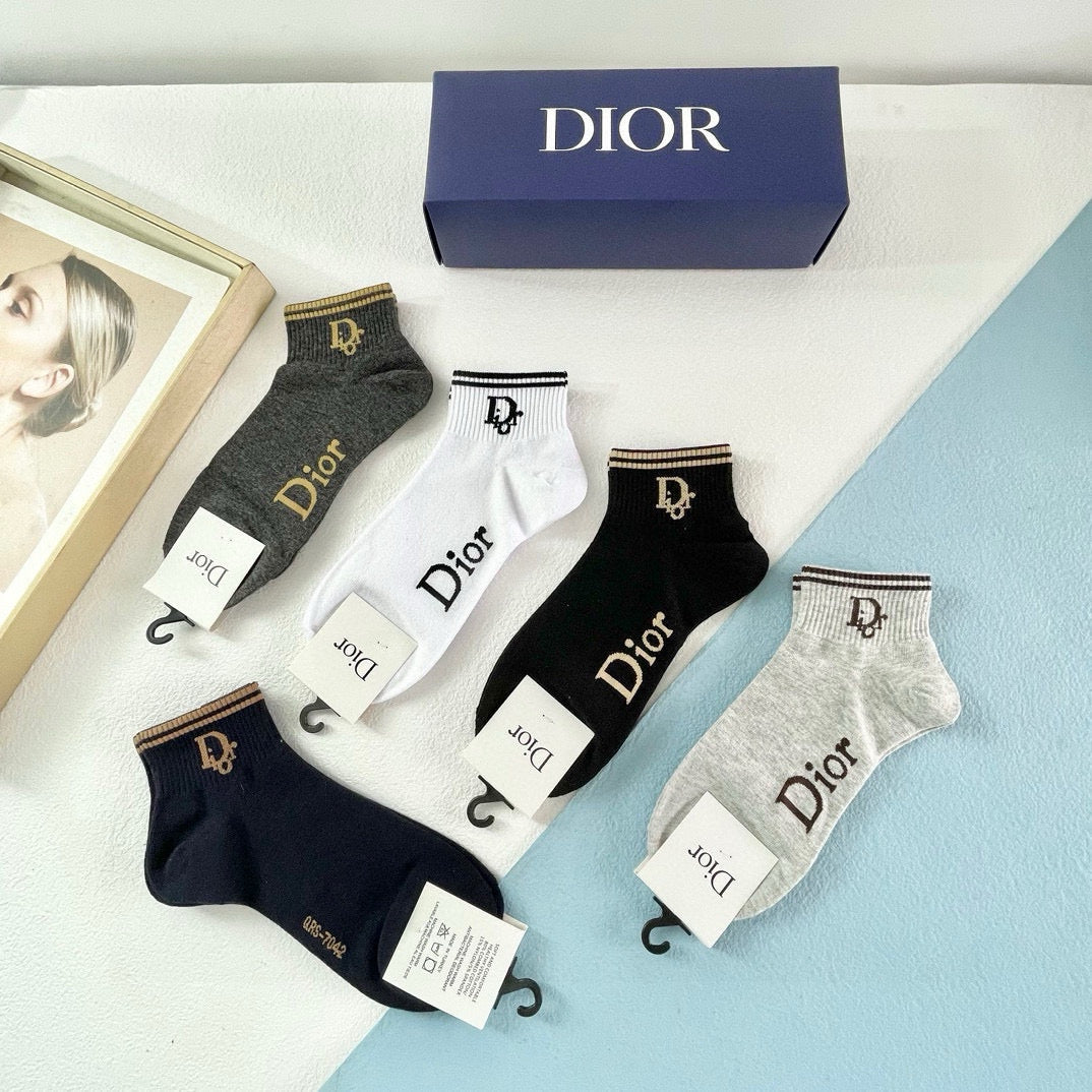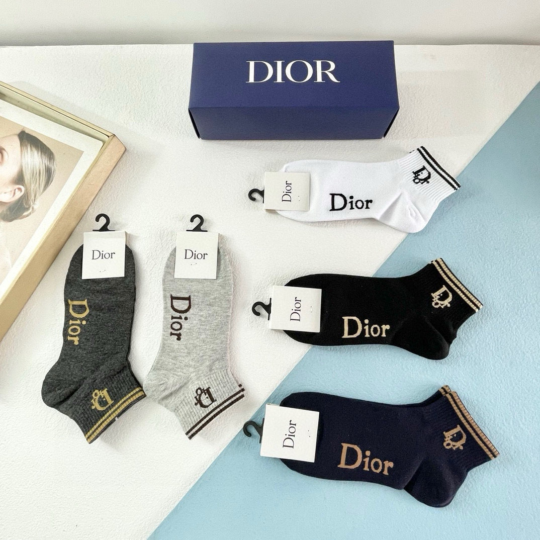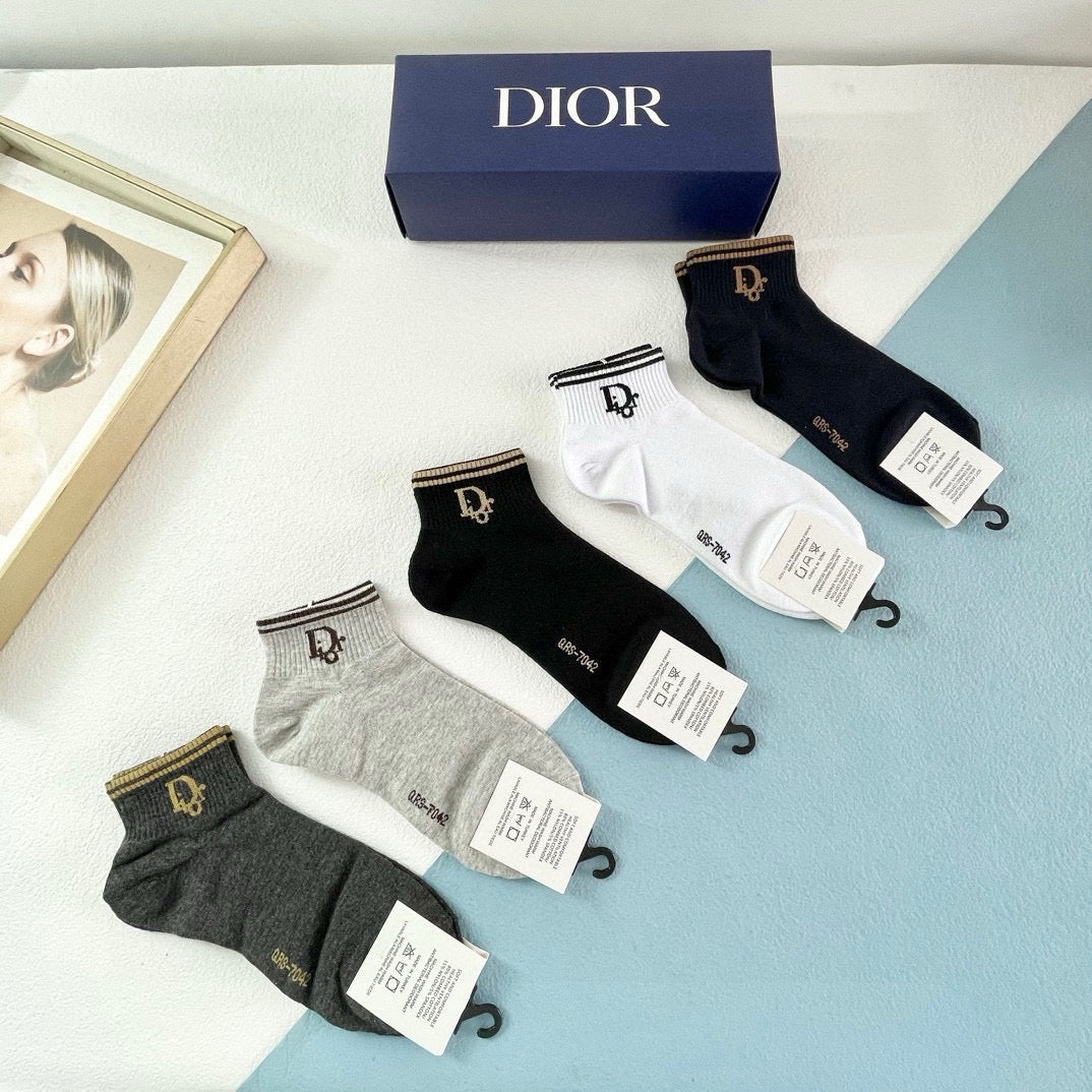 Elevate your accessory game with our DIOR Vintage Logo Tattoo Socks. Each box includes five stylish pairs that blend retro charm with modern fashion. These short-style socks feature a classic logo design, making them a must-have for any fashionista looking to express their personal style. Versatile and chic, they are perfect for dressing up or adding a unique twist to your everyday look. Treat yourself to this iconic collection and step out in style!
