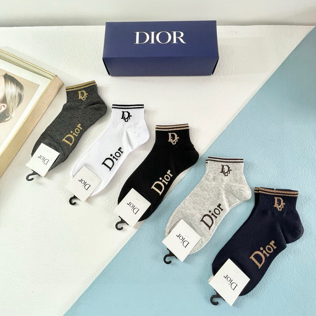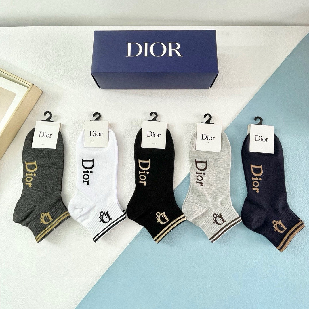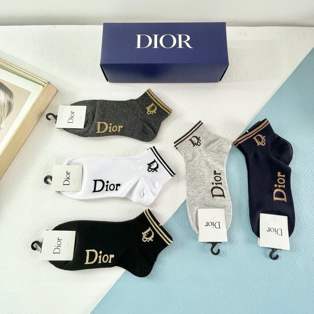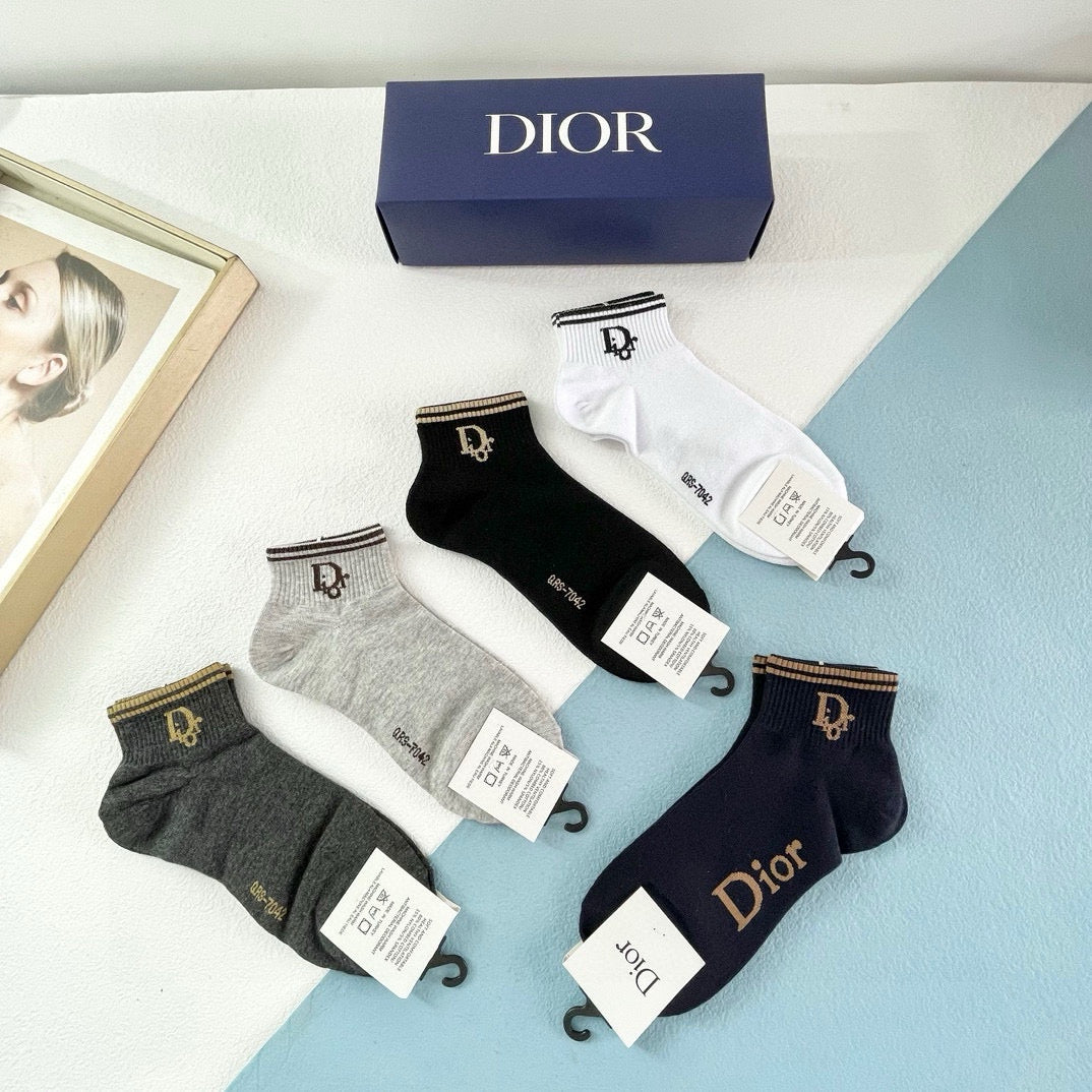Elevate your accessory game with our DIOR Vintage Logo Tattoo Socks. Each box includes five stylish pairs that blend retro charm with modern fashion. These short-style socks feature a classic logo design, making them a must-have for any fashionista looking to express their personal style. Versatile and chic, they are perfect for dressing up or adding a unique twist to your everyday look. Treat yourself to this iconic collection and step out in style!