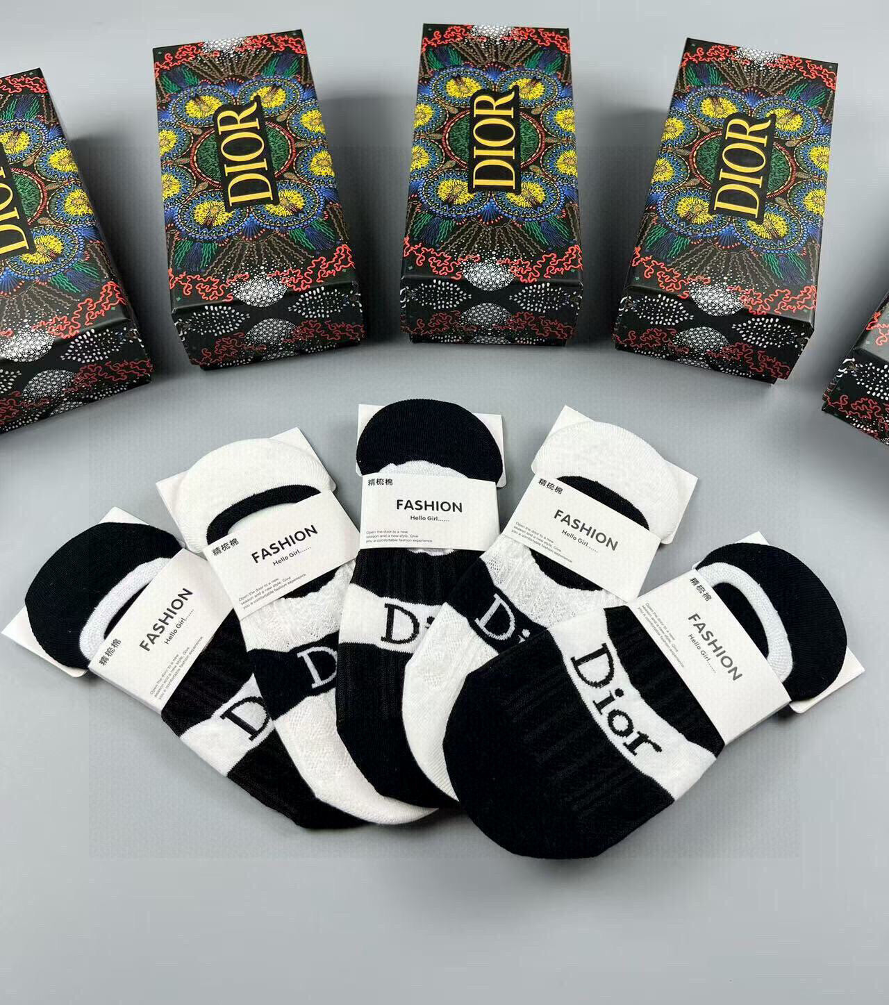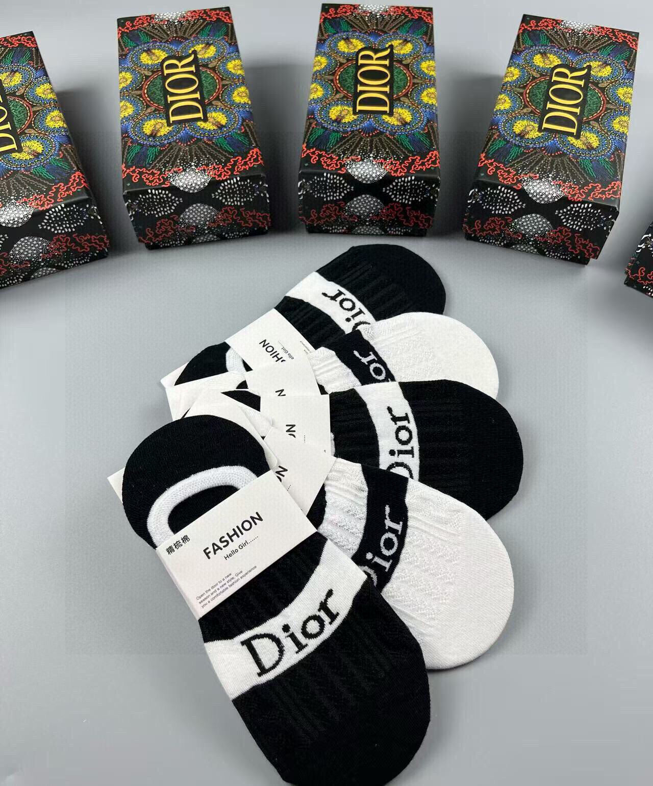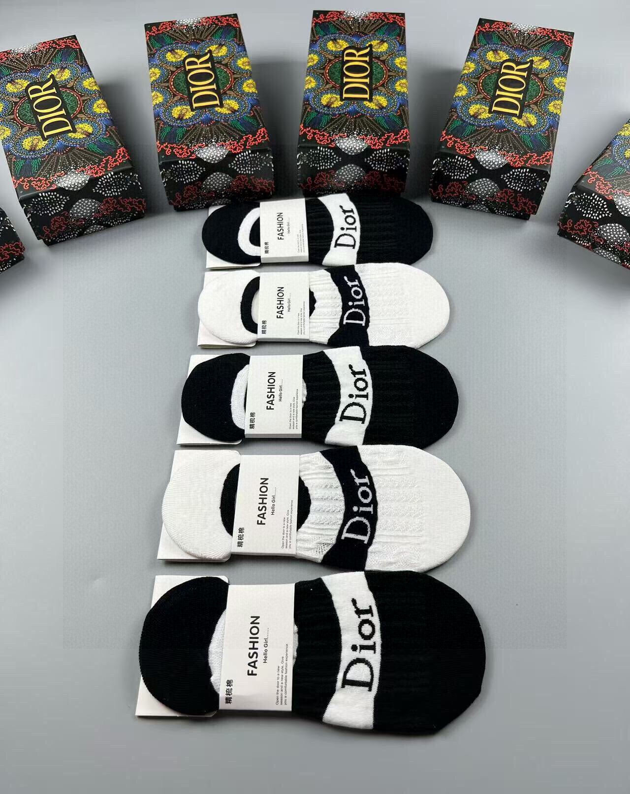 Discover the elegance of Dior with these women's invisible socks, featuring a chic jacquard classic letter logo. Made from high-quality pure cotton, these socks offer exceptional comfort and style. Perfectly designed for effortless pairing with any outfit, this set includes five pairs, making it a must-have addition for fashion enthusiasts. Elevate your wardrobe with these sophisticated invisible socks from a renowned brand.