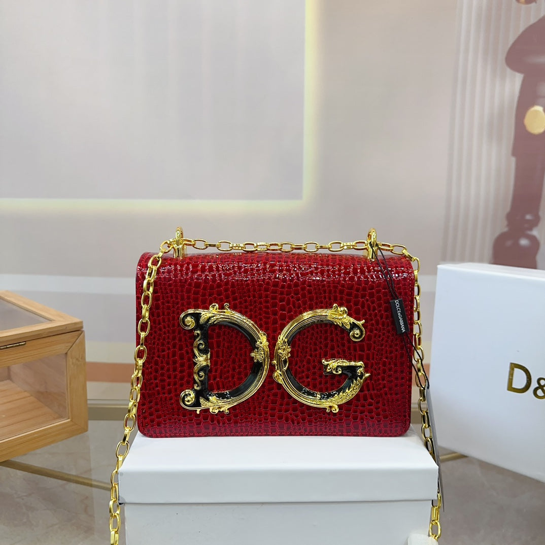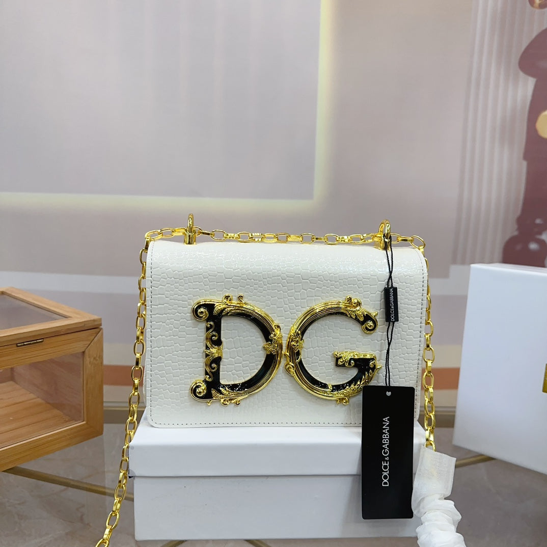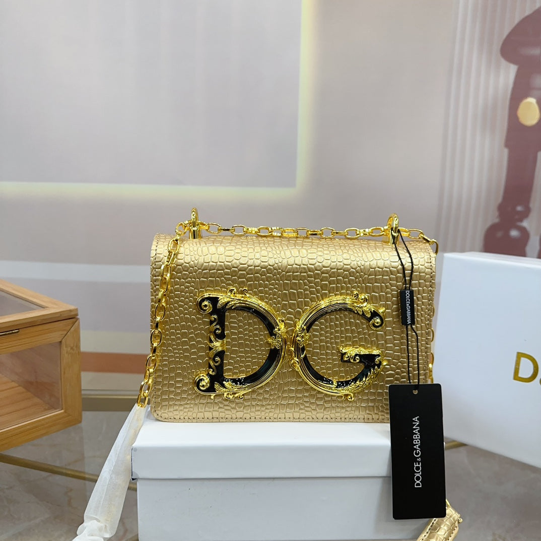 Discover the exquisite Dolce & Gabbana DG Chain Bag, elegantly crafted for the modern woman. With its soft, feminine touch and luxurious feel, this bag is designed to elevate your style and make a statement. Perfectly sized at 21.5 x 14 cm, it offers ample space while maintaining a chic silhouette. Whether you're heading to an event or running errands, this chain bag is your go-to accessory for any occasion. Comes in a stylish box, making it ideal for gifting. Embrace sophistication with Dolce & Gabbana.