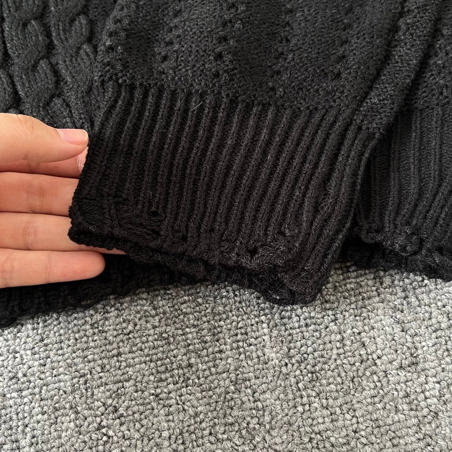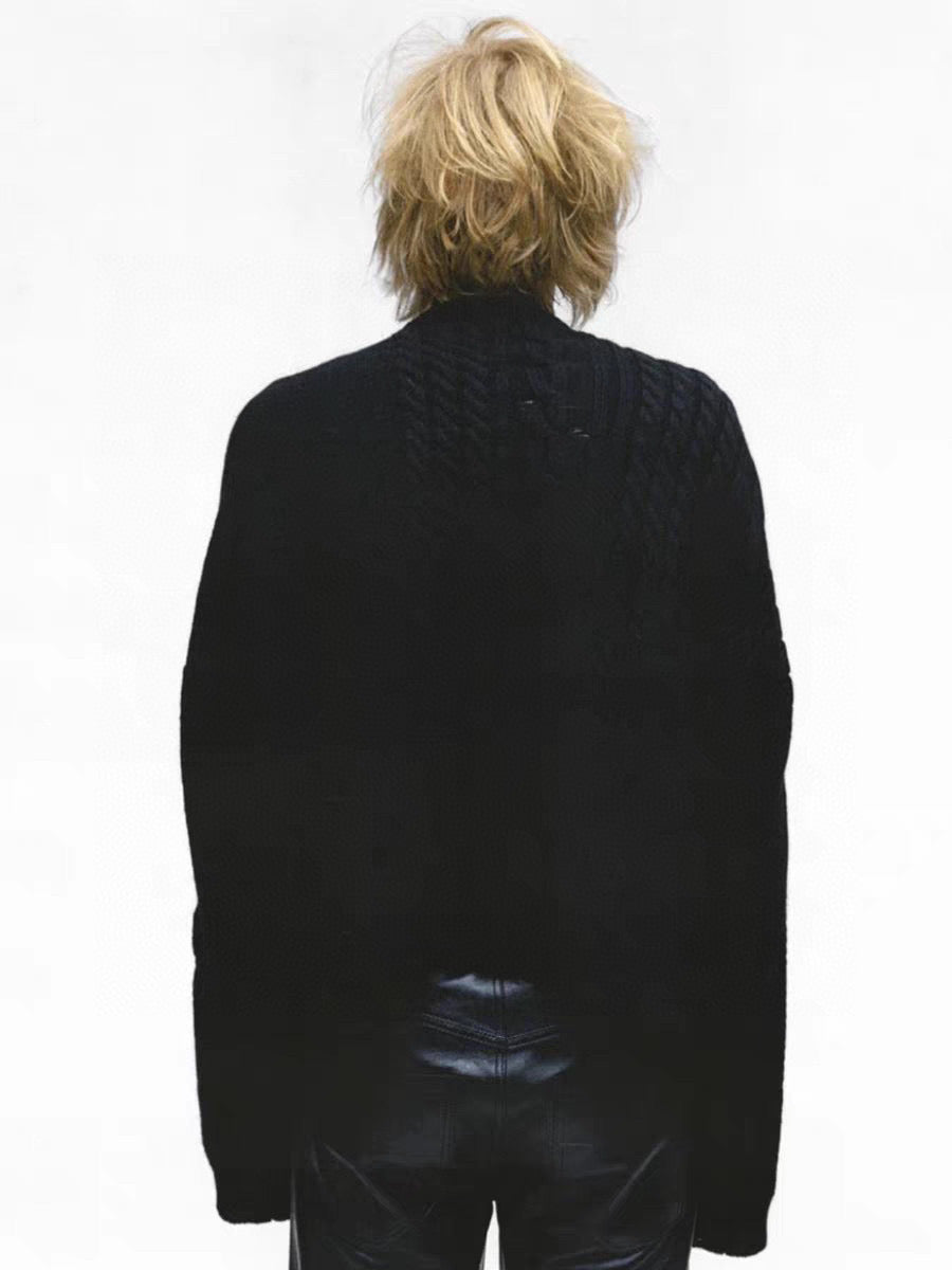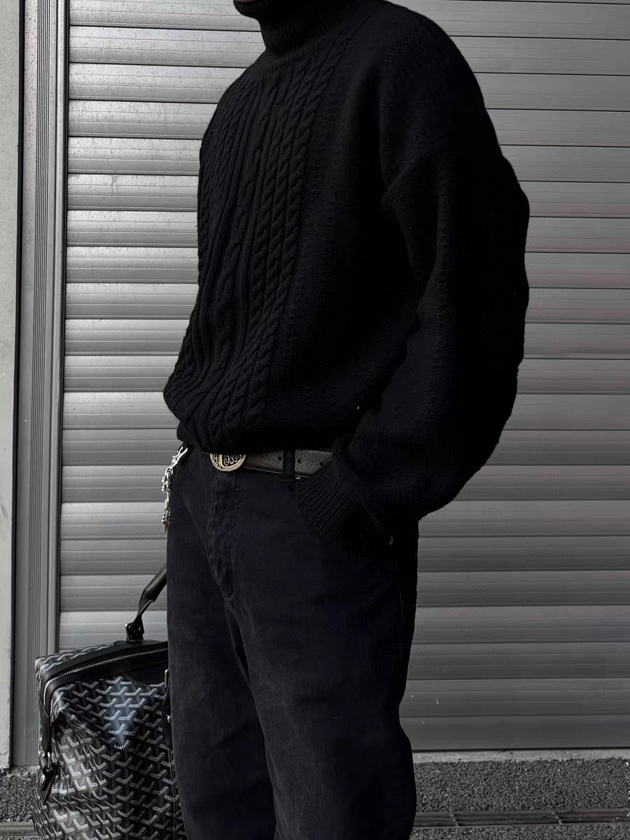 The sweater showcases a trendy twist pattern that enhances its wearability, while its regular fit flatters a variety of body shapes without being boxy. Available in classic black and sizes S-XL.