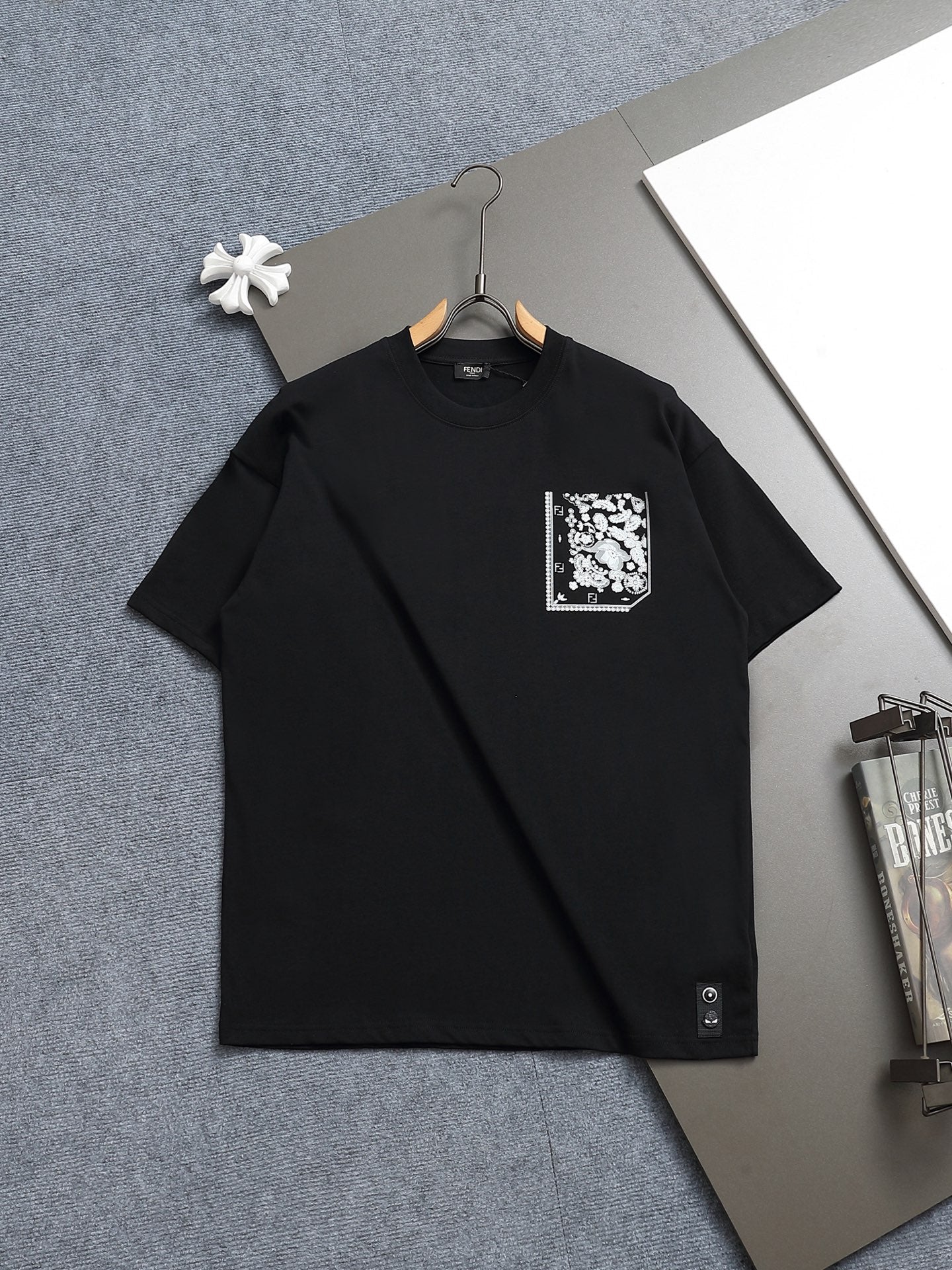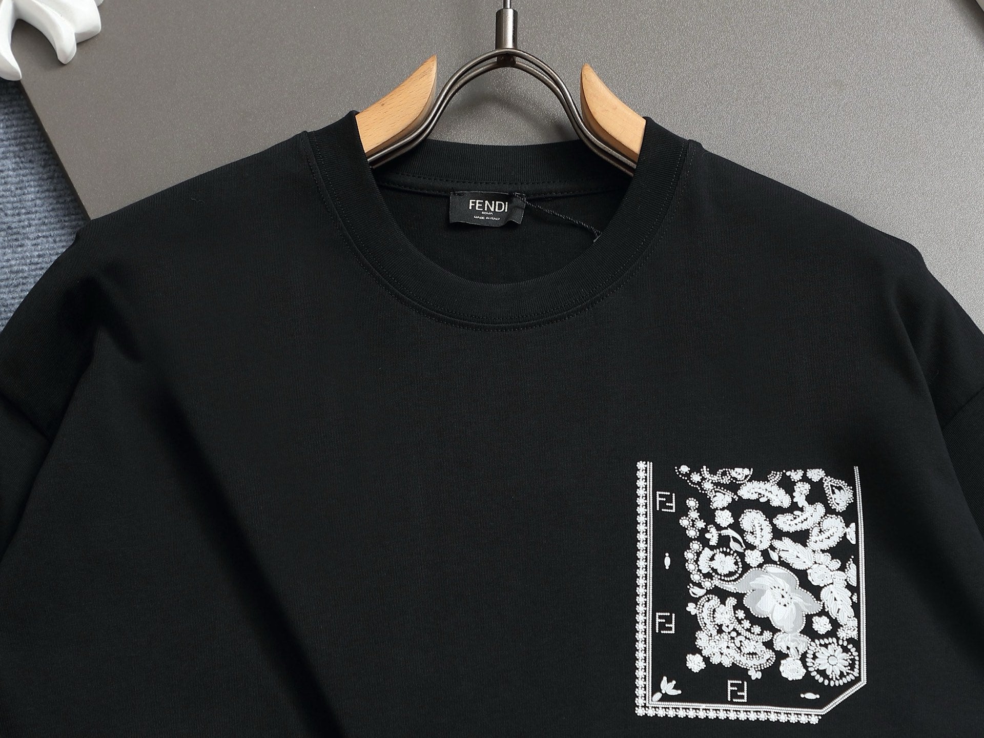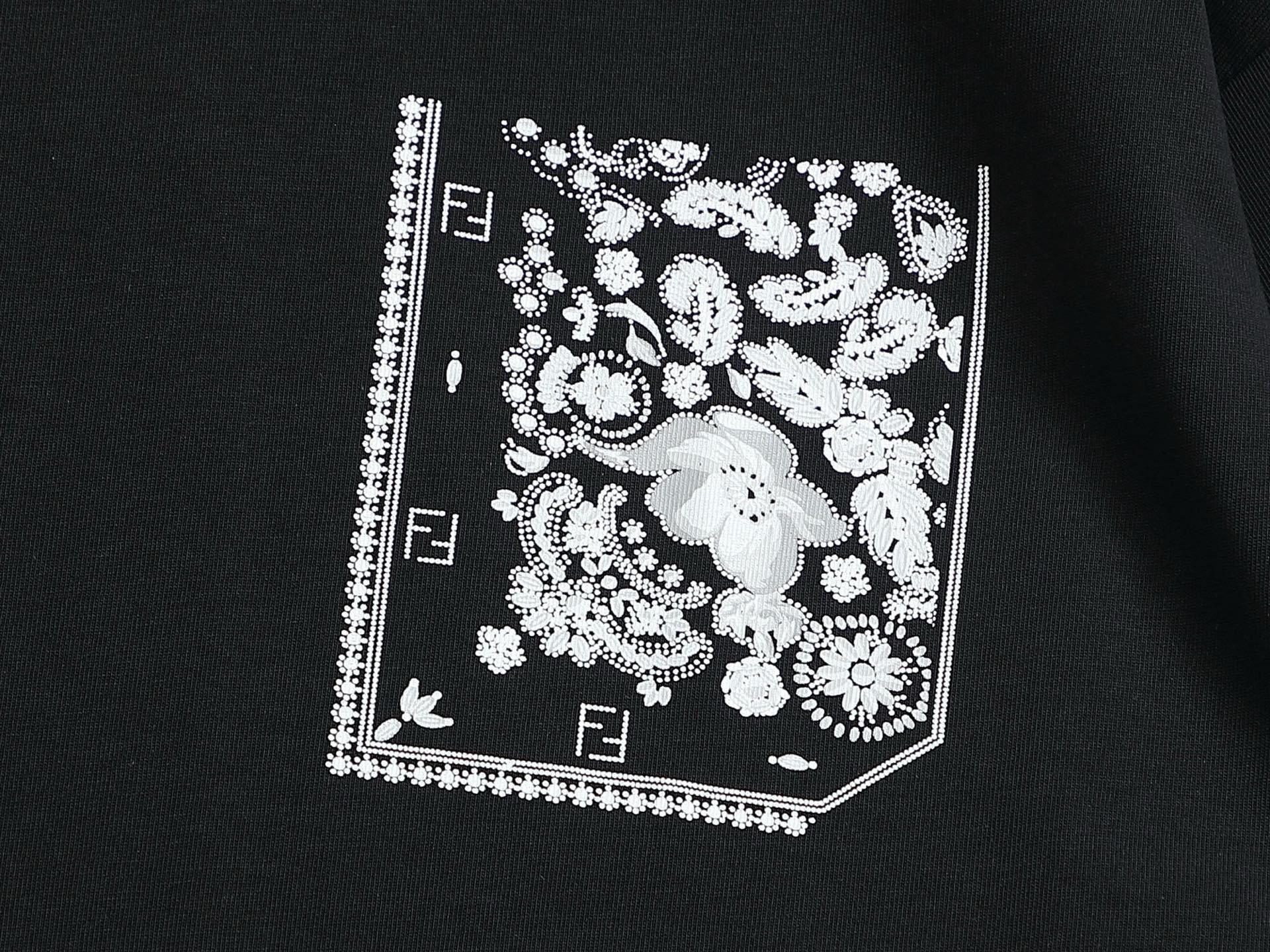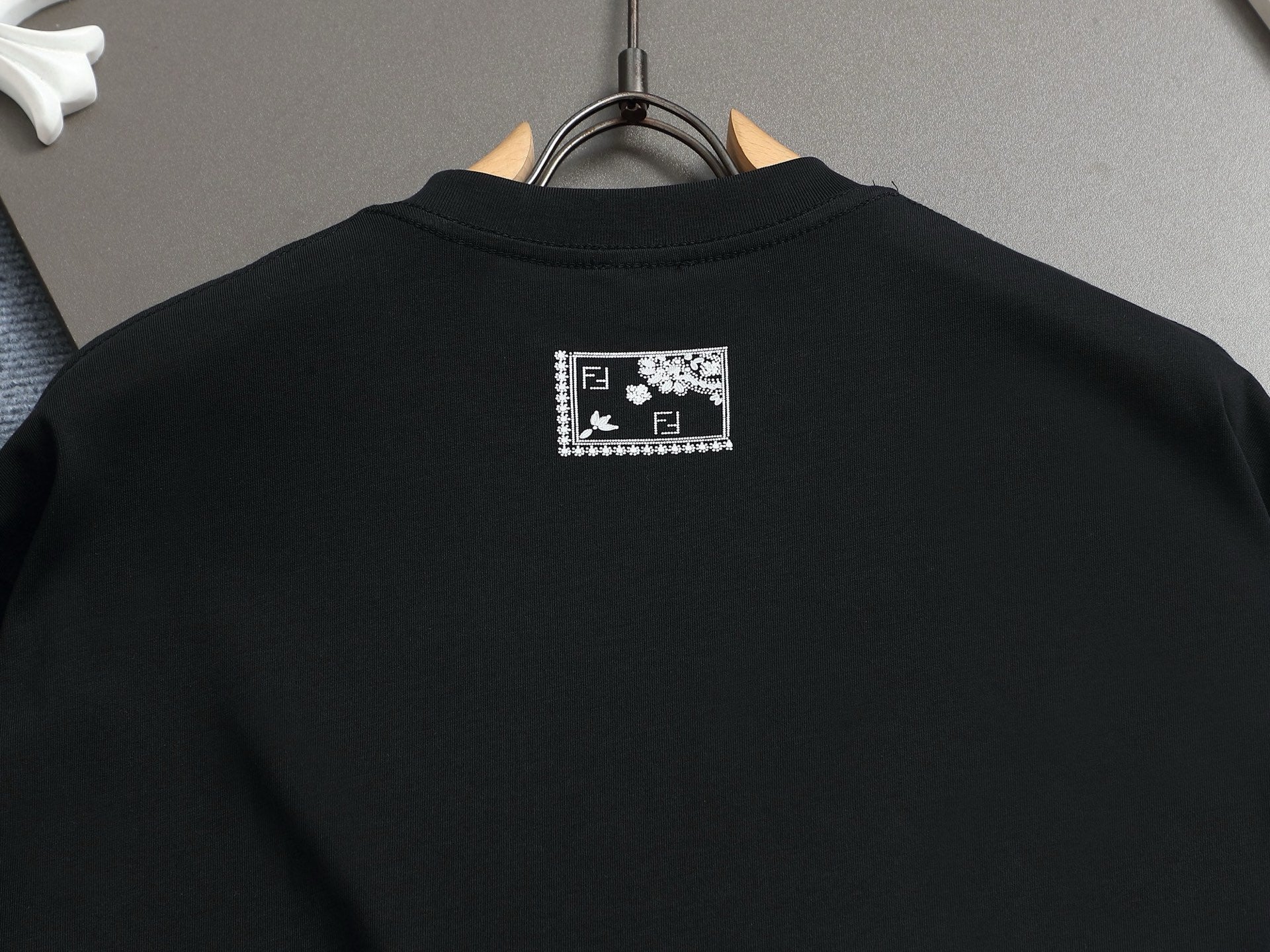 Elevate your wardrobe with the Fendi 260g Round Neck Short-Sleeve T-Shirt, expertly crafted for style and comfort. Featuring a unique fake pocket design adorned with FF petals and fallen leaves, this t-shirt showcases a bold printed logo that embodies a fashionable personality.