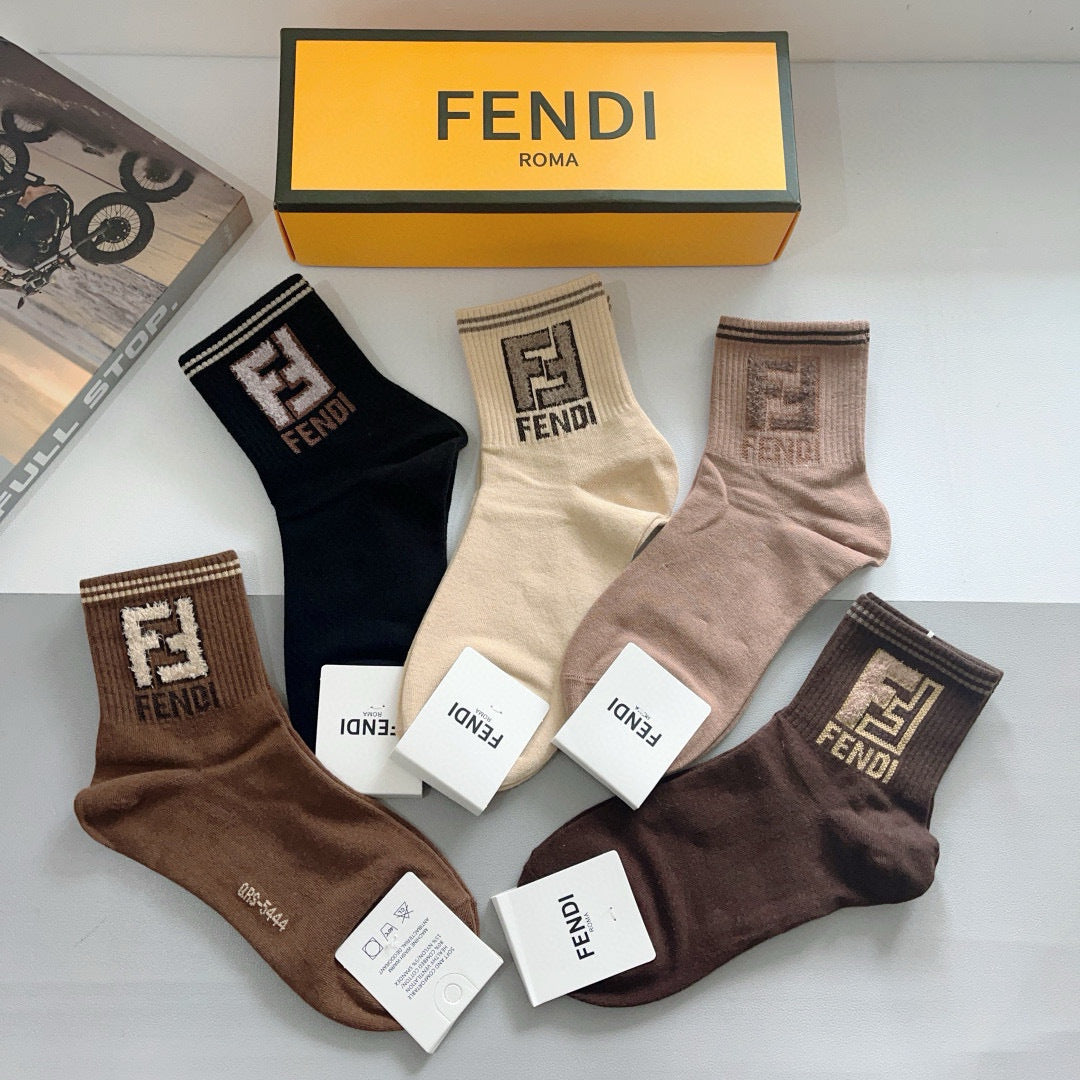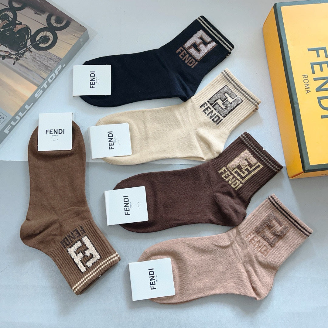 Elevate your style with our FENDI Double F Mid-Calf Socks, featuring the iconic double F logo. Crafted from 100% pure cotton, these socks offer superior softness and breathability, making them both practical and comfortable for everyday wear. Each box includes five pairs, perfect for mixing and matching with your favorite outfits. Embrace the latest street fashion trend with these stylish and versatile mid-calf socks, designed to enhance any wardrobe.
