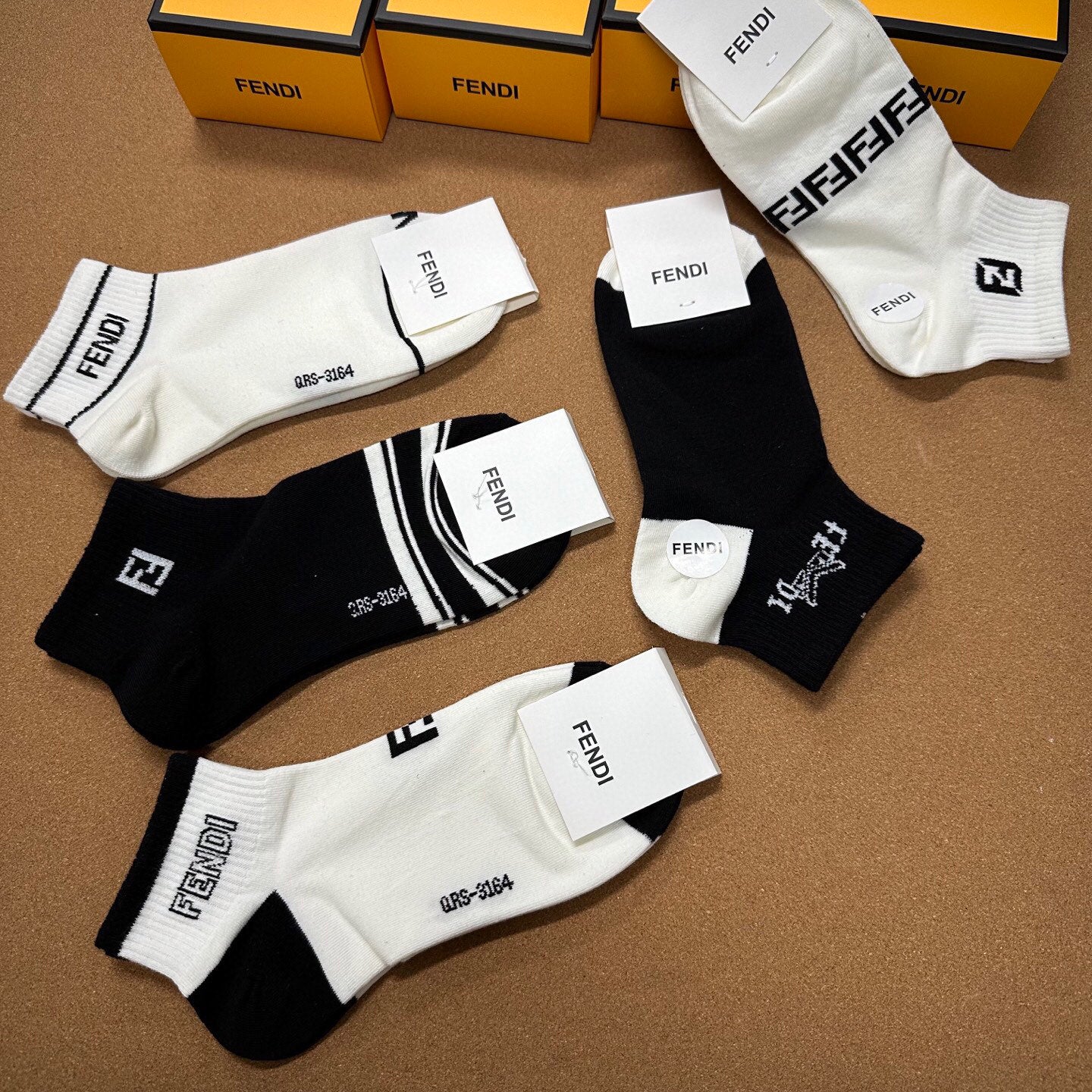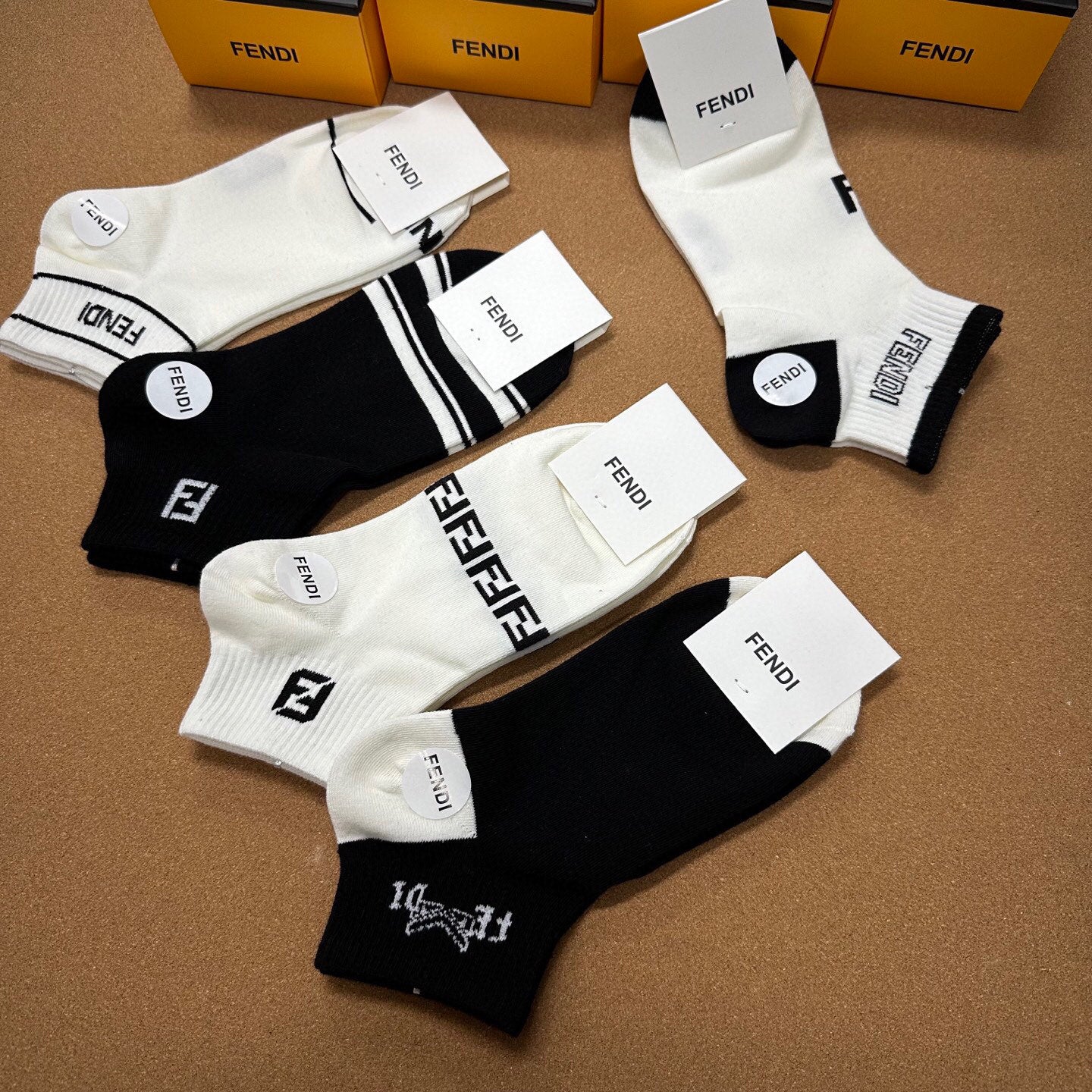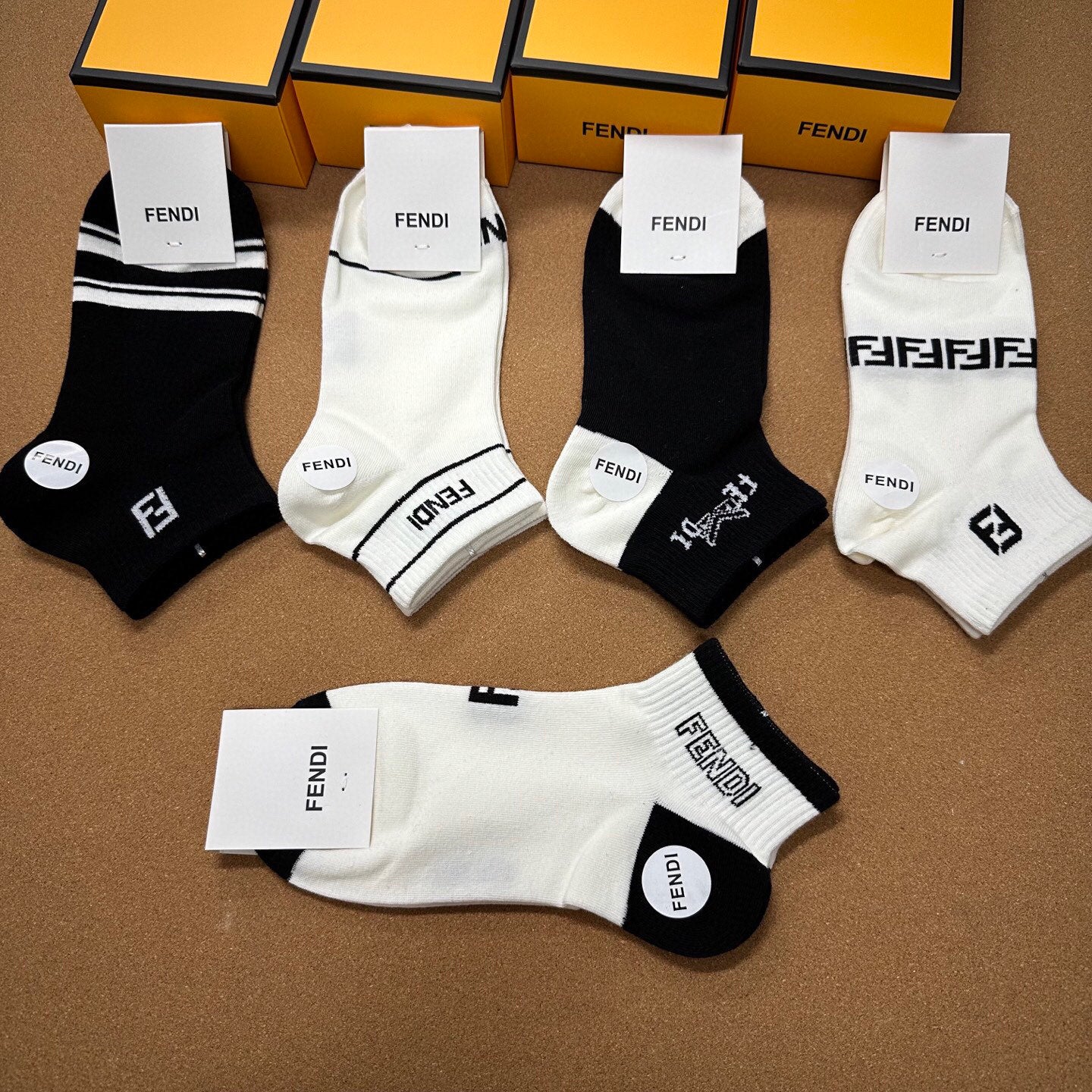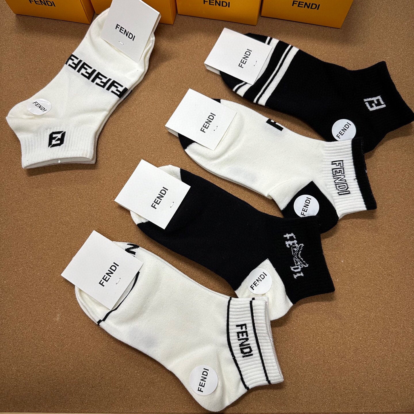 Elevate your accessory game with the Fendi FF Logo Jacquard Cotton Socks. This exclusive set includes five pairs, each featuring the iconic double F logo, crafted from premium pure cotton for ultimate breathability and comfort. A must-have for fashion enthusiasts, these stylish socks are incredibly versatile and perfect for any occasion. Enhance your wardrobe with this luxury essential that perfectly combines comfort and chic design.