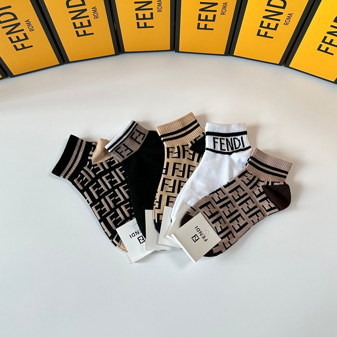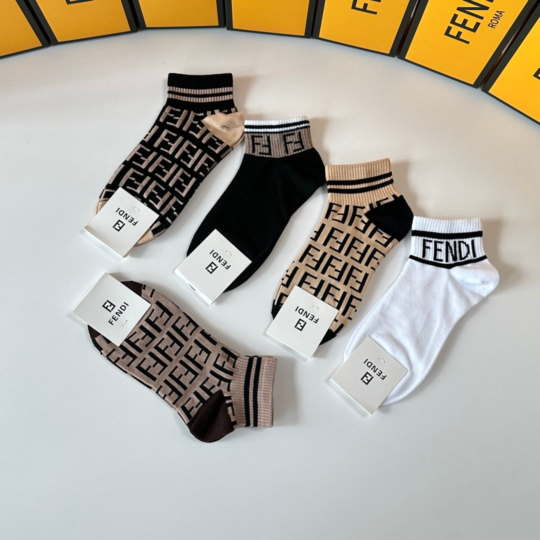 Elevate your fashion game with Fendi's new collection of medium and short tube socks. This stylish set includes five pairs, beautifully packaged for gifting or personal indulgence. Featuring trendy designs perfect for fashion enthusiasts, these socks are versatile and easy to match with any outfit. Step out in comfort and style, and showcase your love for big brands. Ideal for any occasion, these must-have socks are essential for every fashionista's wardrobe.