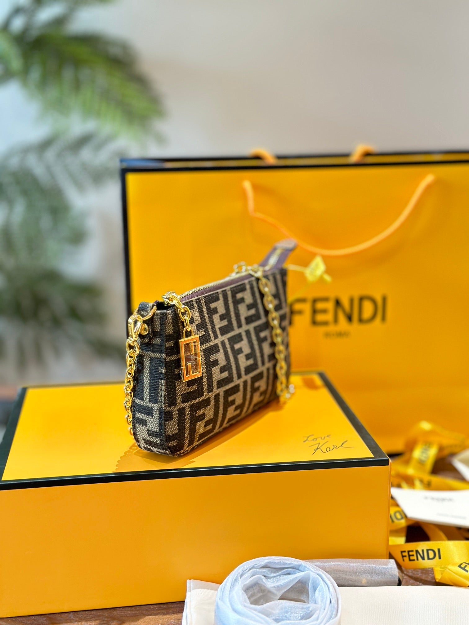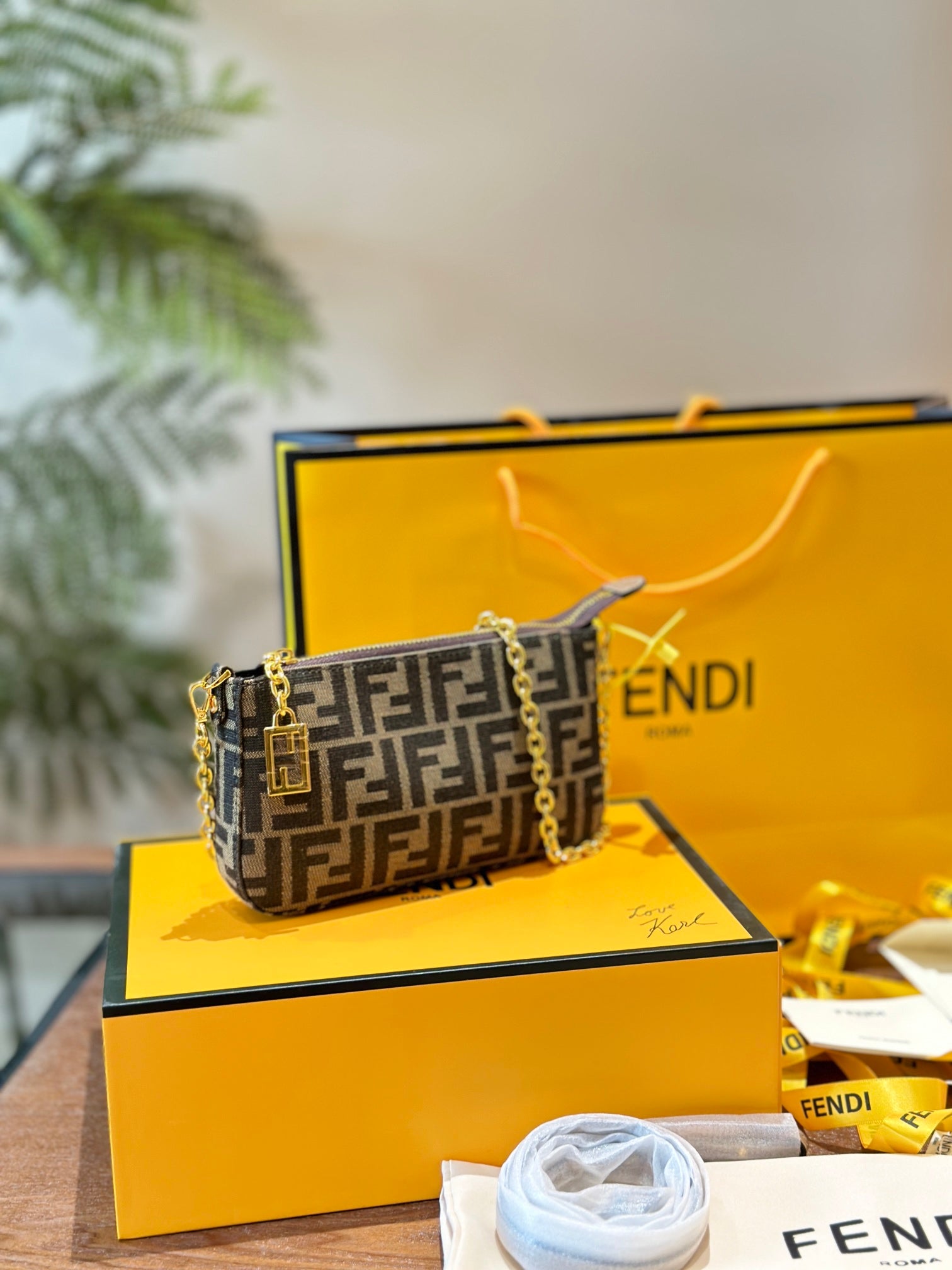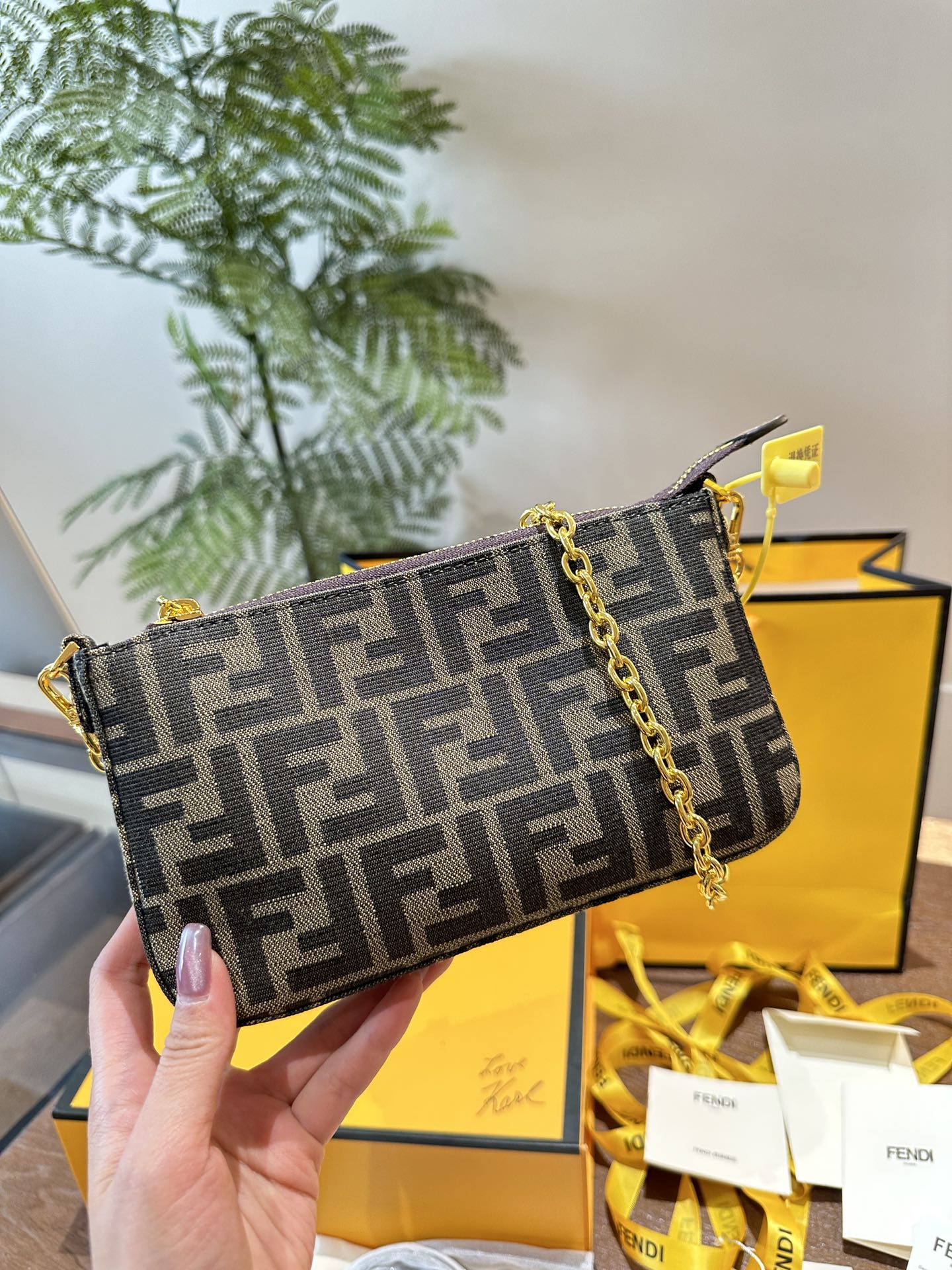 Introducing the Fendi Versatile Cross-Body Bag, a stylish and practical accessory that effortlessly combines fashion with functionality. This affordable piece from Fendi is designed to solve the common issue of traditional bags, featuring a convenient chain for under-the-arm wear and a leather shoulder strap for cross-body use.