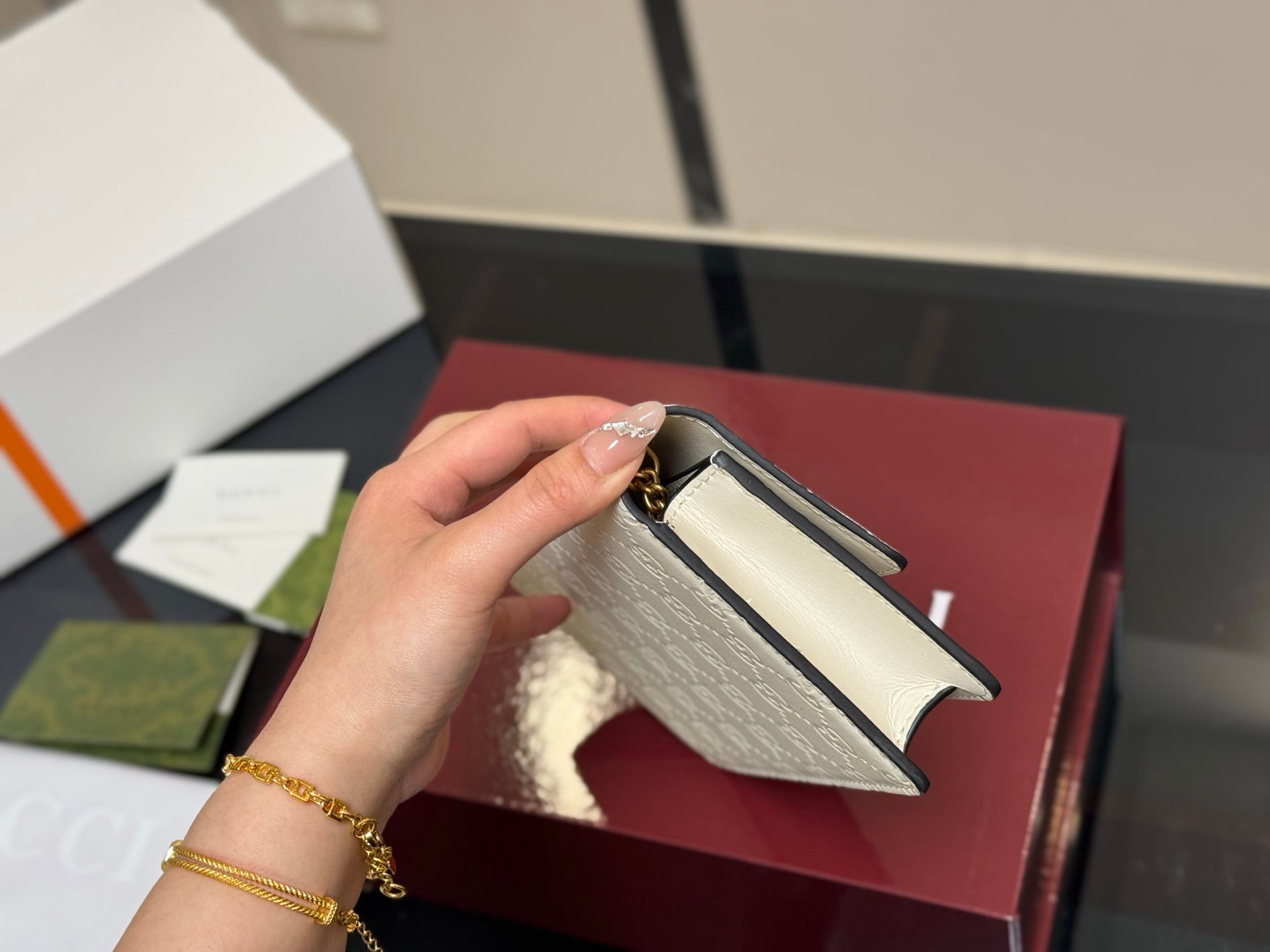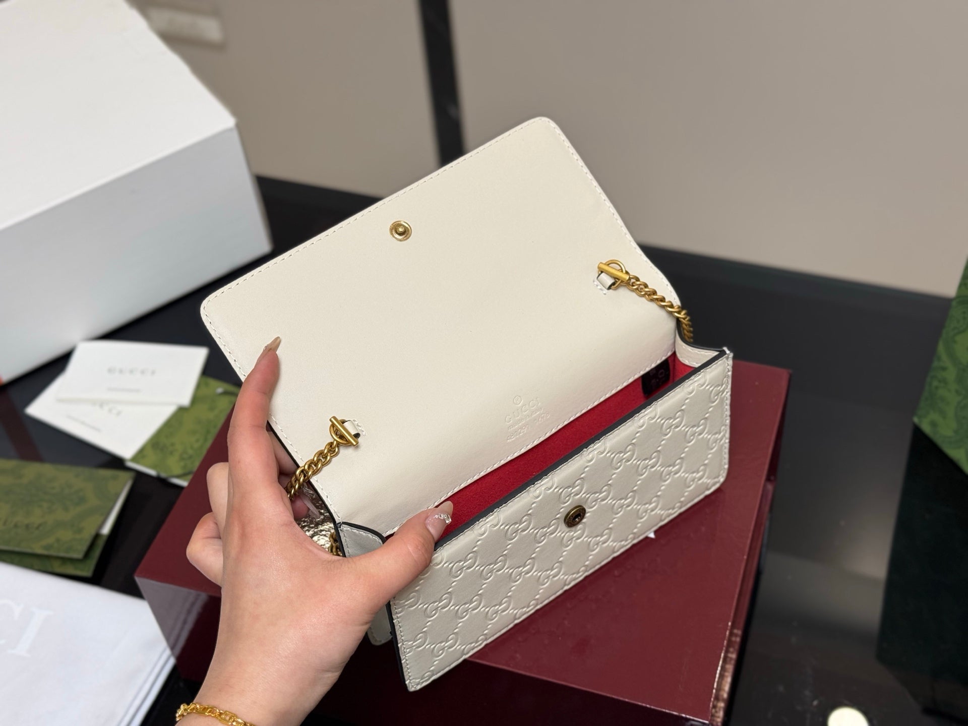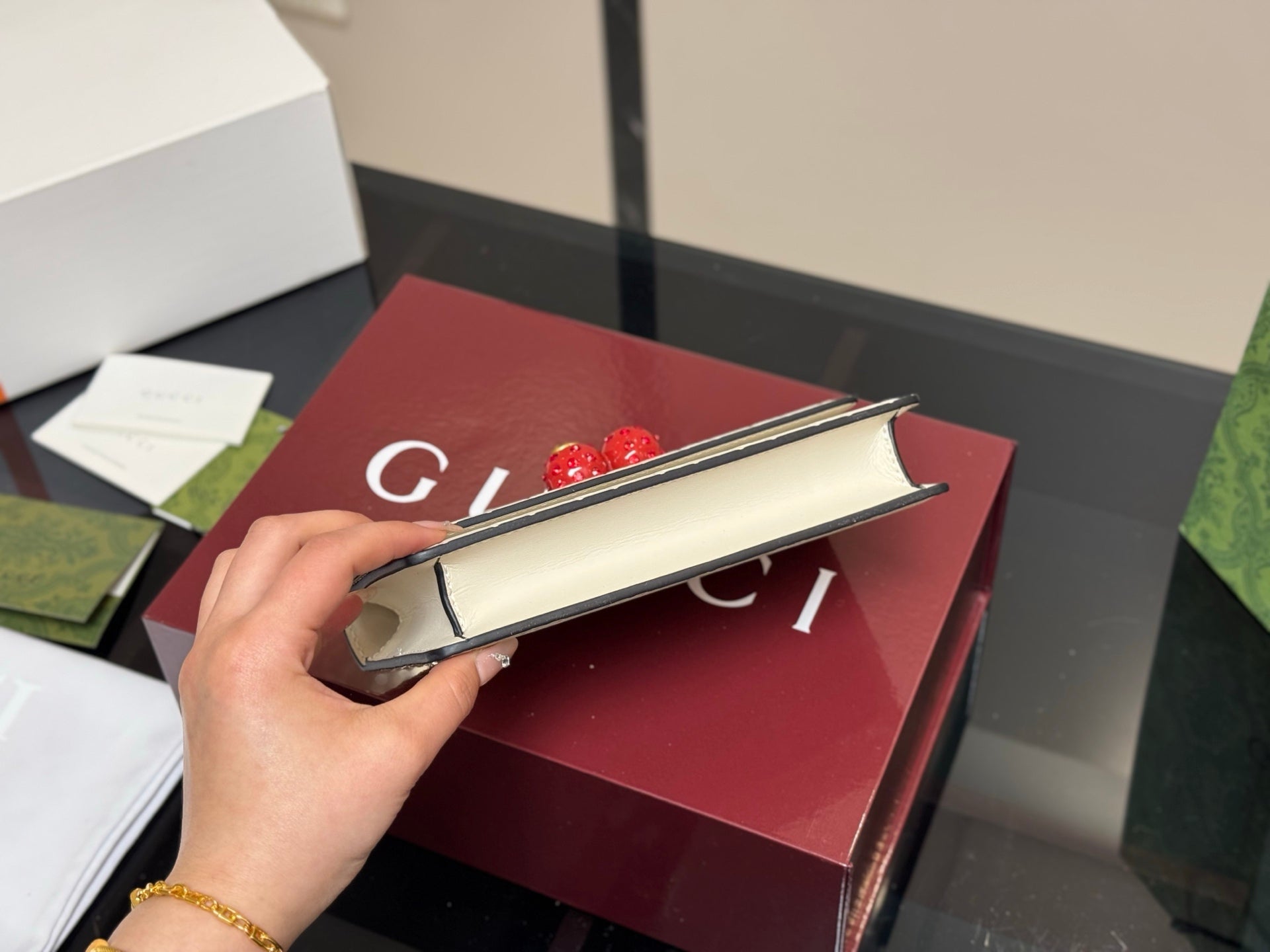 Introducing the GG Cherry Chain Bag, a stylish and charming accessory that captures attention with its delightful cherry design. With dimensions of 20x12cm and 17x10cm, this bag is perfectly sized for carrying your essentials while adding a touch of whimsy to your outfit.