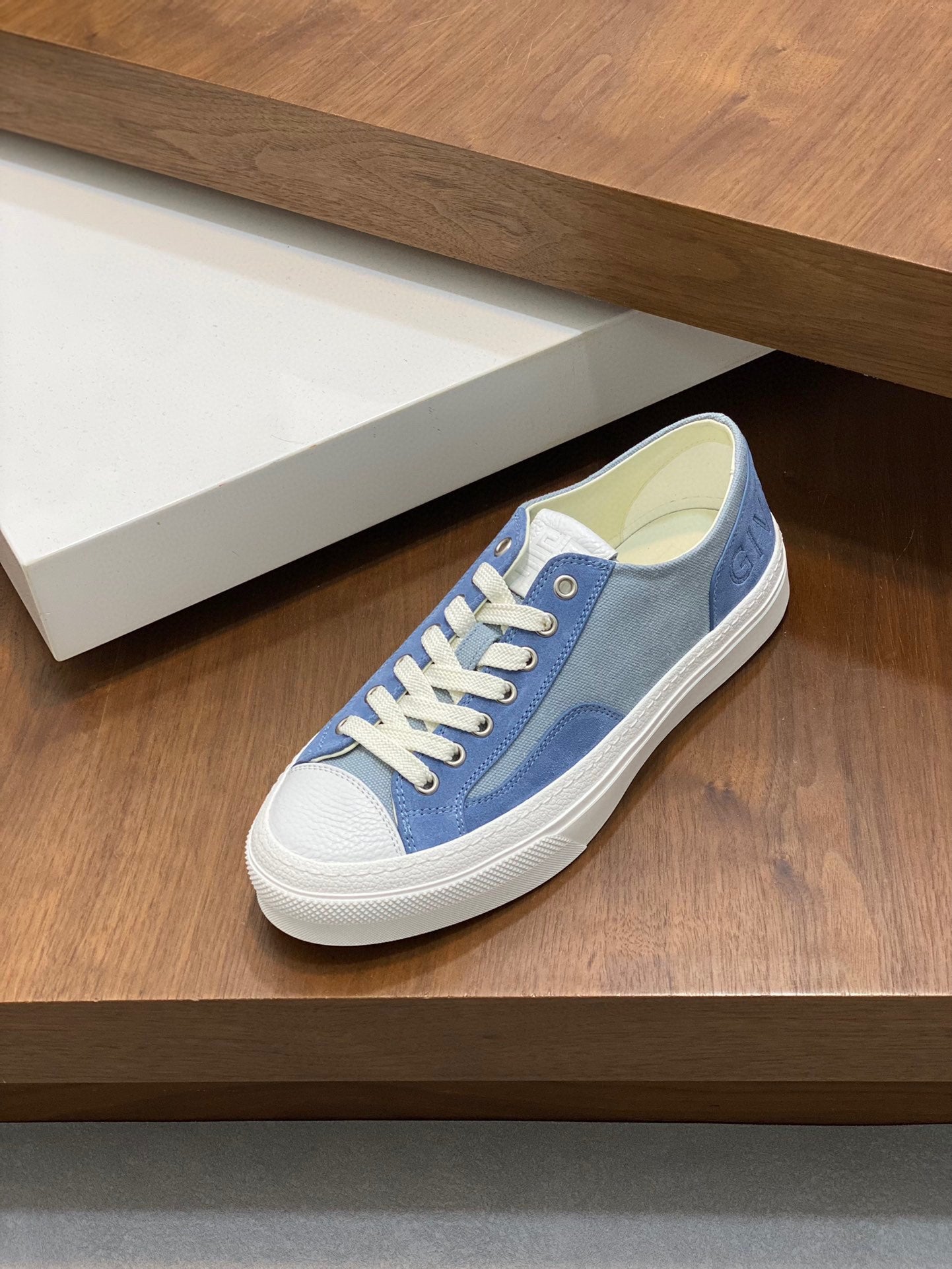 - **Upper:** Made from a combination of top-grade suede calfskin, tumbled calfskin, and branded denim canvas, featuring an embossed logo on the heel for a touch of sophistication.
